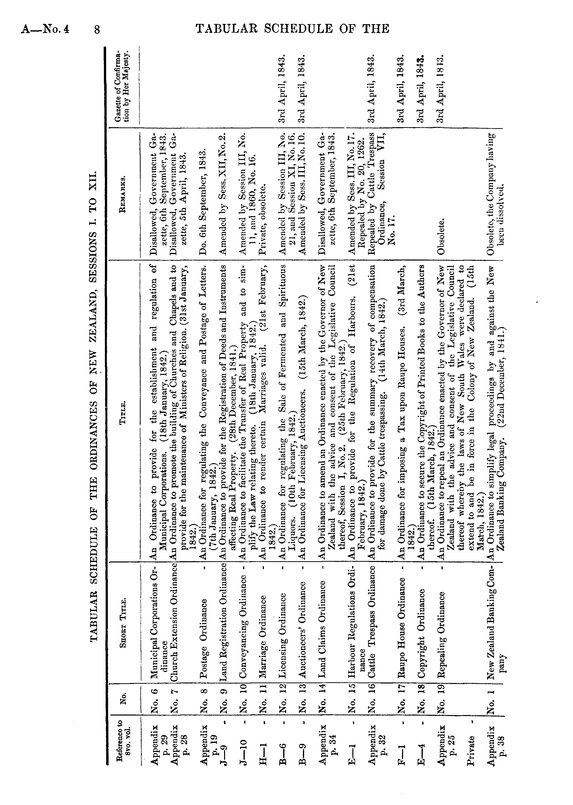 TABULAR SCHEDULE OF THE ORDINANCES OF NEW ZEALAND, SESSIONS I. TO XII. Eeferenco to 8vo. vol. No. Short Title. Title. Remakks. Gazette of Confirmation by Hor Mnjesty. Appendix p. 29 Appendix p. 28 No. 6 No. 7 Municipal Corporations Ordinance Church Extension Ordinance An Ordinance to provide for the establishment and regulation of Municipal Corporations. (18th January, 1842.) An Ordinance to promote the building of Churches and Chapels and to provide for the maintenanco of Ministers of Religion. (31st January, 1842.) An Ordinance for regulating the Conveyance and Postage of Letters. (7th January, 1842.) An Ordinance to provide for the Registration of Deeds and Instruments affecting Real Property. (28th December, 1841.) An Ordinance to facilitate the Transfer of Real Property and to simplify the Law relating thereto. (18th January, 1842.) An Ordinance to render certain Marriages valid. (21st February, 1842.) An Ordinance for regulating the Sale of Fermented and Spirituous Liquors. (IOth February, 1842.) An Ordinance for Licensing Auctioneers. (15th March, 1842.) Disallowed, Government Gazette, 6th September, 1843. Disallowed, Government Gazette, 5th April, 1843. Appendix p. 19 J— 9 No. 8 Postage Ordinance Do. 6th September, 1843. No. 9 Land Registration Ordinance Amended by Sess.XII,No.2. J— 10 - No. 10 Conveyancing Ordinance - Amended by Session III, No. II, and 1860, No. 16. Private, obsolete. H— 1 No. 11 Marriage Ordinance B— 6 No. 12 Licensing Ordinance Amended by Session III, J\o. 21, and Session XI, No. 16. Amended by Sess. Ill, No. 10. 3rd April, 1843. B— 9 No. 13 Auctioneers' Ordinance 3rd April, 1843. Appendix p. 34 No. 14 Land Claims Ordinance An Ordinance to amend an Ordinance enacted by the Governor of New Zealand with the advice and consent of the Legislative Council thereof, Session I, No. 2. (25th February, 1842.) An Ordinance to provide for the Regulation of Harbours. (21st February, 1842.) An Ordinance to provide for the summary recovery of compensation for damage done by Cattle trespassing. (14th March, 1842.) Disallowed, Government Gazette, 6th September, 1843. E— 1 No. 15 Harbour Regulations OrdiAmended by Sess. Ill, No. 17. Repealed by No. 20, 1262. Repealed by Cattle Trespass Ordinance, Session VII, No. 17. 3rd April, 1843. Appendix p. 32 No. 16 nance Cattle Trespass Ordinance F— 1 No. 17 Raupo House Ordinance - An Ordinance for imposing a Tax upon Raupo Houses. (3rd March, 1842.) An Ordinance to secure the Copyright of Printed Books to the Authors thereof. (15th March, 1842.) An Ordinance to repeal an Ordinance enacted by the Governor of New Zealand with the advice and consent of the Legislative Council thereof whereby the laws of New South Wales were declared to extend to and be in force in the Colony of New Zealand. (15th Match, 1842.) An Ordinance to simplify legal proceedings by and against the New Zealand Banking Company. (22nd December, 1841.) 3rd April, 1843. E— 4 No. 18 Copyright Ordinance Obsolete. 3rd April, 1843. Appendix p. 25 No. 19 Repealing Ordinance 3rd April, 1813. Private New Zealand Banking ComObsolete, the Company having been dissolved. Appendix p. 38 No. 1 pany I