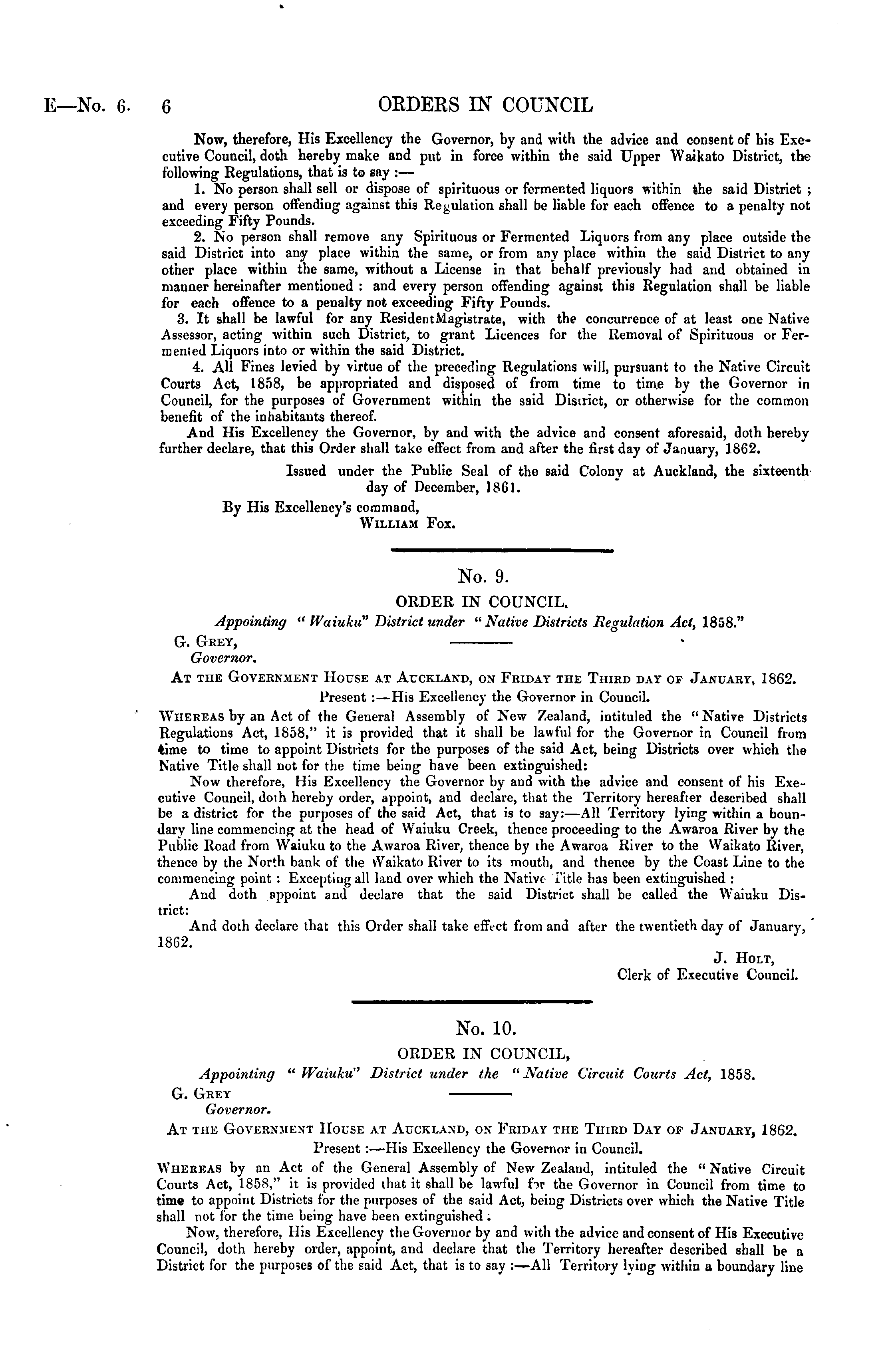 Now, therefore, His Excellency the Governor, by and with the advice and consent of his Executive Council, doth hereby make and put in force within the said Upper Waikato District, the following Regulations, that is to say : — 1. No person shall sell or dispose of spirituous or fermented liquors within the said District ; and every person offending against this Regulation shall be liable for each offence to a penalty not exceeding Fifty Pounds. 2. No person shall remove any Spirituous or Fermented Liquors from any place outside the said District into any place within the same, or from any place within the said District to any other place within the same, without a License in that behalf previously had and obtained in manner hereinafter mentioned : and every person offending against this Regulation shall be liable for each offence to a penalty not exceeding Fifty Pounds. 3. It shall be lawful for any ResidentMagistrate, with the concurrence of at least one Native Assessor, acting within such District, to grant Licences for the Removal of Spirituous or Fermented Liquors into or within the said District. 4. AH Fines levied by virtue of the preceding Regulations will, pursuant to the Native Circuit Courts Act, 1858, be appropriated and disposed of from time to time by the Governor in Council, for the purposes of Government within the said District, or otherwise for the common benefit of the inhabitants thereof. And His Excellency the Governor, by and with the advice and consent aforesaid, doth hereby further declare, that this Order shall take effect from and after the first day of January, 1862. Issued under the Public Seal of the said Colony at Auckland, the sixteenth day of December, 1861. By His Excellency's command, William Fox.
