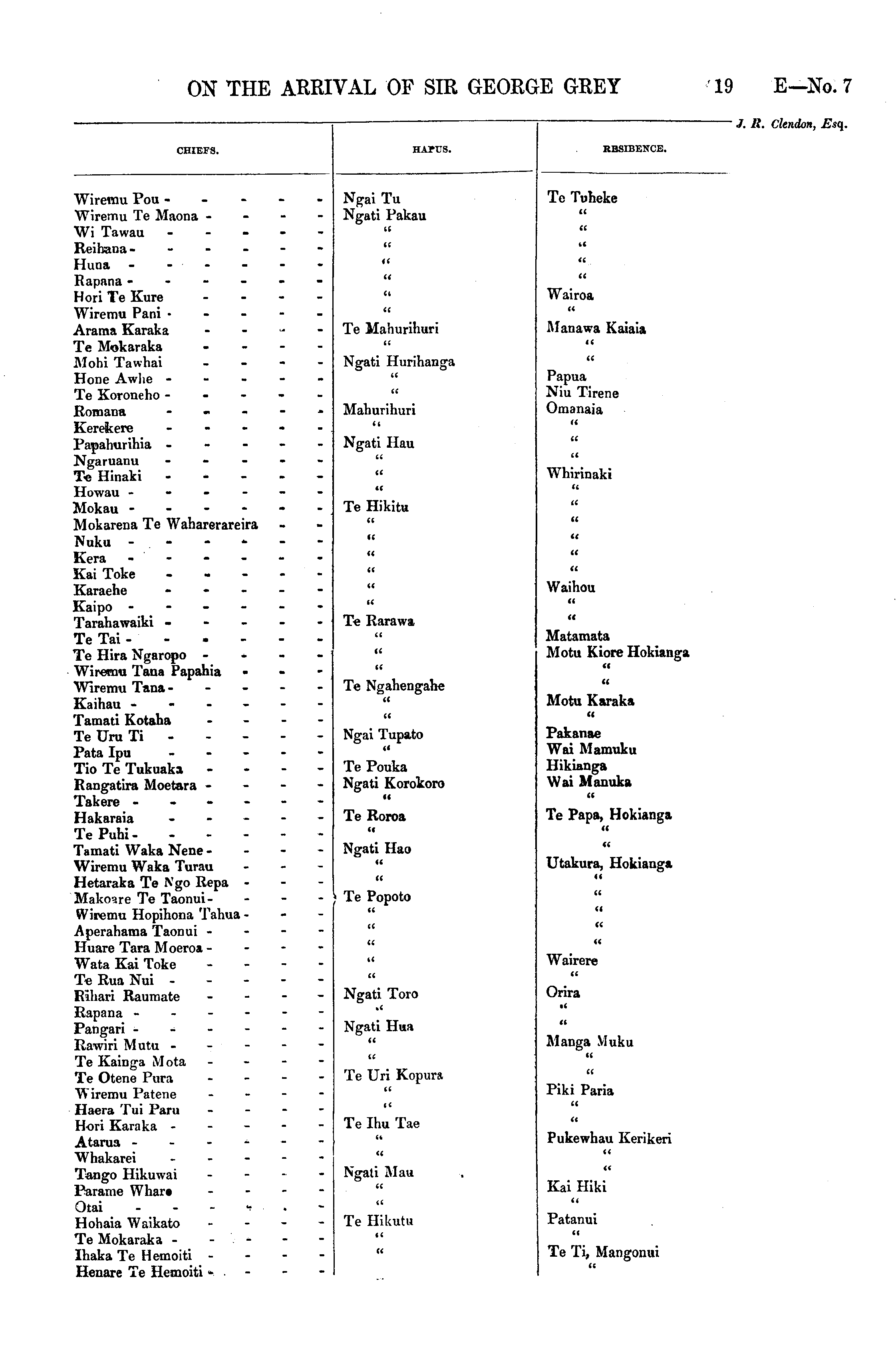 CHIEFS. HAPUS. RESIBENCE. Wiremu Pou - Wiremu Te Maona - Wi Tawau - Reihana- - Huna - - - - Rapana - - - - Hori Te Kure Wiremu Pani • Arama Karaka Te Mokaraka Mohi Tawhai Hone Awhe - - - Te Koroneho - Romana ... Kerekere ... Papahurihia - Ngaruanu ... Te Hinaki - Howau - - - - Mokau - - - - Mokarena Te Waharerareira Nuku - Kera - - - - Kai Toke - Karaehe ... Kaipo - Tarahawaiki - Te Tai - Te Hira Ngaropo - Wiremu Tana Papahia Wiremu Tana - - - Kaihau - - - - Tamati Kotaha Te Uru Ti - Pata Ipu ... Tio Te Tukuaka - Rangatira Moetara - Takere - Hakaraia . » TePuhiTamati Waka Nene - Wiremu Waka Turau Hetaraka Te Ngo Repa - Ifakone Te TaonuiWiremu Hopihona Tahua - Aperahama Taonui - Huare Tara Moeroa - Wata Kai Toke Te Rua Nui - Rihari Raumate Rapana - - - - Pangari - - - - Rawiri Mutu - Te Kainga Mota Te Otene Pura Wiremu Patene Haera Tui Paru Hori Karaka - - - Atarua - - - - Whakarei - - - Tango Hikuwai Parame Whar« Otai - Hohaia Waikato Te Mokaraka - - - Ihaka Te Hemoiti - Henare Te Hemoiti - ■ Ngai Tu Ngati Pakau it Te Tuheke ff ft a it tt fi a ii a Wairoa a tt Te Mahurihuri Manawa Kaiaia it Ngati Hurihanga a tt Papua Niu Tirene Omanaia tt tt Mahurihuri Ngati Hau a tf tt tt Whirinaki tt Te Hikitu ff tt U 14 u ff tt ff tt ff Waihou tt ff T-e Rarawa tt tt tt Matamata Motu Kiore Hokianga tt ft Te Ngahengahe a Motu Karaka tt tt Ngai Tupato tt Pakanae Wai Mamuku Hikianga Wai Manuka tt Te Pouka Ngati Korokoro Te Roroa f< Te Papa, Hokianga te Ngati Hao a Utakura, Hokianga a a Te Popoto ff tt a ft tt ff tt tf Wairere ff tt Ngati Toro wt Orira tt Ngati Hua tt tt Manga VIuku tf tt Te Uri Kopura tt Piki Paria tt Te Ihu Tae ft te Pukewhau Kerikeri t f ff Ngati Mau tt tt Kai Hiki ff tt Te Hikutu Patanui tt a Te Ti, Mangonui tt