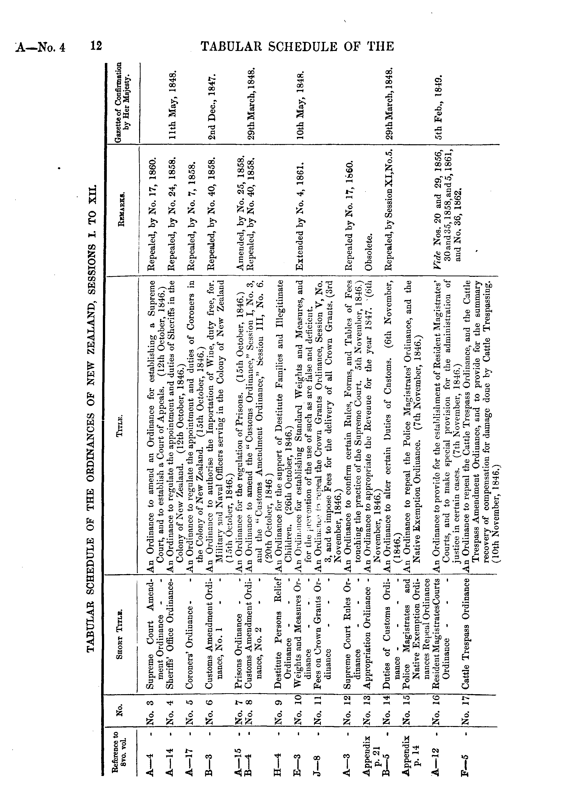 TABULAR SCHEDULE OF THE ORDINANCES OF NEW ZEALAND, SESSIONS I. TO XII. Reference to 8vo. voL No. Shokt Title. TlTLK. Remarks. Gazette of Confirmation by Her Majesty. A— 4 No. 3 Supreme Court Amendment Ordinance Sheriffs' Office OrdinanceAn Ordinance to amend an Ordinance for establishing a Supreme Court, and to establish a Court of Appeals. (12th October, 1846.) An Ordinance to regulate the appointment and duties of Sheriffs in the Colony of New Zealand. (12th October, 1846.) An Ordinance to regulate the appointment and duties of Coroners in the Colony of New Zealand. (15 th October, 1846.) An Ordinance to authorise the Importation of Wine, duty free, for. Military and Naval Officers serving in the Colony of New Zealand (15th October, 1846.) An Ordinance for the regulation of Prisons. (15th October, 1846.) An Ordinance to amend the " Customs Ordinance," Session I, No. 3, and the "Customs Amendment Ordinance," Session III, No. 6. (20th October, 1846 ) An Ordinance for the support of Destitute Families and Illegitimate Children. (26th October, 1846.) An Oidiu.uice for establishing Standard Weights and Measures, and for the prevention of the use of such as are false and deficient. An Ordinance to repeal the Crown Grants Ordinance, Session V, No. 3, and to impose Fees for the delivery of all Crown Grants. (3rd November, 1846.) An Ordinance to confirm certain Rules, Forms, and Tables of Fees touching the practice of the Supreme Court. 5th November, 1846.) An Ordinance to appropriate the Revenue for the year 1847. "(6th November, 1846.) An Ordinance to alter certain Duties of Cnstoms. (6th November (1846.) An Ordinance to repeal the Police Magistrates' Ordinance, and the Native Exemption Ordinance. (7th November, 1846.) Repealed, by No. 17, 1860. A— 14 - No. 4 Repealed, by No. 24, 1858. 11th May, 1848. A— 17 - No. 5 Coroners' Ordinance - Repealed, by No. 7, 1858. B— 3 No. 6 Customs Amendment Ordinance, No. 1 Repealed, by No. 40, 1858. 2nd Dec., 1847. A— 15 - B— 4 No. 7 No. 8 Prisons Ordinance - Customs Amendment Ordinance, No. 2 - - Amended, by No. 25, 1858. Repealed, by No. 40, 1858. 29th March, 1848. H— 4 No. 9 Destitute Persons Eelief Ordinance - Weights and Measures Ordinance Fees on Crown Grants Ordinance ... E— 3 No. 10 Extended by No. 4, 1861. 10th May, 1848. J— 8 No. 11 A— 3 No. 12 Supreme Court Eules Ordinance ... Appropriation Ordinance - Repealed by No. 17, I860. Appendix p. 21 B— 5 No. 13 No. 14 Duties of Customs OrdiObsolete. Repealed, by Session XI,No.5. 29th March, 1848. Appendix p. 14 No. 15 No. 16 nance - - - - Police Magistrates and Native Exemption Ordinances Repeal Ordinance Resident MagistratesCourts Ordinance - Vide Nos. 20 and 29, 1856, 30and35,1858,aud5, 1861, and No, 36, 1862. 5th Feb., 1849. A— 12 - An Ordinance to provide for the establishment of Resident Magistrates' Courts, and to make special provision for the administration of justice in certain cases. (7th November, 1846.) An Ordinance to repeal the Cattle Trespass Ordinance, and the Cattle Trespass Amendment Ordinance, and to provide for the summary recovery of compensation for damage done by Cattle Trespassing. (10th November, 1846.) F— 5 No. 17 Cattle Trespass Ordinance >