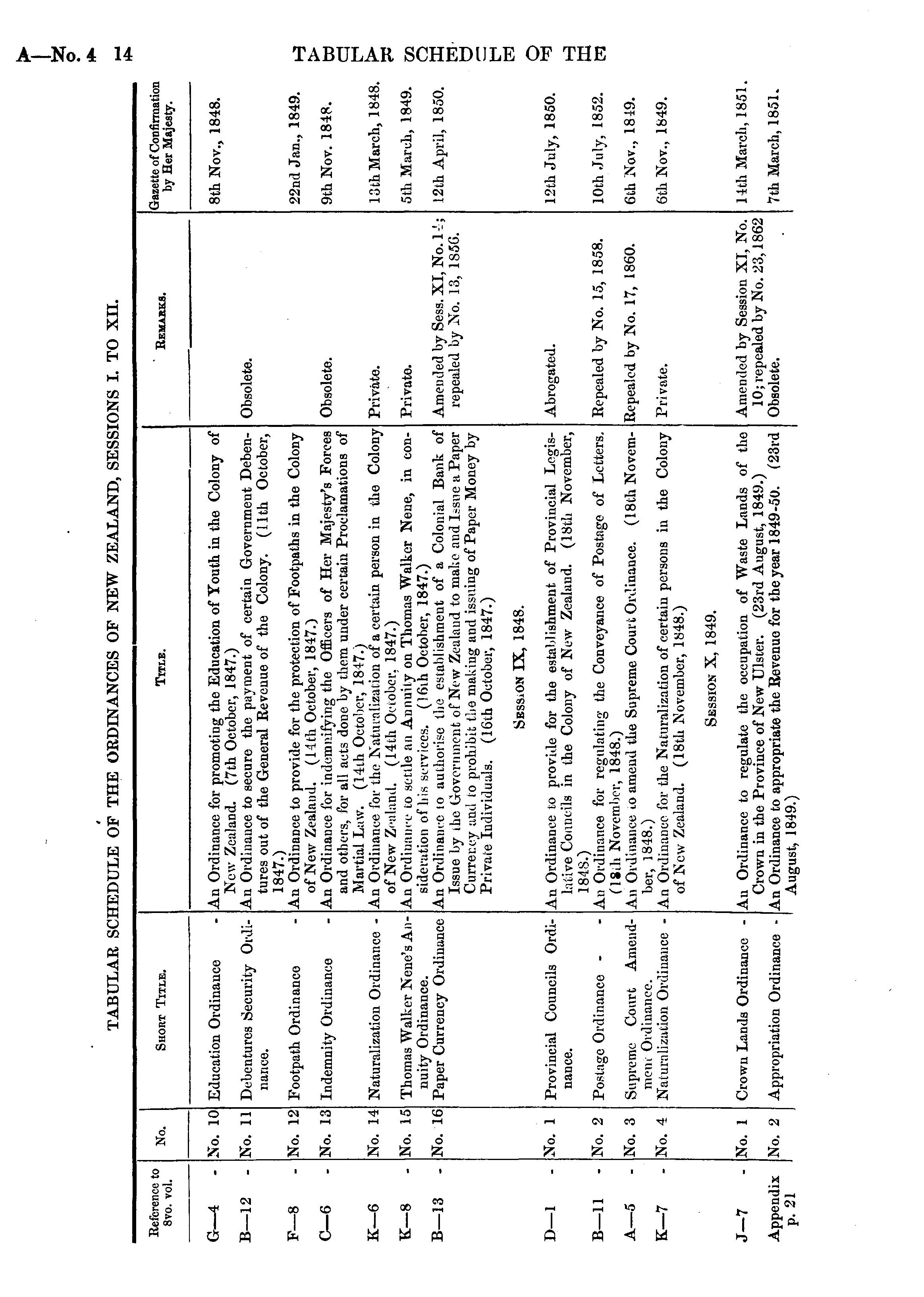 i TABULAR SCHEDULE OF THE ORDINANCES OF NEW ZEALAND, SESSIONS I. TO XII. Reference to 8vo. vol. No. Short Title. Title. Remarks. Gazette of Confirmation by Her Majesty. G— 4 B— 12 ■ F— 8 C— 6 K— 6 No. 10 No. 11 No. 12 No. 13 No. 14 Education Ordinance Debentures Security Ordinance. Footpath Ordinance Indemnity Ordinance Naturalization Ordinance - Au Ordinance for promoting the Education of Youth in the Colony of New Zealand. (7th October, 1847.) An Ordinance to secure the payment of certain Government Debentures out of the General Keveuue of the Colony. (11th October, 1847.) Au Ordinance to provide for the protection of Footpaths in the Colony of New Zealand. (14th October, 18470 An Ordinance for indemnifying the Officers of Her Majesty's Forces and others, for all acts doue by them under certain Proclamations of Martial Law. (14ih October, 1847.) An Ordinance for the Naturalization of a certain person in the Colony of New Zealand. (14th October, 1847.) An Ordinance to settle an Annuity on Thomas Walker Nene, in consideration of his services. (16th October, 1847.) Au Ordinance to auihorise the establishment of a Colonial Bank of Issue by ihe Government of New Zealand to make and I.-sne a Paper Currency and to prohibit (lie making and issuing of Paper Money by Private individuals. (16th October, 1847.) Obsolete. Obsolete. Private. 8th Nov., 1848. 22nd Jan., 1849. 9th Nov. 1848. 13 th March, 1848. K— 8 No. 15 Thomas Walker Neuc's Annuity Ordinance. Paper Currency Ordinance Private 5th March, 1849. B— 13 No. 16 Amended by Sess. XI, No. 1-!; repealed by No. 13, 185G. 12th April, 1850. D— 1 Provincial Councils OrdiSession IX, 1848. An Ordinance to provide for the establishment of Provincial Legislative Councils in the Colony of New Zealand. (18tli November, 184S.) An Ordinance for regulating the Conveyance of Postage of Letters, (18th November, 1848.) An Ordinance lo amend the Supreme Court Ordinance. (18th November, 1848.) An Ordinance for the Naturalization of certain persons in the Colony of New Zealand. (18th November, 1848.) Abrogated. 12th July, 1850. No. 1 nance. B— 11 No. 2 Postage Ordinance - Repealed by No. 15, 1858. 10th July, 1852. A— 5 No. 3 Supreme Court Amendment Ordinance. Naturalization Ordinance - Repealed by No. 17, 1860. 6th Nov., 1819. K— 7 No. 4 Private. 6th Nov., 1849. J— 7 Crown Lauds Ordinance - Session X, 1849. Amended by Session XI, No. 10; repealed by No. 23,1862 Obsolete. 14th March, 1851. Appendix p. 21 No. 1 No. 2 Appropriation Ordinance • Au Ordinance to regulate the occupation of Waste Lands of tho Crown in tho Province of New Ulster. (23rd August, 1849.) An Ordinance to appropriate the Revenue for the year 1849-50. (23rd August, 1849.) 7th March, 1851.