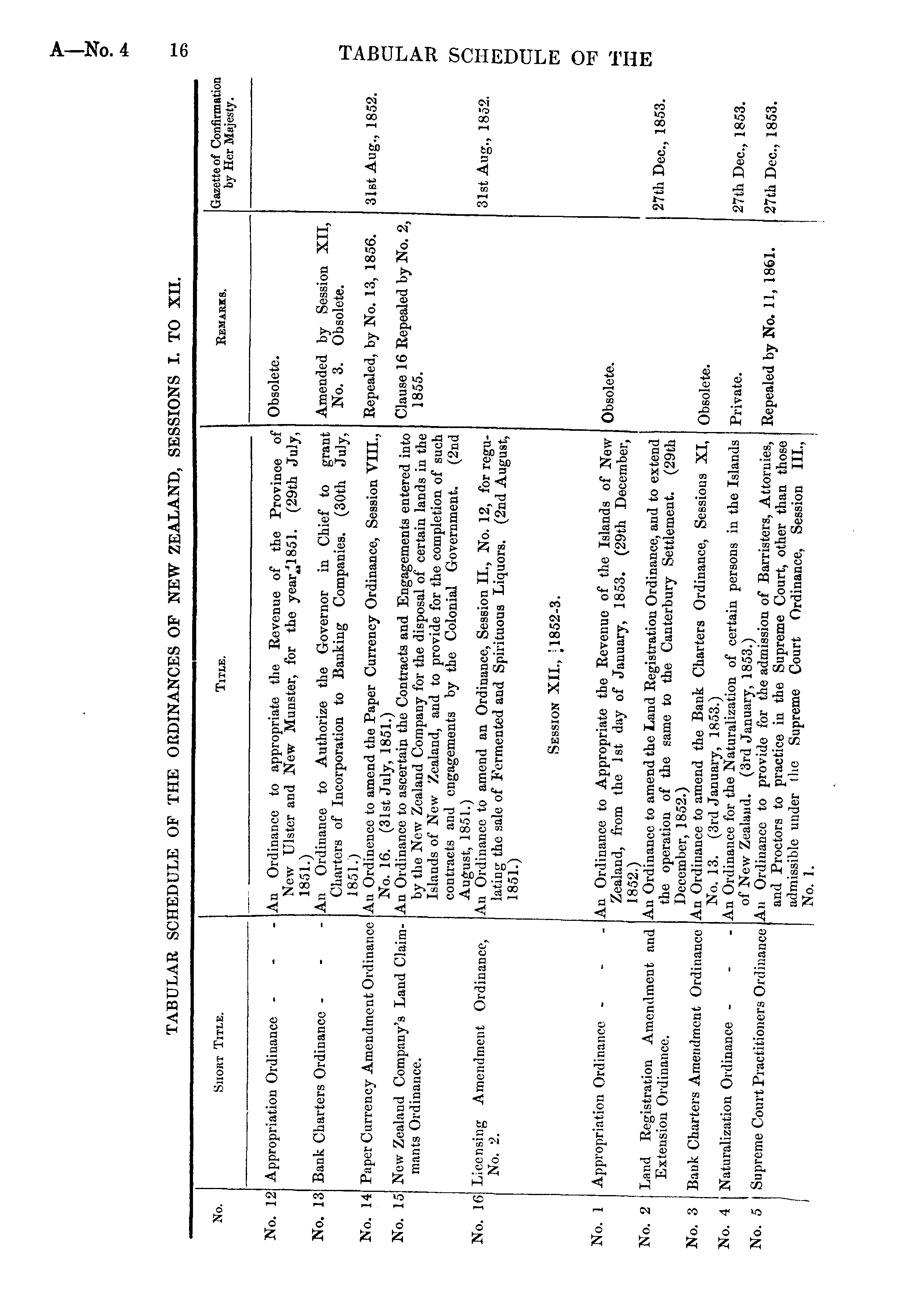 TABULAR SCHEDULE OF THE ORDINANCES OF NEW ZEALAND, SESSIONS I. TO XII. No. Shout Title. Title. Remarks. Gazette of Confirmation by Her Majesty. No. 12 ' Appropriation Ordinance - An Ordinance to appropriate the Revenue of the Province of New Ulster and New Munster, for the year '1 851. C29th Julv 1851.) " V J' An Ordinance to Authorize the Governor in Chief to grant Charters of Incorporation to Banking Companies. f30th JuJv 1851.) V " s An Ordinence to amend the Paper Currency Ordinance, Session VIII No. 16. (31st July, 1851.) An Ordinance to ascertain the Contracts and Engagements entered into by the New Zealand Company for the disposal of certain lands in the Islauds of New Zealand, and to provide for the completion of such contracts and engagements by the Colonial Government. (2nd August, 1851.) An Ordinance to amend an Ordinance, Session II., No. 12, for regulating the sale of Fermented and Spirituous Liquors. (2nd Aueust 1851.) b ' Obsolete. No. 13 Bank Charters Ordinance - - - Amended by Session XII, No. 3. Obsolete. No. 14 Paper Currency Amendment Ordinance Repealed, by No. 13, 1856. No. 15 New Zealand Company's Land Claimmants Ordinance. Clause 16 Repealed by No. 2, 1855. 31st Aug., 1852. Licensing Amendment Ordinance, No. 2. 31st Aug., 1852. No. 16 Appropriation Ordinance ... Session XII., [1852-3. No. 1 No. 2 No. 3 Land Registration Amendment and Extension Ordinance. Bank Charters Amendment Ordinance An Ordinance to Appropriate the Revenue of the Islands of New Zealand, from the 1st day of January, 1853. (29th December, 1852.) An Ordinance to amend the Land Registration Ordinance, and to extend the operation of the same to the Canterbury Settlement. (29th December, 1852.) V An Ordinance to amend the Bank Charters Ordinance, Sessions XI No. 13. (3rd January, 1853.) An Ordinance for the Naturalization of certain persons in the Islands of New Zealand. (3rd January, 1853.) Au Ordinance to provide for the admission of Barristers, Attornies, and Proctors to practice in the Supreme Court, other than those admissible under the Supreme Court Ordinance, Session III., No. 1. Obsolete. Obsolete27th Dec, 1853. No. 4 Naturalization Ordinance - - - Private. 27th Dec, 1853. No. 5 Supreme Court Practitioners Ordinance . Repealed by No. 11, 1861. 27th Dec, 1853.