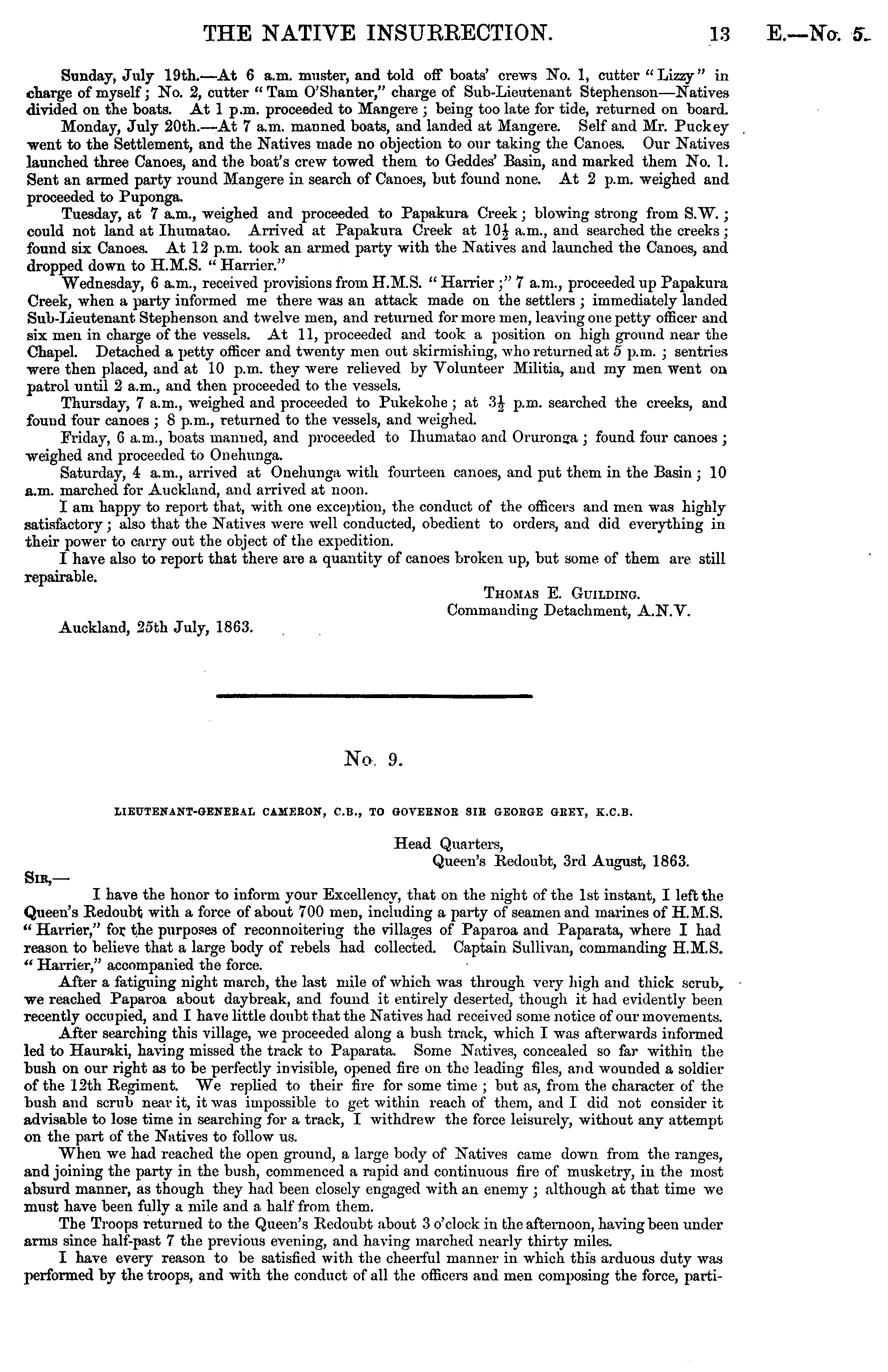 No. 9. LIEUTENANT-GENERAL CAMEBON, C.8., TO GOVEBNOB SIB GEORGE GEEY, K.CB. Head Quarters, Queen's Redoubt, 3rd August, 1863. Sir,— I have the honor to inform your Excellency, that on the night of the Ist instant, I left the Queen's Redoubt with a force of about 700 men, including a party of seamen and marines of H.M.S. " Harrier," for the purposes of reconnoiteriug the villages of Paparoa and Paparata, where I had reason to believe that a large body of rebels had collected. Captain Sullivan, commanding H.M.S. " Harrier," accompanied the force. After a fatiguing night march, the last mile of which was through very high and thick scrub,. we reached Paparoa about daybreak, and found it entirely deserted, though it had evidently been recently occupied, and I have little doubt that the Natives had received some notice of our movements. After searching this village, we proceeded along a bush track, which I was afterwards informed led to Hauraki, having missed the track to Paparata, Some Natives, concealed so far within the bush on our right as to be perfectly invisible, opened fire on the leading files, and wounded a soldier of the 12th Regiment. We replied to their fire for some time ; but as, from the character of the bush and scrub near it, it was impossible to get within reach of them, and I did not consider it advisable to lose time in searching for a track, I withdrew the force leisurely, without any attempt on the part of the Natives to follow us. When we had reached the open ground, a large body of Natives came down from the ranges, and joining the party in the bush, commenced a rapid and continuous fire of musketry, in the most absurd manner, as though they had been closely engaged with an enemy ; although at that time we must have been fully a mile and a half from them. The Troops returned to the Queen's Redoubt about 3 o'clock in the afternoon, having been under arms since half-past 7 the previous evening, and having marched nearly thirty miles. I have every reason to be satisfied with the cheerful manner in which this arduous duty was performed by the troops, and with the conduct of all the officers and men composing the force, parti-