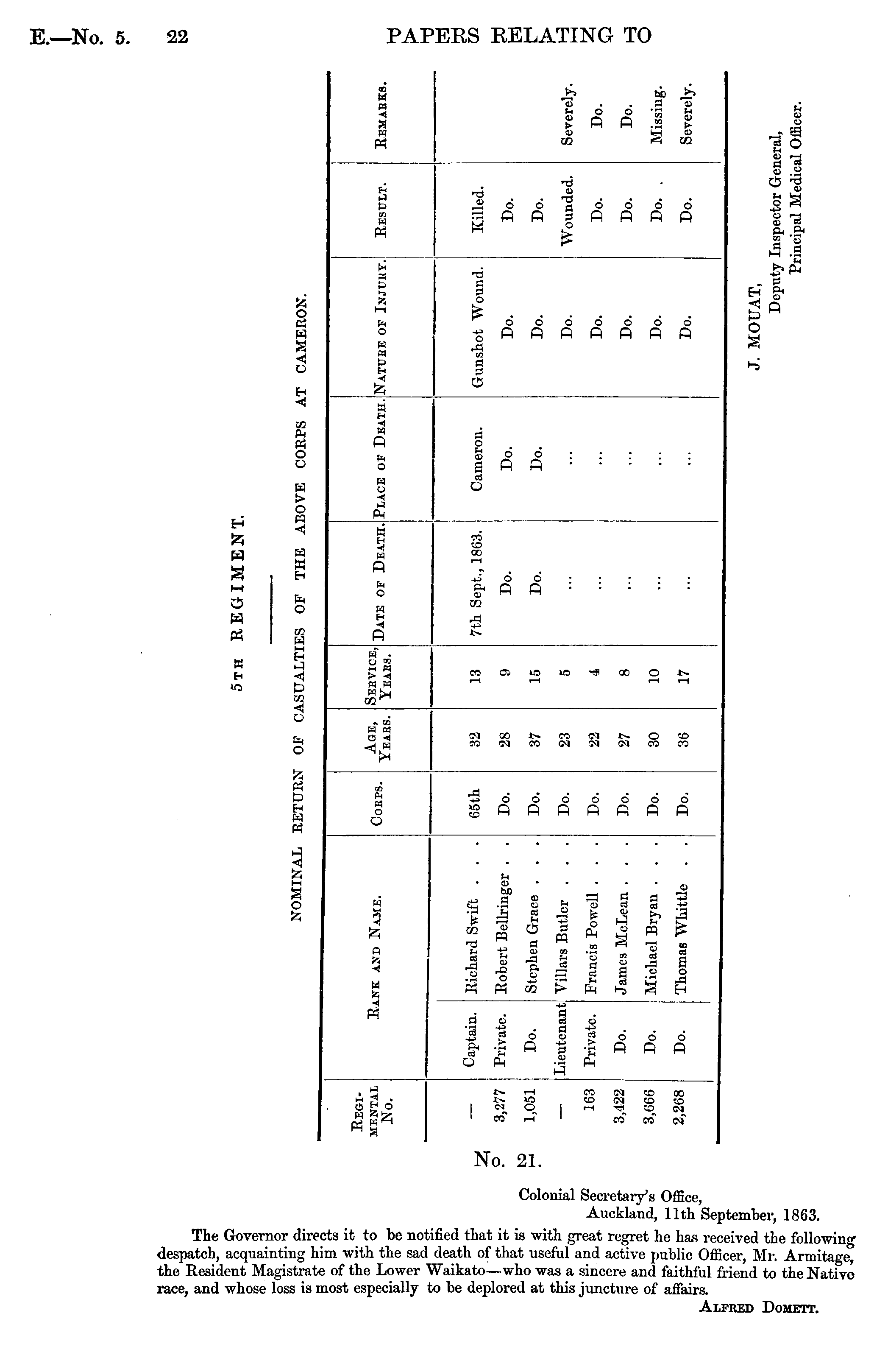 Regimental No. Age, Yeabs. Sebvice, Yeaes. Rank and Name. COBPS. Date of Death. Place of Death. Natube of Injuey.I Result. Remaeks. Captain. Richard Swift . . 65th 32 18 7th Sept., 1863. Cameron. Gunshot Wound. Killed. 3,277 Private. Robert Bellringer . Do. 2S 9 Do. Do. Do. Do. 1,051 Do. Stephen Grace . . Do. 87 15 Do. Do. Do. Do. Lieutenant Villars Butler . . Do. 23 5 Do. Wounded. Severely. 163 Private. Francis Powell . . Do. 22 4, Do. Do. Do. 3,422 Do. James McLean . . Do. 27 8 Do. Do. Do. 3,666 Do. Michael Bryan . . Do. 80 10 Do. Do. . Missing. 2,268 Do. Thomas Whittle . Do, 36 17 Do. Do. Severely.