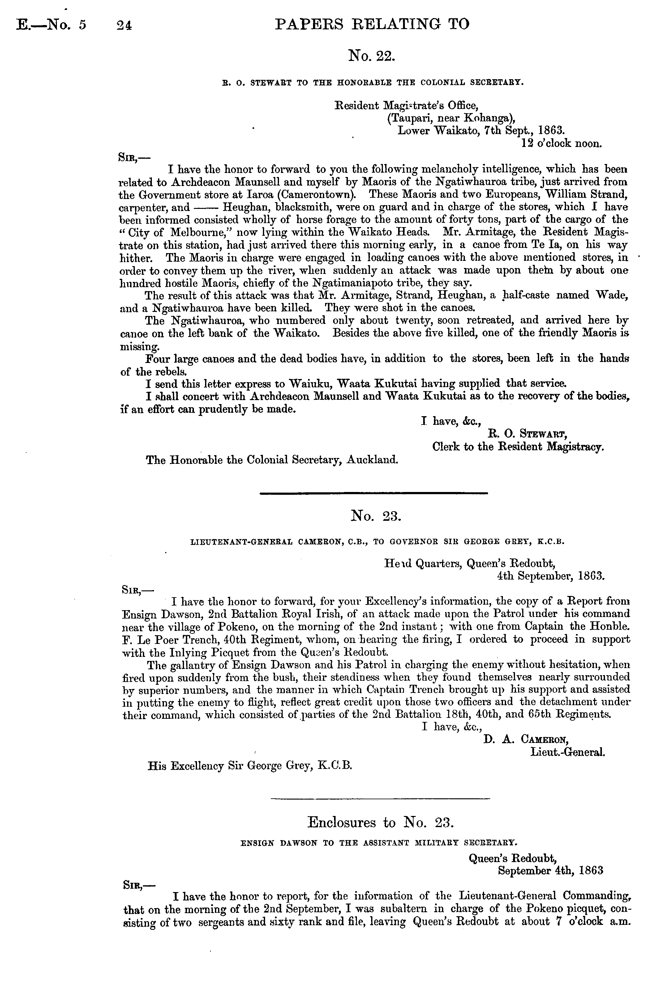 No. 22. B. O. STEWAET TO THE HONORABLE THE COLONIAL SECBETAEY. Resident Magistrate's Office, (Taupari, near Kohanga), Lower Waikato, 7th Sept., 1863. 12 o'clock noon. Sir,— I have the honor to forward to you the following melancholy intelligence, which has been related to Archdeacon Maunsell and myself by Maoris of the Ngatiwhauroa tribe, just arrived from the Government store at laroa (Camerontown). These Maoris and two Europeans, William Strand, carpenter, and ■ Heughan, blacksmith, were on guard and in charge of the stores, which I have been informed consisted wholly of horse forage to the amount of forty tons, part of the cargo of the " City of Melbourne," now lying within the Waikato Heads. Mr. Armitage, the Resident Magistrate on this station, had just arrived there this morning early, in a canoe from Te la, on his way hither. The Maoris in charge were engaged in loading canoes with the above mentioned stores, in order to convey them up the river, when suddenly an attack was made upon them by about one hundred hostile Maoris, chiefly of the Ngatimaniapoto tribe, they say. The result of this attack was that Mr. Armitage, Strand, Heughan, a half-caste named Wade, and a Ngatiwhauroa have been killed. They were shot in the canoes. The Ngatiwhauroa, who numbered only about twenty, soon retreated, and arrived here by canoe on the left bank of the Waikato. Besides the above five killed, one of the friendly Maoris is missing. Four large canoes and the dead bodies have, in addition to the stores, been left in the hands of the rebels. I send this letter express to Waiuku, Waata Kukutai having supplied that service. I shall concert with Archdeacon Maunsell and Waata Kukutai as to the recovery of the bodies, if an effort can prudently be made. I have, &c, R. O. Stewart, Clerk to the Resident Magistracy. The Honorable the Colonial Secretary, Auckland.