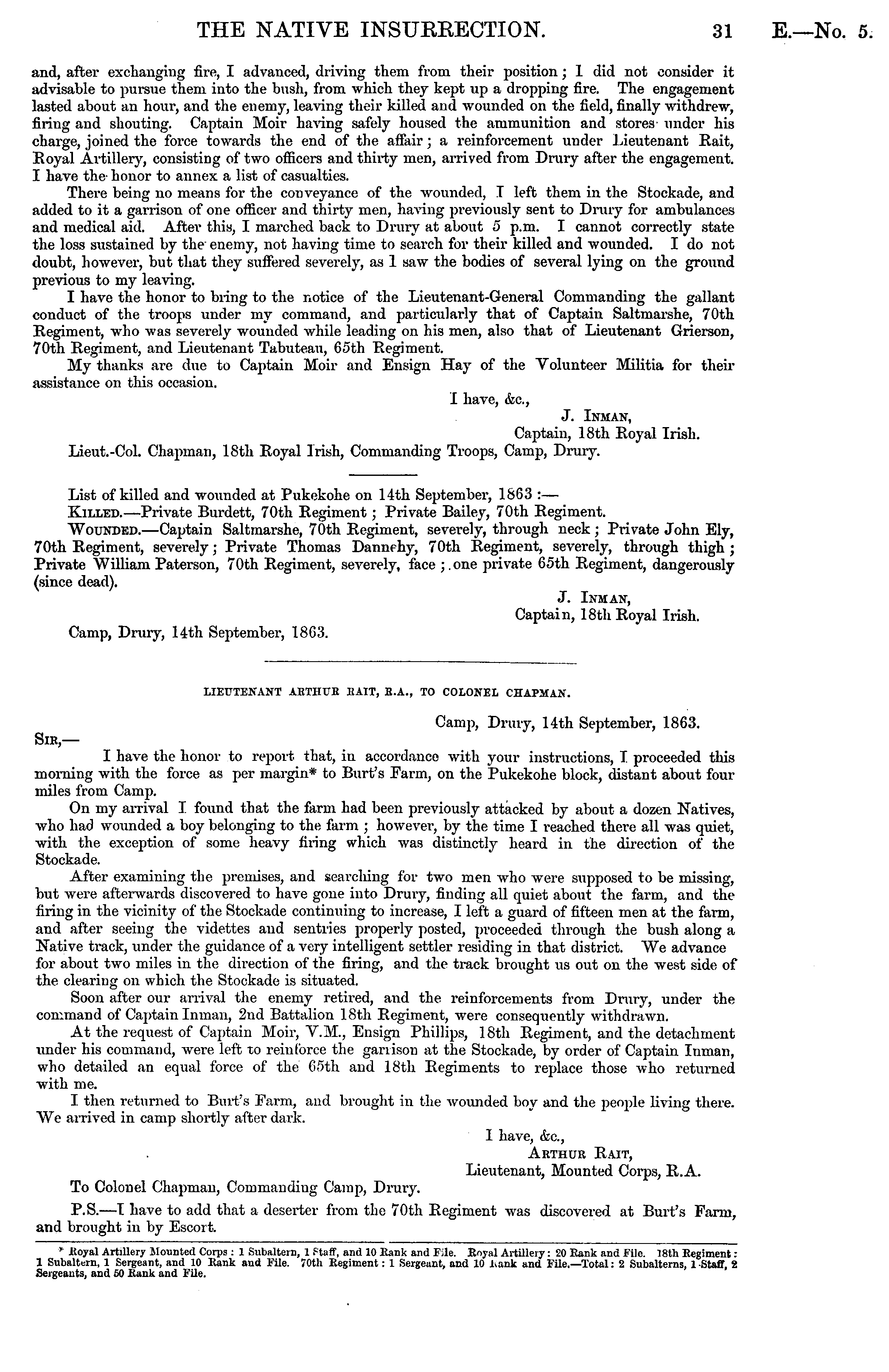and, after exchanging fire, I advanced, driving them from their position ; 1 did not consider it advisable to pursue them into the bush, from which they kept up a dropping fire. The engagement lasted about an hour, and the enemy, leaving their killed and wounded on the field, finally withdrew, firing and shouting. Captain Moir having safely housed the ammunition and stores under his charge, joined the force towards the end of the affair; a reinforcement under Lieutenant Rait, Royal Artillery, consisting of two officers and thirty men, arrived from Drury after the engagement. I have the- honor to annex a list of casualties. There being no means for the conveyance of the wounded, I left them in the Stockade, and added to it a garrison of one officer and thirty men, having previously sent to Drury for ambulances and medical aid. After this, I marched back to Drury at about 5 p.m. I cannot correctly state the loss sustained by the enemy, not having time to search for their killed and wounded. I do not doubt, however, but that they suffered severely, as 1 saw the bodies of several lying on the ground previous to my leaving. I have the honor to bring to the notice of the Lieutenant-General Commanding the gallant conduct of the troops under my command, and particularly that of Captain Saltmarshe, 70th Regiment, who was severely wounded while leading on his men, also that of Lieutenant Grierson, 70th Regiment, and Lieutenant Tabuteau, 65th Regiment. My thanks are due to Captain Moir and Ensign Hay of the Volunteer Militia for their assistance on this occasion. I have, &c, J. Inman, Captain, 18th Royal Irish. Lieut.-Col. Chapman, 18th Royal Irish, Commanding Troops, Camp, Drury. List of killed and wounded at Pukekohe on 14th September, 1863 :— Killed.—Private Burdett, 70th Regiment ; Private Bailey, 70th Regiment. Wounded.—Captain Saltmarshe, 70th Regiment, severely, through neck; Private John Ely, 70th Regiment, severely; Private Thomas Dannehy, 70th Regiment, severely, through thigh ; Private William Paterson, 70th Regiment, severely, face ;.one private 65th Regiment, dangerously (since dead). J. Inman, Captain, 18th Royal Irish. Camp, Drury, 14th September, 1863.
