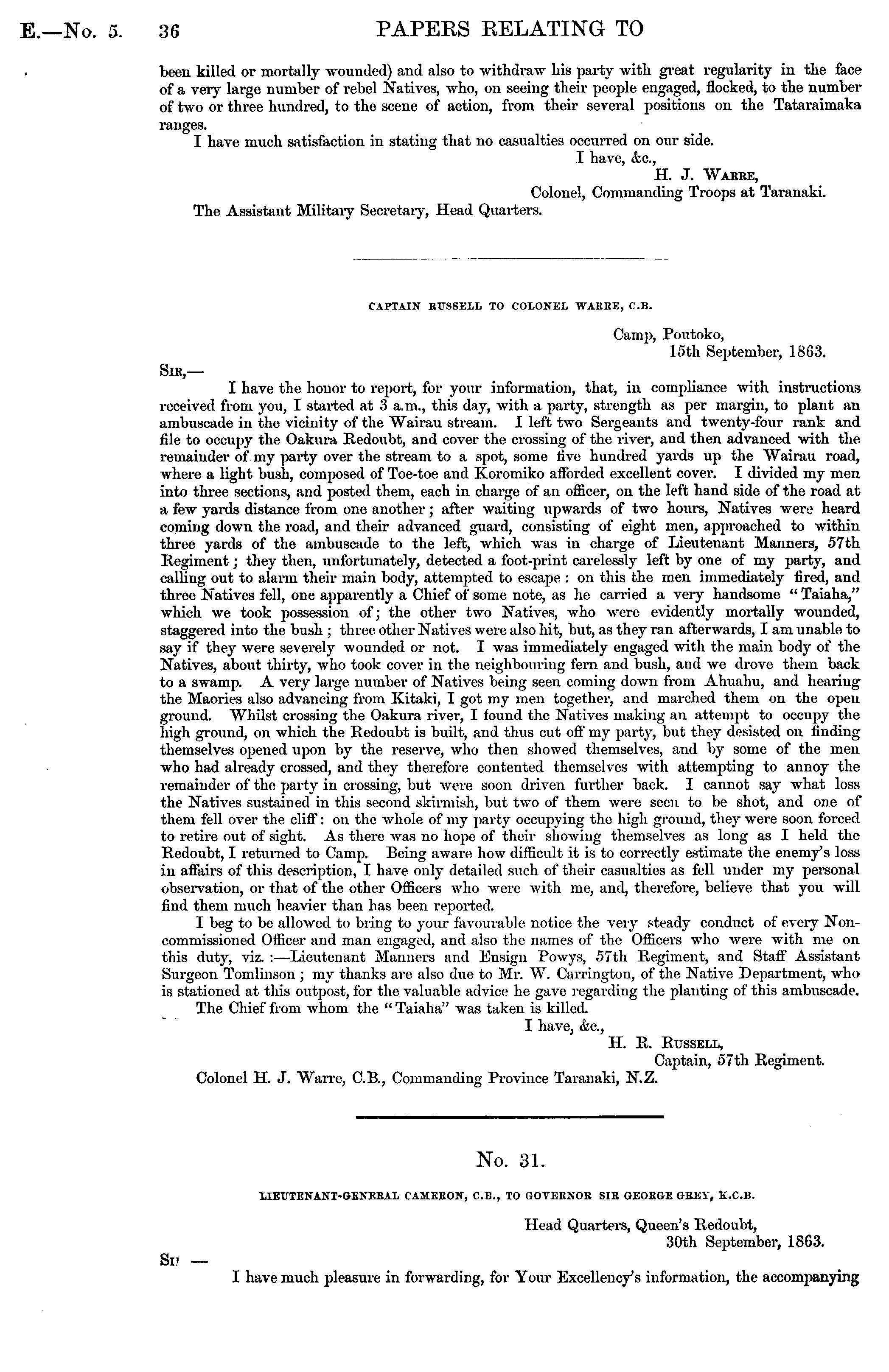 CAPTAIN EUSSELL TO COLONEL WABBE, C.B. Cam]), Poutoko, 15th September, 1863. Sir, — I have the honor to report, for your information, that, in compliance with instructions received from you, I started at 3 a.m., this day, with a party, strength as per margin, to plant an ambuscade in the vicinity of the Wairau stream. I left two Sergeants and twenty-four rank and file to occupy the Oakura Redoubt, and cover the crossing of the river, and then advanced _th the remainder of my party over the stream to a spot, some five hundred yards up the Wairau road, where a light bush, composed of Toe-toe and Koromiko afforded excellent cover. I divided my men into three sections, and posted them, each in charge of an officer, on the left hand side of the road at a few yards distance from one another; after waiting upwards of two hours, Natives were heard coming down the road, and their advanced guard, consisting of eight men, approached to within three yards of the ambuscade to the left, which was in charge of Lieutenant Manners, 57th Regiment; they then, unfortunately, detected a foot-print carelessly left by one of my party, and calling out to alarm their main body, attempted to escape : on this the men immediately fired, and three Natives fell, one apparently a Chief of some note, as he carried a veiy handsome " Taiaha," which we took possession of; the other two Natives, who were evidently mortally wounded, staggered into the bush ; three other Natives were also hit, but, as they ran afterwards, I am unable to say if they were severely wounded or not. I was immediately engaged with the main body of the Natives, about thirty, who took cover in the neighbouring fern and bush, and we drove them back to a swamp. A very large number of Natives being seen coming down from Ahuahu, and hearing the Maories also advancing from Kitaki, I got my men together, and marched them on the open ground. Whilst crossing the Oakura river, I found the Natives making an attempt to occupy the high ground, on which the Redoubt is built, and thus cut off my party, but they desisted on finding themselves opened upon by the reserve, who then showed themselves, and by some of the men who had already crossed, and they therefore contented themselves with attempting to annoy the remainder of the party in crossing, but were soon driven further back. I cannot say wdiat loss the Natives sustained in this second skirmish, but two of them were seen to be shot, and one of them fell over the cliff: on the whole of my party occupying the high ground, they were soon forced to retire out of sight. As there was no hope of their showing themselves as long as I held the Redoubt, I returned to Camp. Being aware how difficult it is to correctly estimate the enemy's loss in affairs of this description, I have only detailed such of their casualties as fell under my personal observation, or that of the other Officers who were with me, and, therefore, believe that you will find them much heavier than has been reported. I beg to be allowed to bring to your favourable notice the veiy steady conduct of every Noncommissioned Officer and man engaged, and also the names of the Officers who were with me on this duty, viz. :—Lieutenant Manners and Ensign Powys, 57th Regiment, and Staff Assistant Surgeon Tomlinson; my thanks are also due to Mr. W. Carrington, of the Native Department, wdio is stationed at this outpost, for the valuable advice he gave regarding the planting of this ambuscade. The Chief from whom the "Taiaha'' was taken is killed. I have, <_~ H. R. Russell, Captain, 57th Regiment. Colonel H. J. Warre, C.8., Commanding Province Taranaki, N.Z.