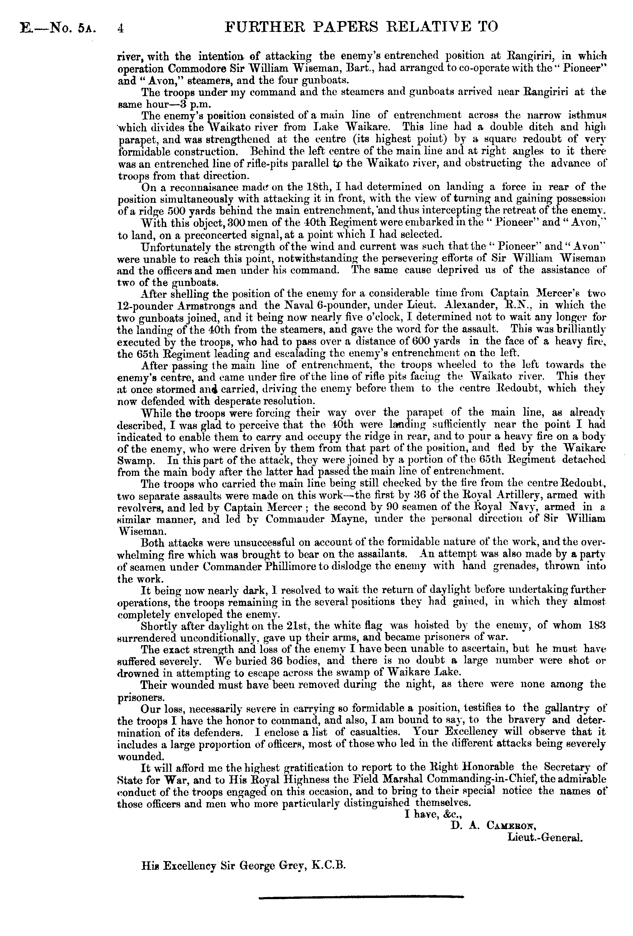 river, with the intention of attacking the enemy's entrenched position at Rangiriri, in which operation Commodore Sir William Wiseman, Bart., had arranged to co-operate with the" Pioneer" and " Avon," steamers, and the four gunboats. The troops under my command and the steamers and gunboats arrived near Rangiriri at the same hour —3 p.m. The enemy's position consisted of a main line of entrenchment across the narrow isthmus which divides the Waikato river from Lake Waikare. This line had a double ditch and high parapet, and was strengthened at the centre (its highest point) by a square redoubt of very formidable construction. Behind the left centre of the main line and at right angles to it there was an entrenched line of rifle-pits parallel tp the Waikato river, and obstructing the advance of troops from that direction. On a reconnaisance made on the 18th, I had determined on landing a force in rear of the position simultaneously with attacking it in front, with the view of turning and gaining possession of a ridge f>00 yards behind the main entrenchment, and thus intercepting the retreat of the enemy. With this object, 300 men of the 40th Regiment were embarked in the " Pioneer" and" Avon.' to land, on a preconcerted signal, at a point which I had selected. Unfortunately the strength of the wind and current was such that the'" Pioneer" and" Avon" were unable to reach this point, notwithstanding the) persevering efforts of Sir William Wiseman and the officers and men Tinder his command. The same cause deprived us of the assistance of two of the gunboats. After shelling the position of the enemy for a considerable time from Captain Mercer's two 12-pounder Armstrongs and the Naval 6-pounder, under Lieut. Alexander, U.K., in which the two gunboats joined, and it being now nearly five o'clock, I determined not to wait any longer for the landing of the 40th from the steamers, and gave the word for the assault. This was brilliantly executed by the troops, who had to pass over a distance of 600 yards in the face of a heavy fire, the 05th Regiment leading and escalading the enemy's entrenchment on the left. After passing vhe main line of entrenchment, the troops wheeled to the left towards the enemy's centre, and came under fire of the line of rifle pits facing the Waikato river. This they at once stormed and carried, driving the enemy before them to the centre Redoubt, which they now defended with desperate resolution. While the troops were forcing their way over the parapet of the main line, as already described, I was glad to perceive that the 40th were landing sufficiently near the point I had indicated to enable them to carry and occupy the ridge in rear, and to pour a heavy fire on a body of the enemy, who were driven By them from that part of the position, and fled by the Waikare Swamp. In this part of the attack, they were joined by a portion of the 65th Regiment detached from the main body after the latter had passed the main line of entrenchment. The troops who carried the? main line being still checked by the fire from the centre Redoubt, two separate assaults were made on this work—the first by 36 of the Royal Artillery, armed with revolvers, and led by Captain Mercer ; the second by 90 seamen of the Royal Xavy, armed in a similar manner, and led by Commander Mayne, under the personal direction of Sir William Wiseman. Both attacks were unsuccessful on account of the formidable nature of the, work, and the overwhelming fire which was brought to bear on the assailants. An attempt was also made by a party of seamen under Commander Phillimore to dislodge the enemy with hand grenades, thrown into the work. It being now nearly dark, I resolved to wait the return of daylight before undertaking further operations, the troops remaining in the several positions they had gained, in which they almost completely enveloped the enemy. Shortly after daylight on the 21st, the white flag was hoisted by the enemy, of whom 183 surrendered unconditionally, gave up their arms, and became prisoners of war. The exact strength and loss of the enemy 1 have been unable to ascertain, but he must have suffered severely. We buried 36 bodies, anil there is no doubt a large number were shot or drowned in attempting to escape across the swamp of Waikare Lake. Their wounded must have been removed during the night, as there were none among the prisoners. Our loss, necessarily severe in carrying so formidable a position, testifies to the gallantry of the troops I have the honor to command, and also, I am bound to say, to the bravery and determination of its defenders. I enclose a list of casualties. Your Excellency will observe that it includes a large proportion of officers, most of those who led in the different attacks being severely wounded. It will afford me the highest gratification to report to the Right Honorable the Secretary of State for War, and to His Royal Highness the Field Marshal Commanding-in-Chief, the admirable conduct of the troops engaged on this occasion, and to bring to their special notice the names of those officers and men who more particularly distinguished themselves. I have, &c, D. A. Camekoit, Lieut.-General. Hi* Excellency Sir George Grey, K.C.B.