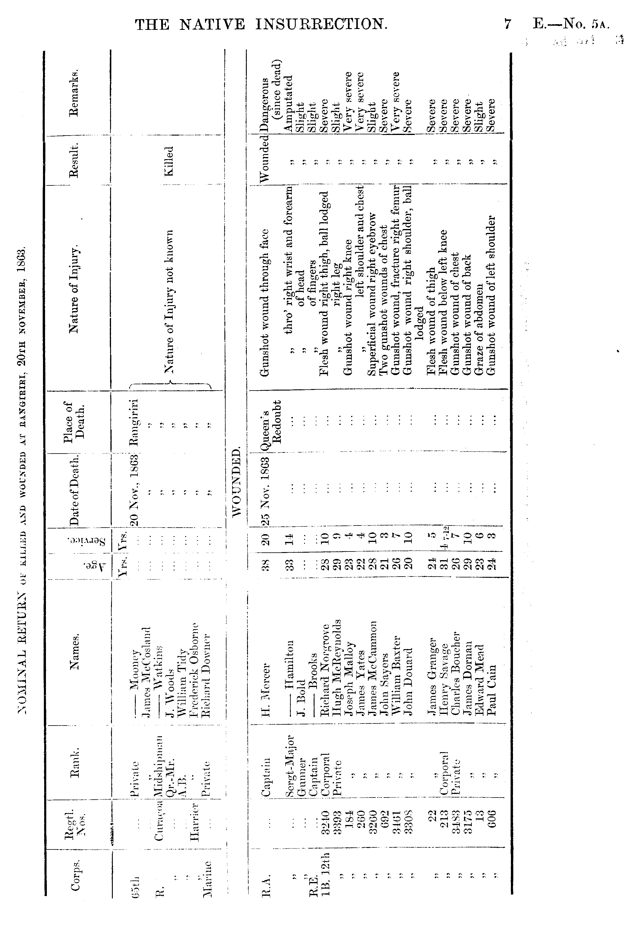 K M. IS OF KILLED XSD WOUNDED AT ItAX GIRIHI. 2< 'TIL KOVEMBEB. Corps. Eegtl. Nos. Rank. Names. 1 | i * i m ti a j?T-i ji Place of DateofDeath. Death Nature of Injury. Result. Remarks. G5th E, ... Curacoa Private Midshipman Qr.-Mr: A.B. Private Mooney James McCosland j Watkins .!. Woods William Tidy j Frederick Osborno I Richard Downer 'YrsJVrs. ::: 20 Nov., 1863j Rangiriri » )5 ?> fi 1 i- Nature of Injury not known j Killed Marine Harrier ... I WOUNDED. li.A. I Captain H. Mercer 88 20 25 Nov. 18G3 Queen's Redoubt Gunshot wound through face Wounded „ thro' right wrist and forearm „ of head „ of fingers „ Flesh wound right thigh, ball lodged „ right leg Gunshot wound right knee „ „ left shoulder and chest ,, Superficial wound right eyebrow „ Two gunshot wounds of chest „ Gunshot wound, fracture right femur „ Gunshot wound right shoulder, ball ,, lodged Flesh wound of thigh „ Flesh wound below left knee ,, Gunshot wound of chest „ Gunshot wound of back „ Graze of abdomen ,, Gunshot wound of left shoulder „ Dangerous (since dead) Amputated Slight Slight I Severe Slight Very severe Very severe Slight Severe Very severe Severe J> R.E. IB. 12th J) >J 3240 3393 260 3200 G92 3401 3308 Sergt-Major Gunner Captain Corporal Private Hamilton J. Bold Brooks Richard Norgrove Hugh McReynolds Joseph Malloy James Yates James McCammon John Sayers William Baxter John Douard 33 28 29 23 22 28 21 26 20 14 10 9 4 4 10 3 7 10 ... - ... )) ... ;) ... )) ... ;> i? j) 22 213 34S3 3175 13 G06 Corporal Private James Granger Henry Savage Chai-les Boucher James Doruaii Edward Mead Paul Cain 24 31 20 29 23 24 5 Severe Severe Severe Severe Slight Severe ... ... )> )) )i 4 mi ]0 G 3 :i I )> JJ