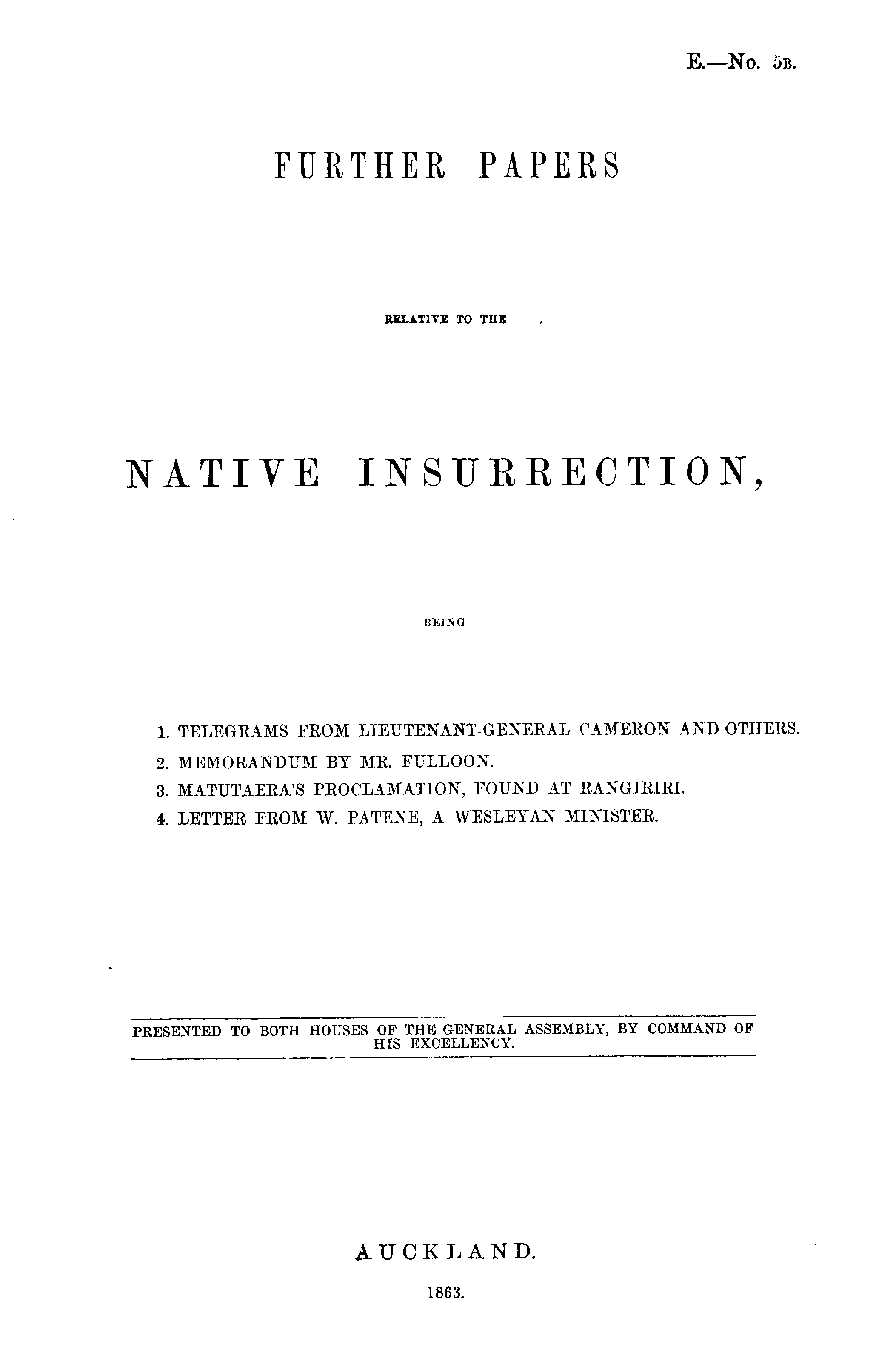 FURTHER PAPERS RELATIVE TO THE NATIVE INSURRECTION, BEING 1. TELEGRAMS FROM LIEUTENANT-GENERAL CAMERON AND OTHERS. 2. MEMORANDUM BY MR. FULLOON. 3. MATUTAERA'S PROCLAMATION, FOUND AT RANGIRIRI. 4. LETTER FROM W. PATENE, A WESLEYAN MINISTER.