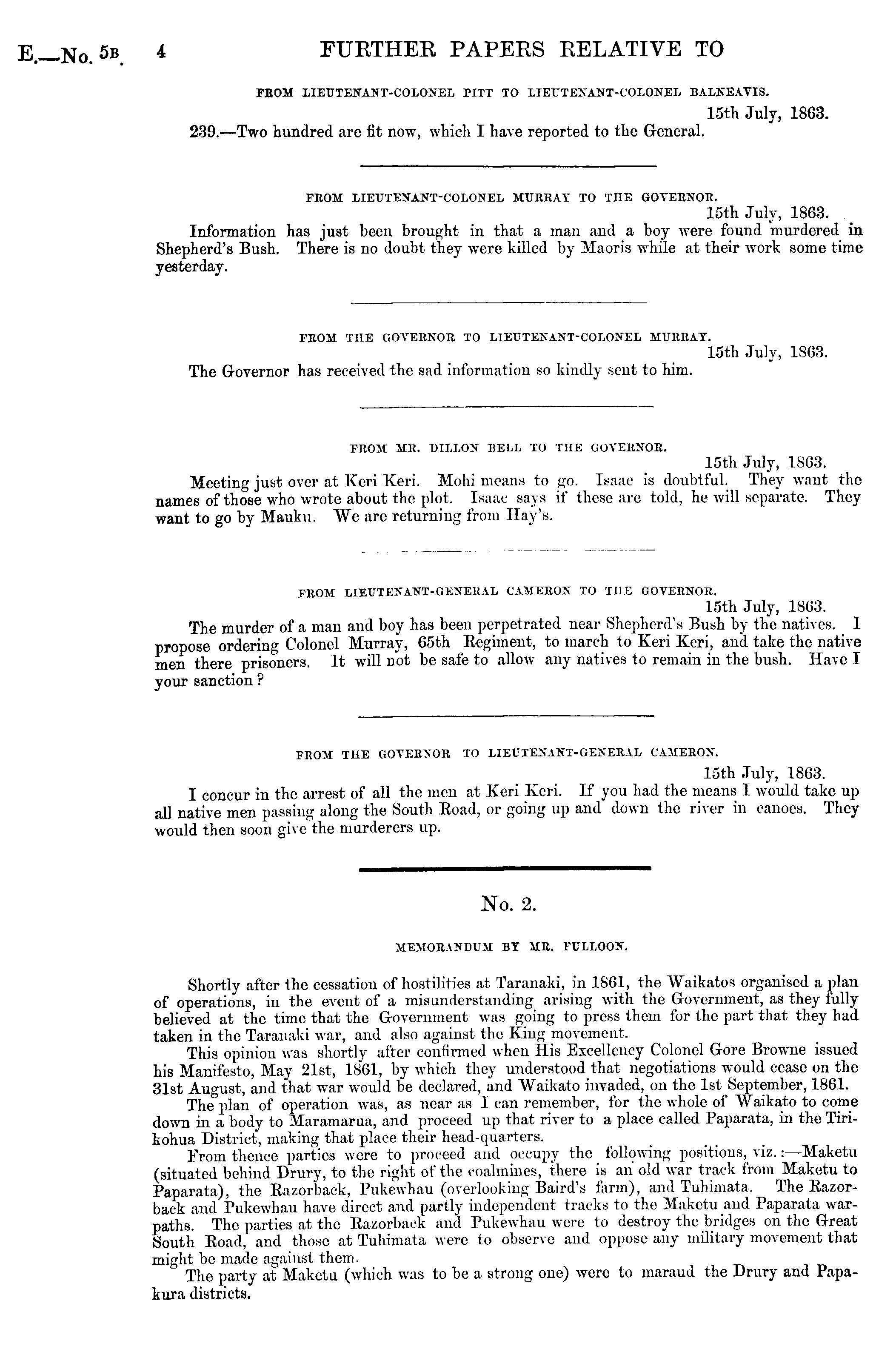 No. 2. MEMORANDUM BY ME. FUIIOOJT. Shortly after the cessation of hostilities at Taranaki, in 1861, the Waikatos organised a plan of operations, in the event of a misunderstanding arising with the Government, as they fully believed at the time that the Government was going to press them for the part that they had taken in the Taranaki war, and also against the King movement. This opinion was shortly after confirmed when His Excellency Colonel Gore Browne issued his Manifesto, May 21st, 1861, by which they understood that negotiations would cease on the 31st August, and that war would be declared, and "Waikato invaded, on the Ist September, 1861. The plan of operation was, as near as I can remember, for the whole of Waikato to come down in a body to Maramarua, and proceed up that river to a place called Paparata, in the Tirikohua District, making that place their head-quarters. From thence parties were to proceed and occupy the following positions, viz.: —Maketu (situated behind Drury, to the right of the coalmines, there is an old war track from Maketu to Paparata), the Eazorback, Pukewhau (overlooking Baird's farm), and Tuhimata. The Bazorback and Pukewhau have direct and partly independent tracks to the Maketu and Paparata warpaths. The parties at the Eazorback and Pukewhau were to destroy the bridges on the Great South Road, and those at Tuhimata were to observe and oppose any military movement that might be made against them. The party at Maketu (which was to be a strong one) were to maraud the Drury and Papakura districts.