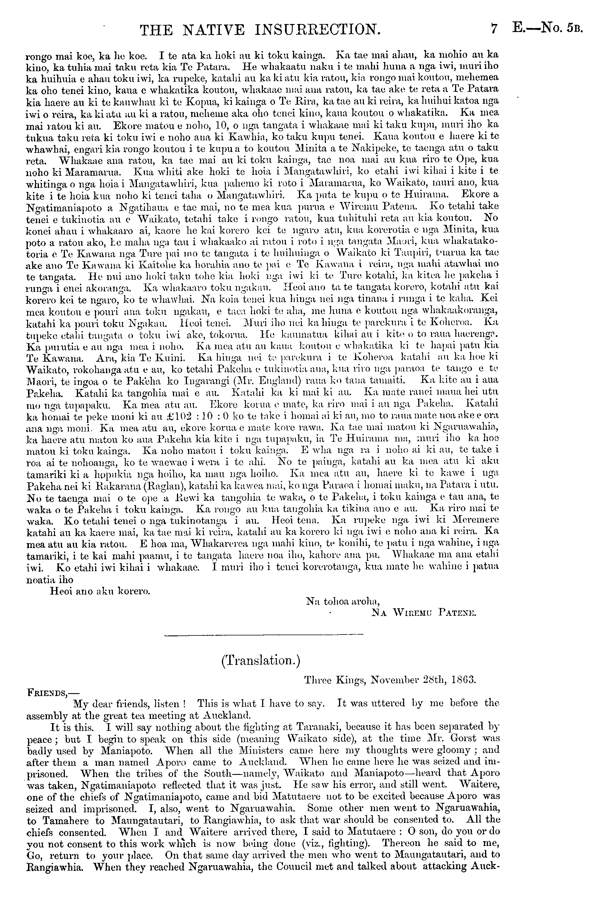 (Translation.) Three Kings, November 28th, 18G3. Friends, — My dear friends, listen ! This is what I have to say. It was uttered by me before the assembly at the great tea meeting at Auckland. It is this. I will say nothing about the fighting at Taranaki, because it has been separated by peace; but I begin to speak on this side (meaning VVaikato side), at the time Mr. Gorst was badly used by Maniapoto. When all the Ministers came here my thoughts were gloomy ; and after them a man named Aporo came to Auckland. When he came here he was seized and imprisoned. When the tribes of the South—namely, Waikato and Maniapoto—heard that Aporo was taken, Ngatimaniapoto reflected that it was just. He saw his error, and still went. Waitere, one of the chiefs of Ngatimaniapoto, came and bid Matutaere not to be excited because Aporo was seized and imprisoned. I, also, went to Ngaruawahia. Some other men went to Ngaruawahia, to Tamahere to Maungatautari, to Rangiawhia, to ask that war should be consented to. All the chiefs consented. When I and Waitere arrived there, I said to Matutaere : 0 son, do you or do you not consent to this work which is now being done (viz., fighting). Thereon he said to me, Go, return to your place. On that same day arrived the men who went to Maungatautari, and to Rangiawhia. When they reached Ngaruawahia, the Council met and talked about attacking Auck-