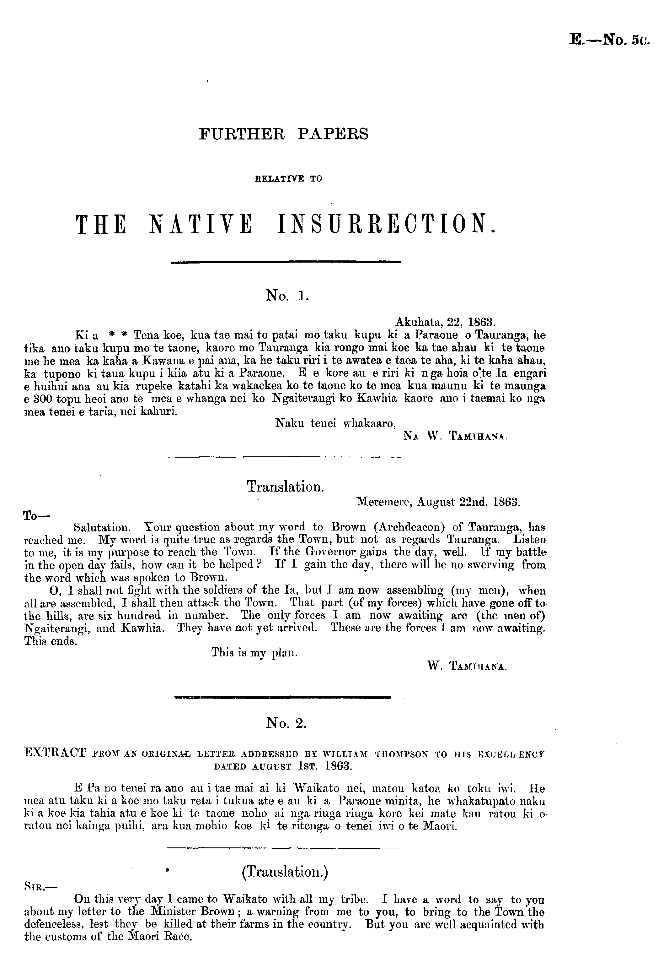 Translation. Meremere, August 22nd, 1S63. To— Salutation. Tour question about my word to Brown (Archdeacon) of Tauranga, ha* reached me. My word is quite true as regards the Town, but not as regards Tauranga, Listen to me, it is my purpose to reach the Town. If the Governor gains the day, well. If my battle in the open day fails, how can it be helped ? If I gain the day, there will be no swerving from the word which was spoken to Brown. 0, I shall not fight with the soldiers of the la, but I am now assembling (my men), when nil are assembled, I shall then attack the Town. That part (of my forces) which have gone off to the hills, are six hundred in number. The only forces I am now awaiting are (the men of) Ifgaiterangi, and Kawhia. They have not yet arrived. These are the forces I am now awaiting. This ends. This is my plan. W. Tahihaka.
