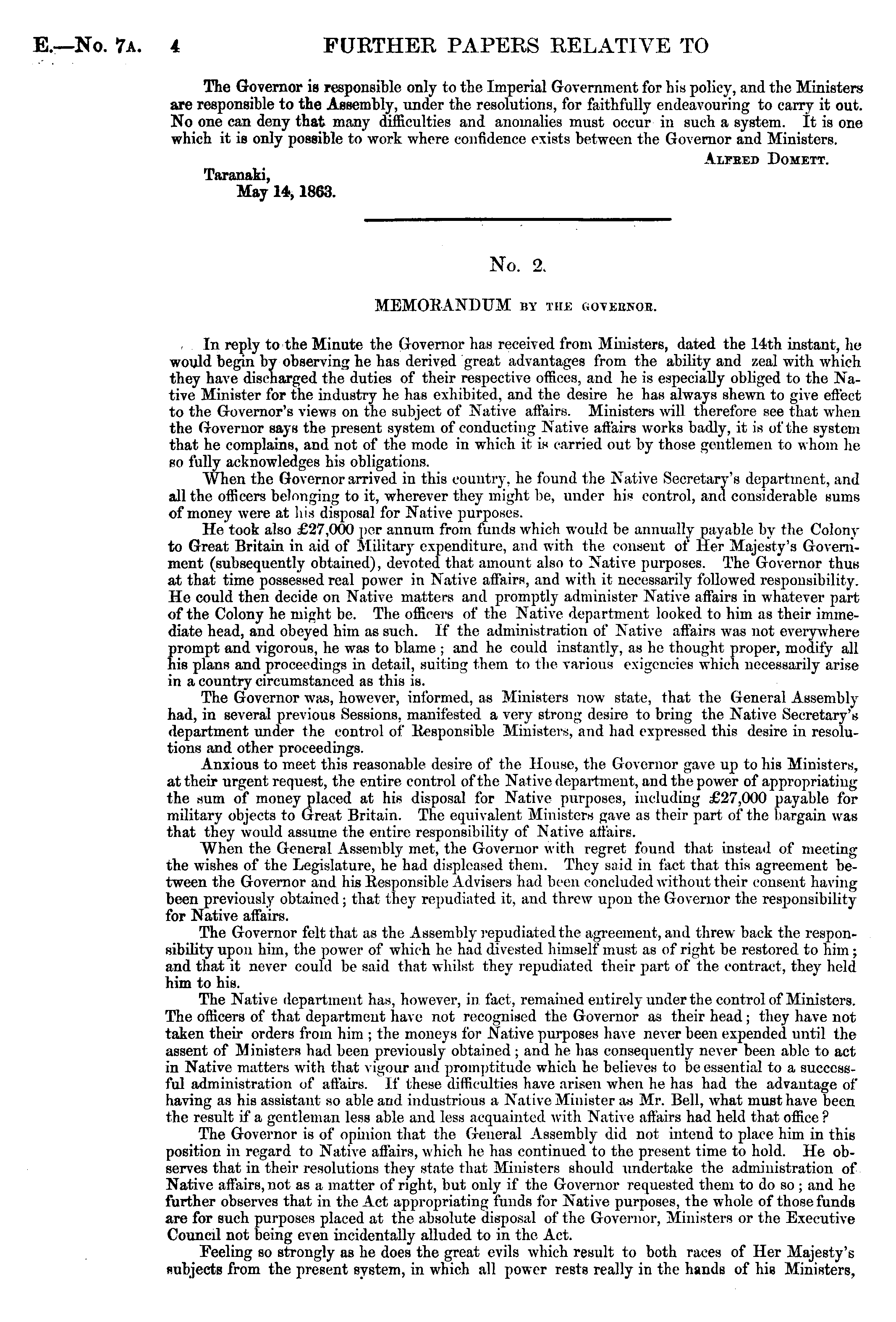 No. 2. MEMORANDUM by the goyeenob. In reply to the Minute the Governor has received from Ministers, dated the 14th instant, he would begin by observing he has derived great advantages from the ability and zeal with which they have discharged the duties of their respective offices, and he is especially obliged to the Native Minister for the industry he has exhibited, and the desire he has always shewn to give effect to the Governor's views on the subject of Native affairs. Ministers will therefore see that when the Governor says the present system of conducting Native affairs works badly, it is of the system that he complains, and not of the mode in which it is carried out by those gentlemen to whom he so fully acknowledges his obligations. When the Governor arrived in this country, he found the Native Secretary's department, and all the officers belonging to it, wherever they might be, under his control, and considerable sums of money were at his disposal for Native purposes. He took also £27,000 per annum from funds which would be annually payable by the Colony to Great Britain in aid of Military expenditure, and with the consent of Her Majesty's Government (subsequently obtained), devoted that amount also to Native purposes. The Governor thus at that time possessed real power in Native affairs, and with it necessarily followed responsibility. He could then decide on Native matters and promptly administer Native affairs in whatever part of the Colony he might be. The officers of the Native department looked to him as their immediate head, and obeyed him as such. If the administration of Native affairs was not everywhere prompt and vigorous, he was to blame ; and he could instantly, as he thought proper, modify all his plans and proceedings in detail, suiting them to the various exigencies which necessarily arise in a country circumstanced as this is. The Governor was, however, informed, as Ministers now state, that the General Assembly had, in several previous Sessions, manifested a very strong desire to bring the Native Secretary's department under the control of Responsible Ministers, and had expressed this desire in resolutions and other proceedings. Anxious to meet this reasonable desire of the House, the Governor gave up to his Ministers, at their urgent request, the entire control of the Native department, and the power of appropriating the sum of money placed at his disposal for Native purposes, including £27,000 payable for military objects to Great Britain. The equivalent Ministers gave as their part of the bargain was that they would assume the entire responsibility of Native affairs. When the General Assembly met, the Governor with regret found that instead of meeting the wishes of the Legislature, he had displeased them. They said in fact that this agreement between the Governor and his Responsible Advisers had been concluded without their consent ha ring been previously obtained; that they repudiated it, and threw upon the Governor the responsibility for Native affairs. The Governor felt that as the Assembly repudiated the agreement, and threw back the responsibility upon him, the power of which he had divested himself must as of right be restored to him; and that it never could be said that whilst they repudiated their part of the contract, they held him to his. The Native department has, however, in fact, remained entirely under the control of Ministers. The officers of that department have not recognised the Governor as their head ; they have not taken their orders from him ; the moneys for Native purposes have never been expended until the assent of Ministers bad been previously obtained; and he has consequently never been able to act in Native matters with that vigour and promptitude which he believes to be essential to a successful administration of affairs. If these difficulties have arisen when he has had the advantage of having as his assistant so able and industrious a Native Minister as Mr. Bell, what must have been the result if a gentleman less able and less acquainted with Native affairs had held that office ? The Governor is of opinion that the General Assembly did not intend to place him in this position in regard to Native affairs, which he has continued to the present time to hold. He observes that in their resolutions they state that Ministers should undertake the administration of Native affairs, not as a matter of right, but only if the Governor requested them to do so; and he further observes that in the Act appropriating funds for Native purposes, the whole of those funds are for such purposes placed at the absolute disposal of the Governor, Ministers or the Executive Council not being even incidentally alluded to in the Act. Eeeling so strongly as he does the great evils which result to both races of Her Majesty's subjects from the present system, in which all power rests really in the hands of his Ministers,
