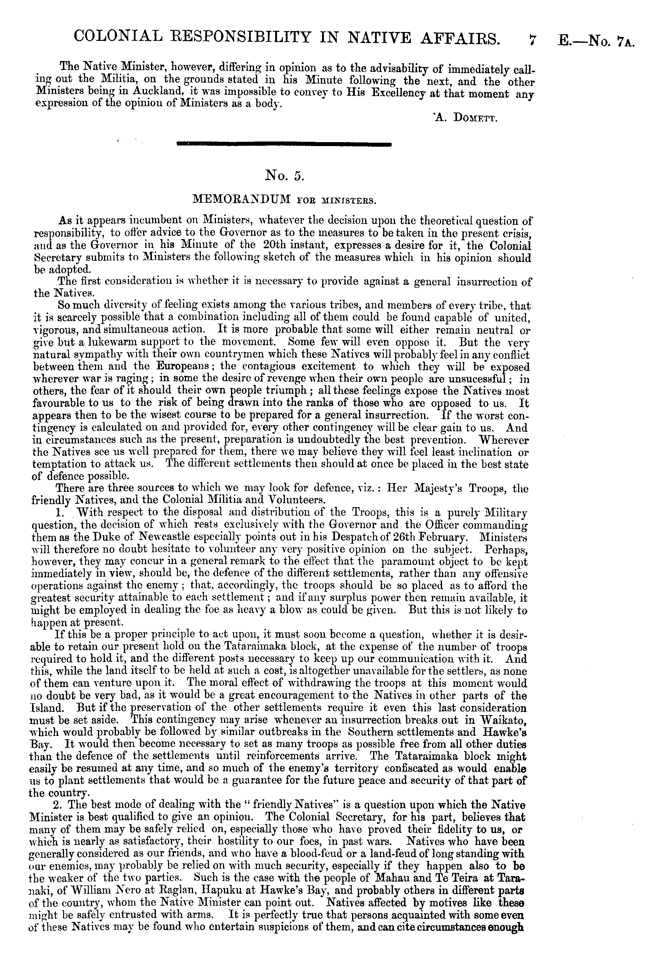 The Native Minister, however, differing in opinion as to the advisability of immediately calling out the Militia, on the grounds stated in his Minute following the next, and the other Ministers being in Auckland, it was impossible to convey to His Excellency at that moment any expression of the opinion of Ministers as a body. 'A. Domett.