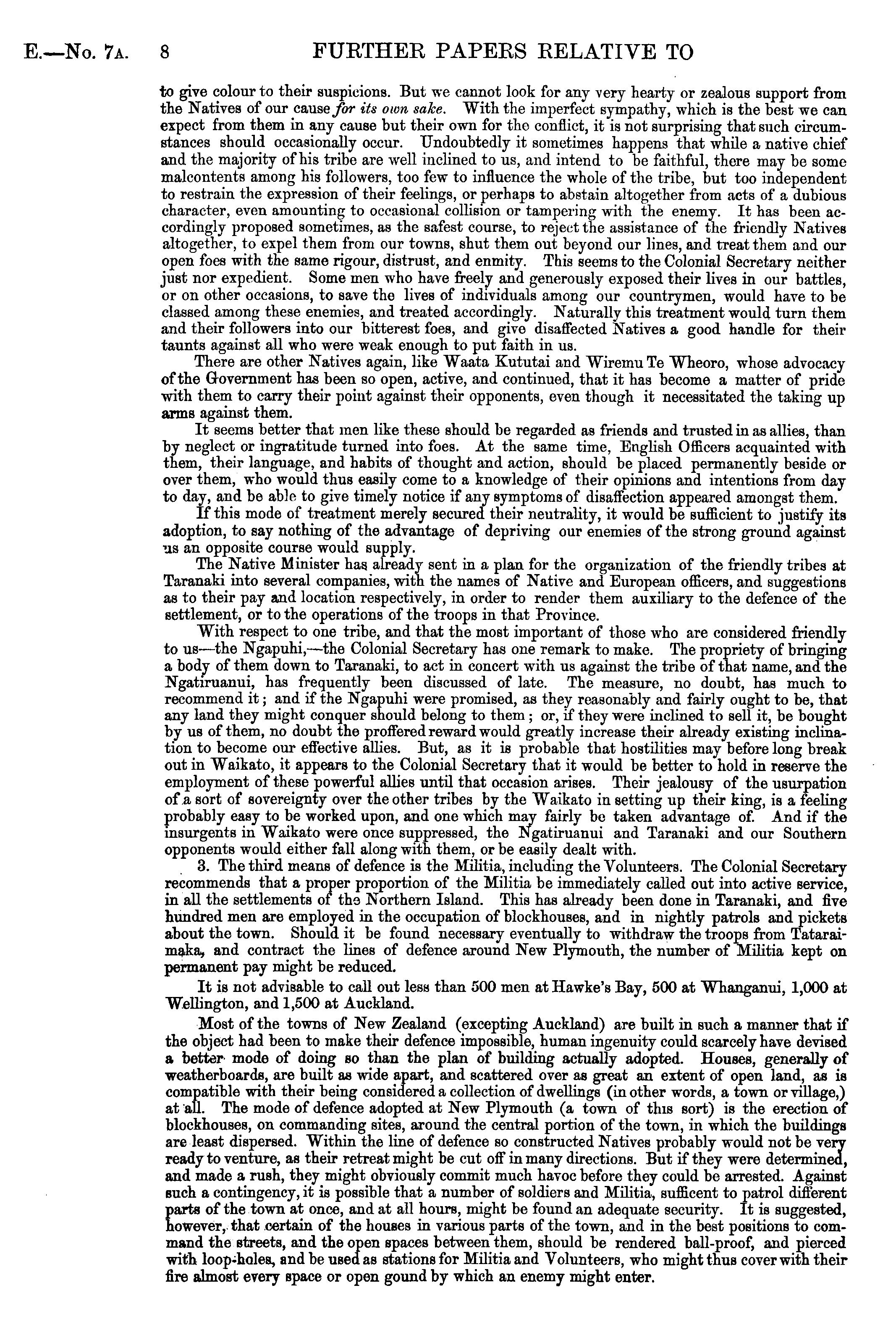 to give colour to their suspicions. But we cannot look for any very hearty or zealous support from the Natives of our cause for its own sake. With the imperfect sympathy, which is the best we can expect from them in any cause but their own for the conflict, it is not surprising that such circumstances should occasionally occur. Undoubtedly it sometimes happens that while a native chief and the majority of his tribe are well inclined to us, and intend to be faithful, there may be some malcontents among his followers, too few to influence the whole of the tribe, but too independent to restrain the expression of their feelings, or perhaps to abstain altogether from acts of a dubious character, even amounting to occasional collision or tampering with the enemy. It has been accordingly proposed sometimes, as the safest course, to reject the assistance of the friendly Natives altogether, to expel them from our towns, shut them out beyond our lines, and treat them and our open foes with the same rigour, distrust, and enmity. This seems to the Colonial Secretary neither just nor expedient. Some men who have freely and generously exposed their lives in our battles, or on other occasions, to save the lives of individuals among our countrymen, would have to be classed among these enemies, and treated accordingly. Naturally this treatment would turn them and their followers into our bitterest foes, and give disaffected Natives a good handle for their taunts against all who were weak enough to put faith in us. There are other Natives again, like Waata Kututai and Wiremu Te Wheoro, whose advocacy of the Government has been so open, active, and continued, that it has become a matter of pride with them to carry their point against their opponents, even though it necessitated the taking up arms against them. It seems better that men like these should be regarded as friends and trusted in as allies, than by neglect or ingratitude turned into foes. At the same time, English Officers acquainted with them, their language, and habits of thought and action, should be placed permanently beside or over them, who would thus easily come to a knowledge of their opinions and intentions from day to day, and be ablo to give timely notice if any symptoms of disaffection appeared amongst them. If this mode of treatment merely secured their neutrality, it would be sufficient to justify its adoption, to say nothing of the advantage of depriving our enemies of the strong ground against us an opposite course would supply. The Native Minister has already sent in a plan for the organization of the friendly tribes at Taranaki into several companies, with the names of Native and European officers, and suggestions as to their pay and location respectively, in order to render them auxiliary to the defence of the settlement, or to the operations of the troops in that Province. With respect to one tribe, and that the most important of those who are considered friendly to us —the Ngapuhi,—the Colonial Secretary has one remark to make. The propriety of bringing a body of them down to Taranaki, to act in concert with us against the tribe of that name, and the Ngatiruanui, has frequently been discussed of late. The measure, no doubt, has much to recommend it; and if the Ngapuhi were promised, as they reasonably and fairly ought to be, that any land they might conquer should belong to them ; or, if they were inclined to sell it, be bought by us of them, no doubt the proffered reward would greatly increase their already existing inclination to become our effective allies. But, as it is probable that hostilities may before long break out in Waikato, it appears to the Colonial Secretary that it would be better to hold in reserve the employment of these powerful allies until that occasion arises. Their jealousy of the usurpation of a sort of sovereignty over the other tribes by the Waikato in setting up their king, is a feeling probably easy to be worked upon, and one which may fairly be taken advantage of. And if the insurgents in Waikato were once suppressed, the Ngatiruanui and Taranaki and our Southern opponents would either fall along with them, or be easily dealt with. 3. The third means of defence is the Militia, including the Volunteers. The Colonial Secretary recommends that a proper proportion of the Militia be immediately called out into active service, in all the settlements of tho Northern Island. This has already been done in Taranaki, and five hundred men are employed in the occupation of blockhouses, and in nightly patrols and pickets about the town. Should it be found necessary eventually to withdraw the troops from Tataraimaka, and contract the lines of defence around New Plymouth, the number of Militia kept on permanent pay might be reduced. It is not advisable to call out less than 500 men at Hawke's Bay, 500 at Whanganui, 1,000 at Wellington, and 1,500 at Auckland. Most of the towns of New Zealand (excepting Auckland) are built in such a manner that if the object had been to make their defence impossible, human ingenuity could scarcely have devised a better mode of doing so than the plan of building actually adopted. Houses, generally of weatherboards, are built as wide apart, and scattered over as great an extent of open land, as is compatible with their being considered a collection of dwellings (in other words, a town or village,) at all. The mode of defence adopted at New Plymouth (a town of this sort) is the erection of blockhouses, on commanding sites, around the central portion of the town, in which the buildings are least dispersed. Within the line of defence so constructed Natives probably would not be very ready to venture, as their retreat might be cut off in many directions. But if they were determined, and made a rush, they might obviously commit much havoc before they could be arrested. Against such a contingency, it is possible that a number of soldiers and Militia, sufficent to patrol different parts