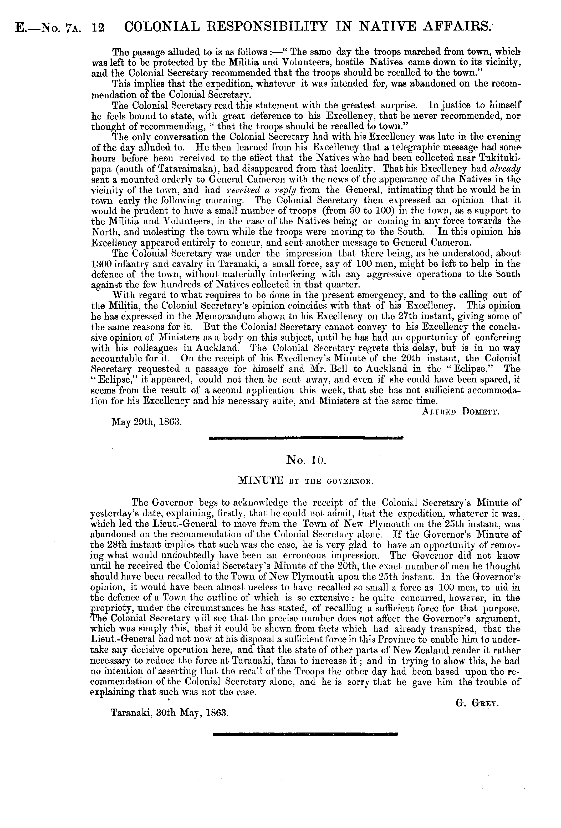 No. 10, MINUTE by Tns goyebnoh. The Governor begs to acknowledge the receipt of the Colonial Secretary's Minute of yesterday's date, explaining, firstly, that he could not admit, that the expedition, whatever it was, which led the Lieut.-General to move from the Town of New Plymouth on the 25th instant, was abandoned on the recommendation of the Colonial Secretary alone. If the Governor's Minute of the 28th instant implies that such was the case, he is very glad to have an opportunity of removing what would undoubtedly have been an erroneous impression. The Governor did not know until he received the Colonial Secretary's Minute of the 20th, the exact number of men he thought should have been recalled to the Town of New Plymouth upon the 25th instant. In the Governor's opinion, it would have been almost useless to have recalled so small a force as 100 men, to aid in the defence of a Town the outline of which is so extensive : he quite concurred, however, in the propriety, under the circumstances he has stated, of recalling a sufficient force for that purpose. The Colonial Secretary will see that the precise number does not affect the Governor's argument, which was simply this, that it could be shewn from facts which had already transpired, that the Lieut.-General had not now at his disposal a sufficient force in this Province to enable him to undertake any decisive operation here, and that the state of other parts of New Zealand render it rather necessary to reduce the force at Taranaki, than to increase it; and in trying to show this, he had no intention of asserting that the recall of the Troops the other day had been based upon the recommendation of the Colonial Secretary alone, and he is sorry that he gave him the trouble of explaining that such was not the case. G. Gbey. Taranaki, 30th May, 1863.