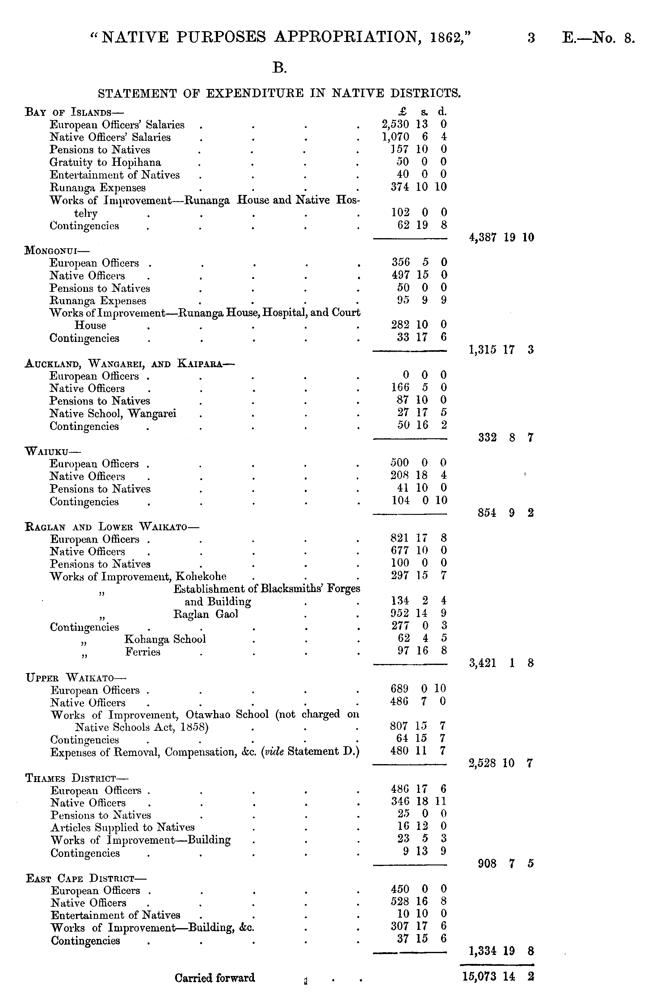 Bay of Islands— European Officers' Salaries .... Native Officers' Salaries .... Pensions to Natives .... Gratuity to Hopihana .... Entertainment of Natives .... Runanga Expenses .... Works of Improvement —Runanga House and Native Hostelry ..... Contingencies ..... £ s. d. 2,530 13 0 1,070 6 4 157 10 0 50 0 0 40 0 0 374 10 10 102 0 0 62 19 8 4,387 19 10 Mongoxui— European Officers ..... Native Officers ..... Pensions to Natives .... Runanga Expenses .... Works of Improvement—Runanga House, Hospital, and Court House ..... Contingencies ..... 35G 5 0 497 15 0 50 0 0 95 9 9 282 10 0 33 17 6 1,315 17 3 Auckland, Wangarei, and Kaipaba— European Officers ..... Native Officers ..... Pensions to Natives .... Native School, Wangarei .... Contingencies ..... 0 0 0 166 5 0 87 10 0 27 17 0 50 16 2 332 8 7 Waiuku— European Officers ..... Native Officers ..... Pensions to Natives .... Contingencies ..... 500 0 0 208 18 4 41 10 0 104 0 10 854 9 2 Raglan and Lower Waikato— European Officers ..... Native Officers ..... Pensions to Natives .... Works of Improvement, Kohekohe „ Establishment of Blacksmiths' Forges and Building „ Raglan Gaol Contingencies ..... „ Kohanga School „ Ferries .... 821 17 8 677 10 0 100 0 0 297 15 7 134 2 4 952 14 9 277 0 3 62 4 5 97 16 8 3,421 1 8 Upper Waikato — European Officers ..... Native Officers ..... Works of Improvement, Otawhao School (not charged on Native Schools Act, 1858) Contingencies ..... Expenses of Removal, Compensation, ifec. (vide Statement D.) 689 0 10 486 7 0 807 15 7 64 15 7 480 11 7 2,528 10 7 Thames District— European Officers ..... Native Officers ..... Pensions to Natives .... Articles Supplied to Natives Works of Improvement —Building Contingencies ..... 486 17 6 346 18 11 25 0 0 16 12 0 23 5 3 9 13 9 908 7 5 East Cape District— European Officers ..... Native Officers ..... Entertainment of Natives .... Works of Improvement—Building, &c. Contingencies ..... 450 0 0 528 16 8 10 10 0 307 17 6 37 15 6 1,334 19 8 Carried forward 3 15,073 U 2 15,073 U 2
