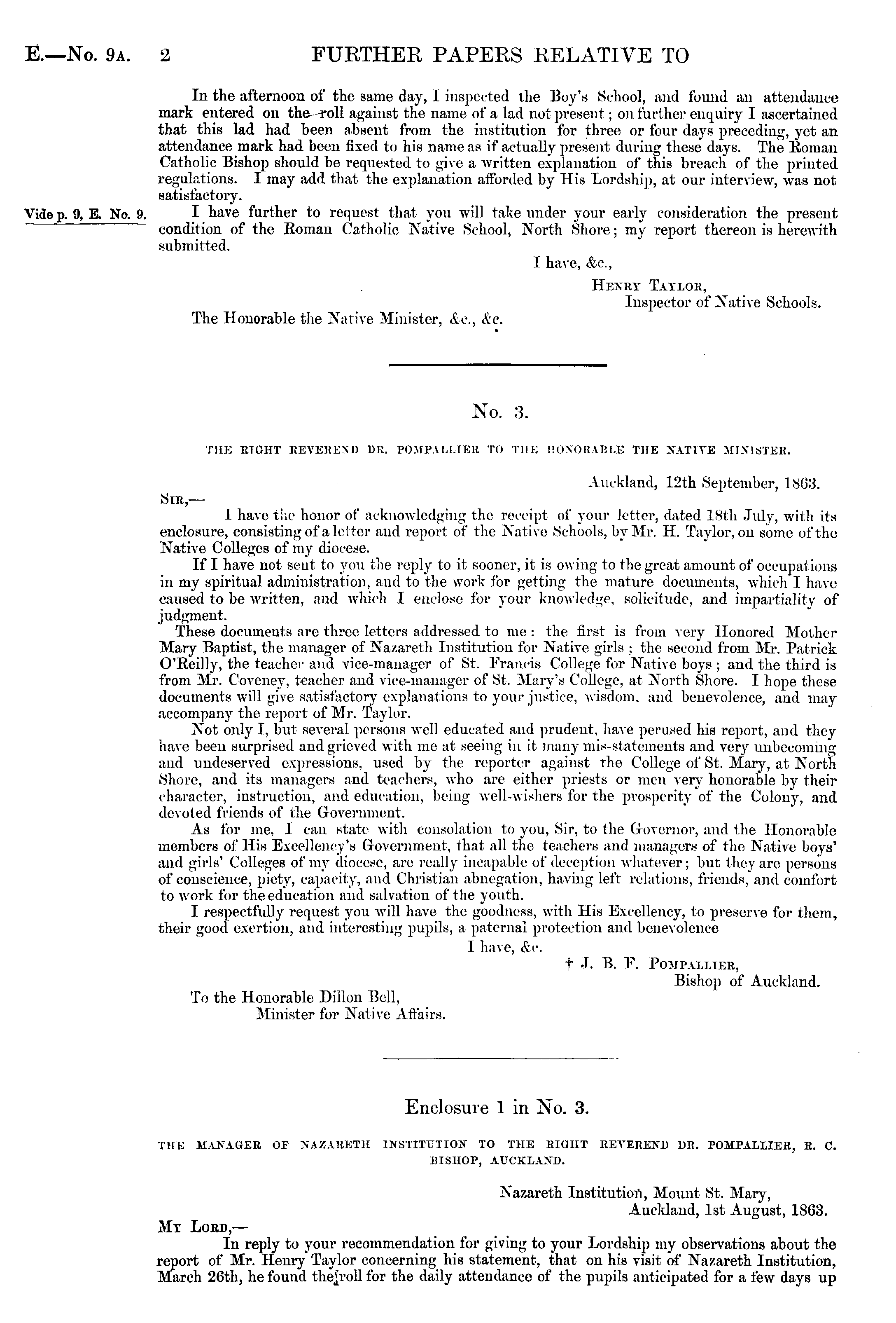 Enclosure 1 in No. 3. THE MANAGER OF NAZARETH INSTITUTION TO THE RIGHT REVEREND DR. POMPALLIER, H. C. BISHOP, AUCKLAND. Nazareth Institution, Mount St. Mary, Auckland, Ist August, 1863. Air Lord, — In reply to your recommendation for giving to your Lordship my observations about the report of Mr. Henry Taylor concerning his statement, that on his visit of Nazareth Institution, Alarch 26th, he found thejroll for the daily attendance of the pupils anticipated for a feAV days up