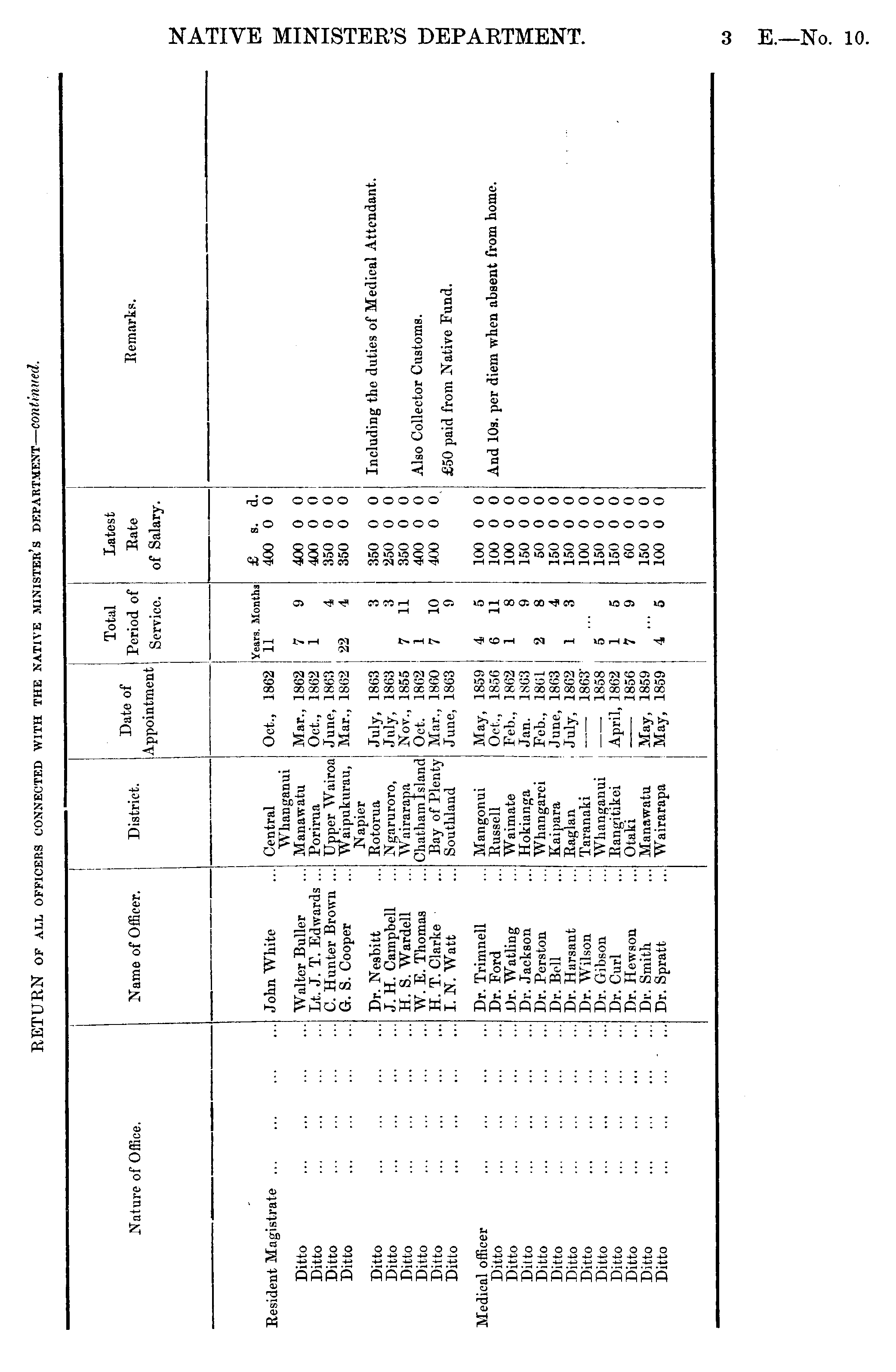 RETURN OF ALL OFFICERS CONNECTED WITH THE NATIVE MINISTER'S DEPARTMENT — Continued. Total Latest District. Date of Period of Rate Eemarks. Nature of Office. Name of Officer. Appointment Service. of Salary. Resident Magistrate ... John White Central Whanganui Manawatu Porirua Upper Wairoa W aipukurau, Napier Rotorua Ngaruroro, Wairarapa Chatham Island Bay of Plenty Southland Years. Months Oct., 1862 11 Mar., 1862 7 9 Oct., 1862 1 i June, 1863 4 Mar., 1862 22 4 July, 1863 3 July, 1863 3 Nov., 1855 7 11 I Oct, 1862 1 • Mar., 1860 7 10 June, 1863 9 £ s. d. 400 0 0 Ditto Ditto Ditto Ditto Walter Buller Lt. J. T. Edwards ... C. Hunter Brown ... G. S. Cooper 400 0 0 400 0 0 350 0 0 350 0 0 Ditto Ditto Ditto Ditto Ditto Ditto Dr. Nesbitt J.H.Campbell ... H. S. Wardell W. E. Thomas H.T.Clarke I. N. Watt 350 0 0 250 0 0 350 0 0 400 0 0 400 0 0 Including the duties of Medical Attendant. Also Collector Customs. £50 paid from Native Fund. Medical officer Ditto Ditto Ditto Ditto Ditto Ditto Ditto Ditto Ditto Ditto Ditto Ditto Dr. Trimnell Dr. Ford l)r. Watling Dr. Jackson Dr. Peraton Dr. Bell Dr. Harsant Dr. Wilson Dr. Gibson Dr. Curl Dr. Hewson Dr. Smith Dr. Spratt Mangonui Russell Waimate Hokianga Whangarei Kaipara Raglan Taranaki Whanganui Rangitikei Otaki Manawatu Wairarapa May, 1859 4 5 Oct., 1856 6 11 Feb., 1862 1 8 Jan. 1863 9 Feb., 1801 2 8 June, 1863 4 July, 1862 1 3 1863' 1858 5 April, 1862 1 5 1856 7 9 May, 1859 May, 1859 4 5 100 0 0 100 0 0 100 0 0 150 0 0 50 0 0 150 0 0 150 0 0 100 0 0 150 0 0 150 0 0 60 0 0 150 0 0 100 0 0 And 10s. per diem when absent from home.