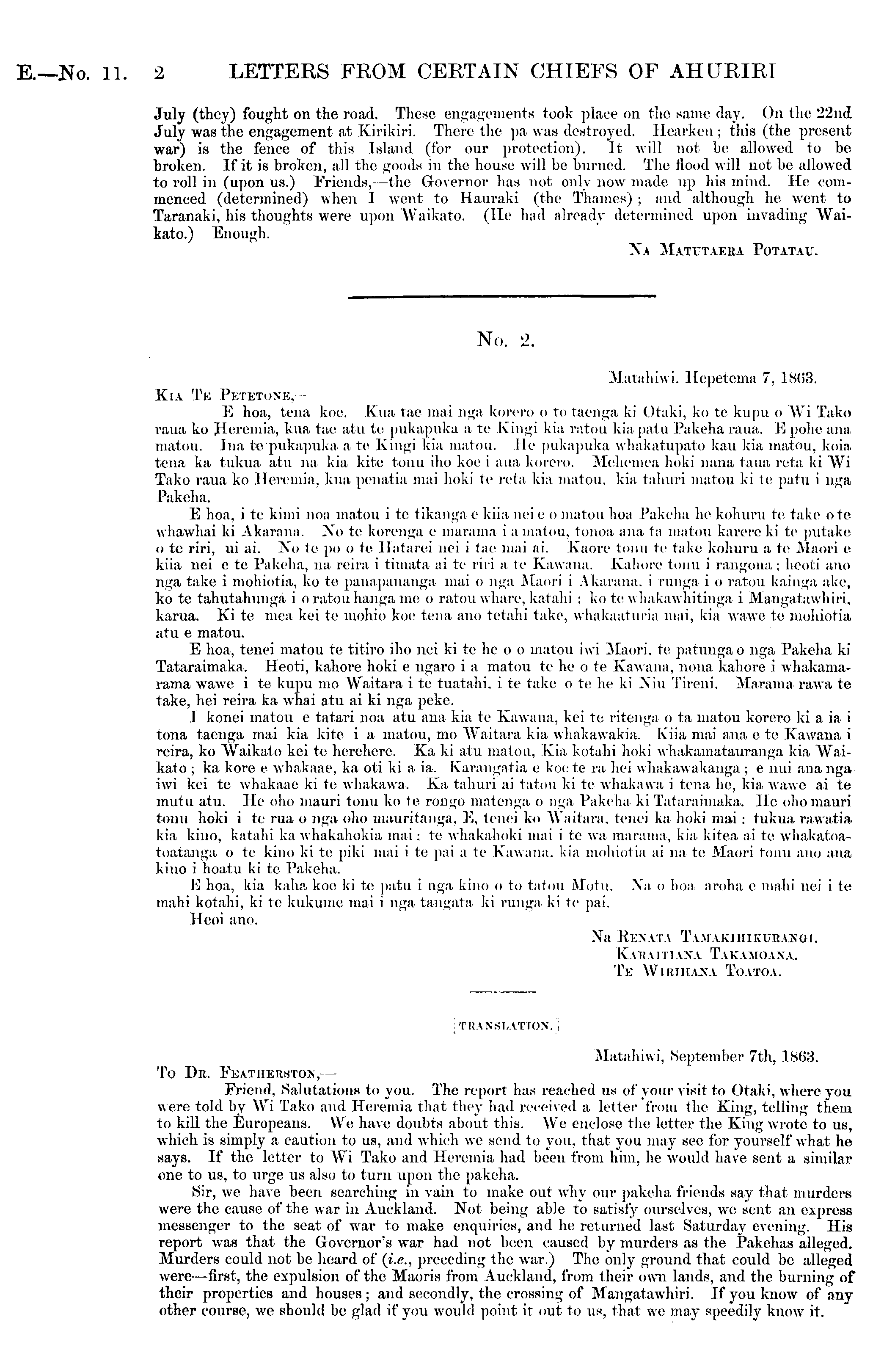 No. 2. Mataliiwi, Hepetema 7, 1803. Kia Te Petetone, — E hoa, tena koe. Kua tae inai nga korero oto taenga ki Otaki, ko te kupu oWi Tako raua ko Heremia, kua tac atu to pukapuka a te Kingi kia ratou kiapatu Pakeha raua. E polic ami matou. Ina te pukapuka ato Kmgi kia matou. He pukapuka whakatupato kau kia inatou, koia tena ka tukua atu na kia kite tonu iho koe i aua korero. Meheinea hoki nana taua reta ki Wi Tako raua ko Heremia, kua penatia mai lioki te reta kia matou, kia tahuri inatou kite patu i nga Pakeha. E hoa, i te kimi lioa inatou i te tikanga c kiia nei c o inatou hoa Pakeha he kohuru te take o te whawhai ki Akarana. No te korenga c marama i a inatou, tonoa ana ta inatou karere kite putake ote riri, vi ai. No te po ote Hatarei nei i tae mai ai. Kaore tonu te take kohuru ate Maori c kiia nei etc Pakeha, na reira i timata ai te riri ate Kawana. Kahore tonu i rangona ; heoti ano nga take i mohiotia, ko te panapananga mai o nga Maori i Akarana. i runga i o ratou kainga ake, ko te tahutahunga i o ratou hanga me o ratou whare, katahi ; ko te whakawhitinga i Mangatawhiri, karua. . Xi te mea kei te mohio koe tena ano tetahi take, wfaakaaturia mai, kia wawe te mohiotia atu c matou. E hoa, tenei matou te titiro iho nei kite he o o matou iwi Maori, te patunga o nga Pakeha ki Tataraimaka. Heoti, kahore hoki c ngaro i a matou te he ote Kawana, nona kahore i whakamarama wawe i te kupu mo Waitara ite tuatahi, ite take otehe ki Niu Tireni. Marama rawa te take, hei reira ka whai atu ai ki nga peke. I konei matou c tatari noa atu ana kia te Kawana, kei te ritenga o ta inatou korero ki a ia i tona taenga mai kia kite i a matou, mo Waitara kia wliakawakia. Kiia mai ana etc Kawana i reira, ko Waikato kei te herehere. Ka ki atu matou, Kia kotahi hoki whakainatauranga kia Waikato ; ka kore c whakaae, ka oti ki a ia. Karangatia c koe te ra hei whakawakanga ; c nui ana nga iwi kei te whakaae kite whakawa. Ka tahuri ai tatou kite whakawa i tena he, kia wawe ai te mutu atu. He oho mauri tonu ko te rongo matenga o nga Pakeha ki Tataraimaka. He oho mauri tonu hoki i te rua o nga oho mauritanga, E, tenei ko Waitara, tenei ka hoki mai; tukua rawatia kia kino, katahi ka whakahokia mai; te whakahoki mai ite wa marama, kia kitea ai te whakatoatoatanga o te kino kite piki mai i te pai a te Kawana, kia mohiotia ai na te Maori tonu ano ana kino i hoatu kite Pakeha. E hoa, kia kaha koe kite patu i nga kino oto tatou Motu. Na o hoa aroha c mahi nei ite mahi kotahi, kite kukume mai i nga tangata ki runga kite pai. Heoi ano. Na Rex at a Tamakihikuranch. Kara iti ana Takamoana. Te Wirihajs'a Toatoa. [translation.] Matahiwi, September 7th, 1863. To Dr. Peatherston, — Friend, Salutations to you. The report has reached us of your visit to Otaki, where you were told by Wi Tako and Heremia that they had received a letter from the King, telling them to kill the Europeans. We have doubts about this. We enclose the letter the King wrote to us, which is simply a caution to us, and which we send to you, that you may see for yourself what he says. If the letter to Wi Tako and Heremia had been from him, lie would have sent a similar one to us, to urge us also to turn upon the pakeha. Sir, we have been searching in vain to make out why our pakelia friends say that murders were the cause of the war in Auckland. Not being able to satisfy ourselves, we sent an express messenger to the seat of war to make enquiries, and he returned last Saturday evening. His report was that the Governor's war had not been caused by murders as the Pakehas alleged. Murders could not be heard of {i.e., preceding the war.) The only ground that could be alleged were —first, the expulsion of the Maoris from Auckland, from their own lands, and the burning of their properties and houses ; and secondly, the crossing of Mangatawhiri. If you know of any other course, we should be glad if you would point it out to us, that we may speedily know it.