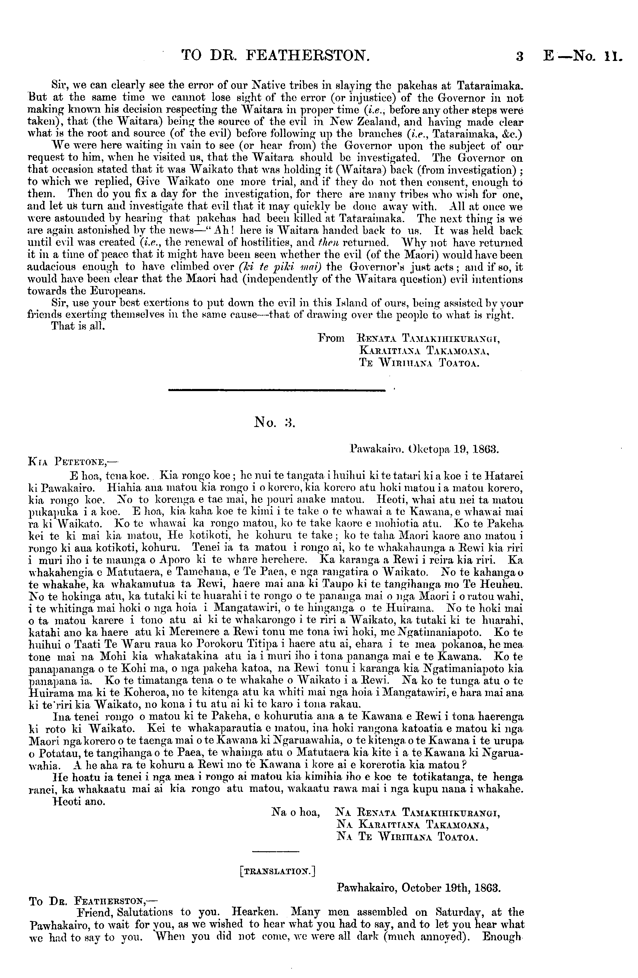 [translation.] Pawhakairo, October 19th, 18G3. To Dr. Featiterston, — Friend, Salutations to you. Hearken. Many men assembled on Saturday, at the Pawhakairo, to wait for you, as we wished to hear what you had to say, and to let you hear what we had to say to you. When you did not come, we were all dark (much annoyed). Enough