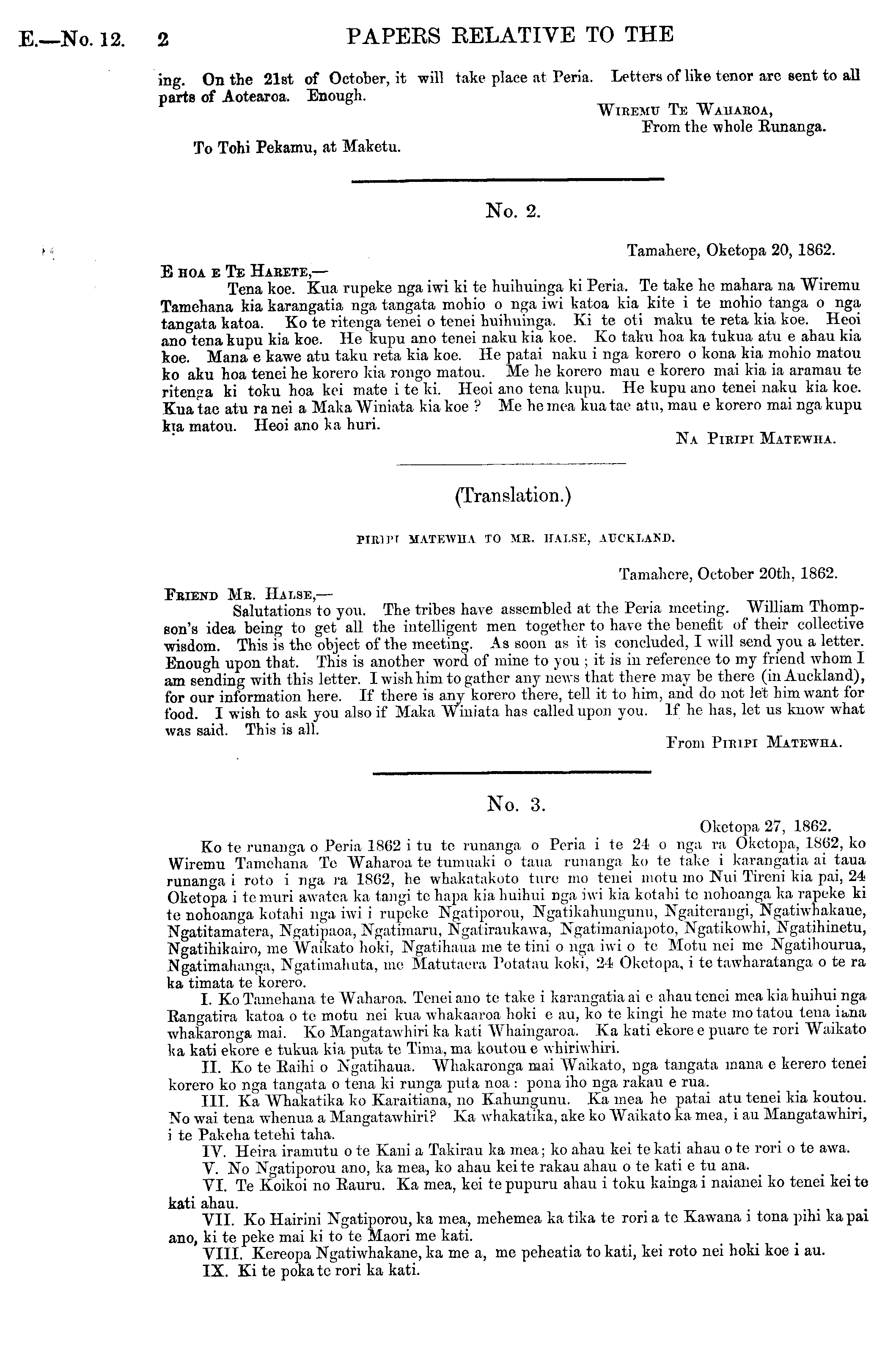 No. 3. Oketopa 27, 1862. Ko te runanga o Peria 1862 i tv tc runanga o Peria i te 24 o nga ra Oketopa, 1862, ko Wiremu Tamehana Te "Waharoa te tumuaki o taua runanga ko te take i karangatia ai taua runanga i roto i nga ra 1862, he whakatakoto ture mo tenei motu mo Nui Tireni kia pai, 24 Oketopa i te muri awatea ka tangi te hapa kia huihui nga iwi kia kotahi te nohoanga ka rapeke ki te nohoanga kotahi nga iwi i rupeke Ngatiporou, Ngatikahungunu, Ngaiterangi, Ngatiwhakaue, Ngatitamatera, Ngatipaoa, Ngatimaru, Ngatiraukawa, Ngatimaniapoto, Ngatikowhi, Ngatihinetu, Ngatihikairo, me "Waikato hoki, Ngatihaua me te tini o nga iwi o te Motu nei me Ngatihourua, Ngatimahanga, Ngatimahuta, me Matutaera Potatau koki, 24 Oketopa, i te tawharatanga o te ra ka timata te korero. I. Ko Tamehana te "Waharoa. Tenei ano te take i karangatia ai c ahau tenei mea kia huihui nga Eangatira katoa o te motu nei kua whakaaroa hoki c au, ko te kingi he mate mo tatou tena iana whakaronga mai. Ko Mangatawhiri ka kati "Whaingaroa. Ka kati ekore c puaro te rori "Waikato ka kati ekore c tukua kia puta te Tima, ma koutou c whiriwhiri. 11. Ko te Eaihi o Ngatihaua. "Whakaronga mai "Waikato, nga tangata mana c kerero tenei korero ko nga tangata o tena ki runga puta noa : pona iho nga rakau c rua. 111. Ka "Whakatika ko Karaitiana, no Kahungunu. Ka mea he patai atu tenei kia koutou. No wai tena whenua a Mangatawhiri? Ka whakatika, ake ko "Waikato ka mea, iau Mangatawhiri, i te Pakeha tetehi taha. IV. Heira iramutu ote Kani a Takirau ka mea; ko ahau kei te kati ahau ote rori o te awa. V. No Ngatiporou ano, ka mea, ko ahau kei te rakau ahau ote katie tv ana. VI. Te Koikoi no Eauru. Ka mea, kei te pupuru ahau i toku kainga i naianei ko tenei kei te kati ahau. VII. Ko Hairini Ngatiporou, ka mea, mehemea ka tika te rori a te Kawana i tona pihi ka pai ano, kite peke mai ki to te Maori me kati. VIII. Kereopa Ngatiwhakane, ka me a, me peheatia to kati, kei roto nei hoki koe i au. IX. Xi te poka te rori ka kati.