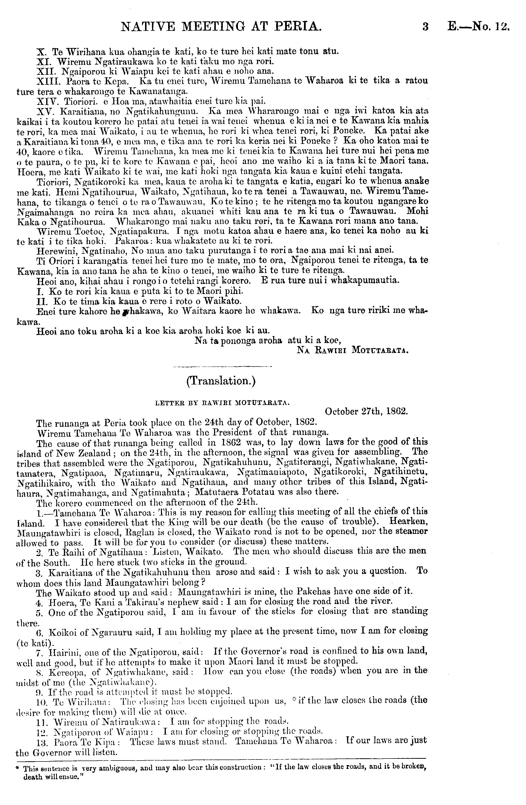 (Translation.) letter by rawihi motutabata. October 27th, 1862. The runanga at Peria took place on the 24th day of October, 1862. Wiremu Tamehana Te Waharoa was the President of that runanga. Tho cause of that runanga being called in 1862 was, to lay down laws for the good of this island of New Zealand ; on the 24th, in the afternoon, the signal was given for assembling. The tribes that assembled were the Ngatiporou, Ngatikahuhunu, Ngatiterangi, Ngatiwhakane, Ngatitamatera, Ngatipaoa, Ngatimaru, Ngatiraukawa, Xgathnaniapoto, Ngatikoroki, Ngatihinetu, Ngatihikairo, with the Waikato and Ngatihaua, and many other tribes of this Island, Ngatihaura, Ngatimahanga, and Ngatimahuta; Matutaera Potatau was also there. The korero commenced on the afternoon of the 24th. 1.—Tamehana Te Waharoa: This is my reason for calling this meeting of all the chiefs of this Island. I have considered that the King will be our death (be the cause of trouble). Hearken, Maungatawhiri is closed, Eaglan is closed, the Waikato road is not to be opened, nor the steamer allowed to pass. It will be for you to consider (or discuss) these matters. 2. Te Eaihi of Ngatihaua : Listen, Waikato. The men who should discuss this are the men of the South. He here stuck two sticks in the ground. 3. Karaitiana of the Ngatikahuhunu then arose and said : I wish to ask you a question. To whom does this land Maungatawhiri belong ? The Waikato stood up and said : Maungatawhiri is mine, the Pakehas have one side of it. 4. Hoera, Te Kani a Takirau's nephew said : I am for closing the road and the river. 5. One of the Ngatiporou said, I am iv favour of the sticks for closing that arc standing there. , 6. Koikoi of Ngarauru said, I am holding my place at the present time, now I am for closing (te kati). . 7. Hairini, one of the Ngatiporou, said: If the Governor's road is confined to his own land, well and good, but if he attempts to make it upon Maori land it must be stopped. 8. Kereopa, of Ngatiwhakane, said: How can you close (the roads) when you are in the midst of mo (the Ngatiwhakane). 9. If the road is attempted it must be stopped. 10. Te Wirihana: The ilosing has been enjoined upon us, •if the law closes the roads (the desire for making them) will die at once. 11. Wiremu of Natiraukawa: lam for stopping the roads. 12. Ngatiporou of Waiapu : I am for closing or stopping the roads. 13. Paora Te Kipa : These laws must stand. Tamehana Te Waharoa :If our laws are just tho Governor will listen. * This sentence is very ambiguous, and may also Lear this construction : "If the law closes the roads, and it be brokeD, death will ensue."