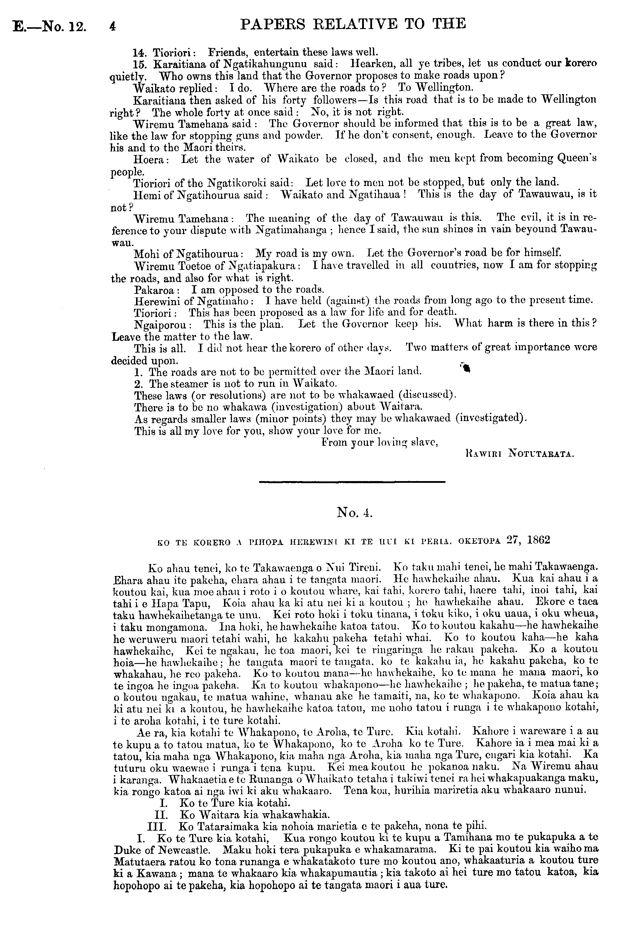 14. Tioriori: Friends, entertain these laws well. 15. Karaitiana of Ngatikahungunu said: Hearken, all ye tribes, let us conduct our korero quietly. Who owns this land that the Governor proposes to make roads upon? Waikato replied: I do. Where are the roads to ? To Wellington. Karaitiana then asked of his forty followers—Is this road that is to be made to Wellington right ? The whole fortv at once said : No, it is not right. Wiremu Tamehana said : The Governor should be informed that this is to be a great law, like the law for stopping guns and powder. If he don't consent, enough. Leave to the Governor his and to the Maori theirs. Hoera: Let the water of Waikato be closed, and the men kept from becoming Queen's people. Tioriori of the Ngatikoroki said: Let love to men not be stopped, but only the land. Hemi of Ngatihourua said : Waikato and Ngatihaua ! This is the day of Tawauwau, is it not? Wiremu Tamehana: The meaning of the day of Tawauwau is this. The evil, it is in reference to your dispute with Ngatimahanga ; hence I said, the sun shines in vain beyound Tawauwau. Mohi of Ngatihourua: My road is my own. Let the Governor's road be for himself. Wiremu Toetoe of Ngatiapakura: I have travelled in all countries, now I am for stopping the roads, and also for what is right. Pakaroa : I am opposed to the roads. Herewini of Ngatinaho : 1 have held (against) the roads from long ago to the present time. Tioriori: This has been proposed as a law for life and for death. Ngaiporou : This is the plan. Let the Governor keep his. What harm is there in this ? Leave the matter to the law. This is all. I did not hear the korero of other days. Two matters of great importance wore decided upon. 1. The roads are not to be permitted over the Maori land. 2. The steamer is not to run in Waikato. These laws (or resolutions) are not to be whakawaed (discussed). There is to be no whakawa (investigation) about Waitara. As regards smaller laws (minor points) they may be whakawaed (investigated). This is all my love for you, show your love for me. From your loving slave, Rawiri Notutarata.