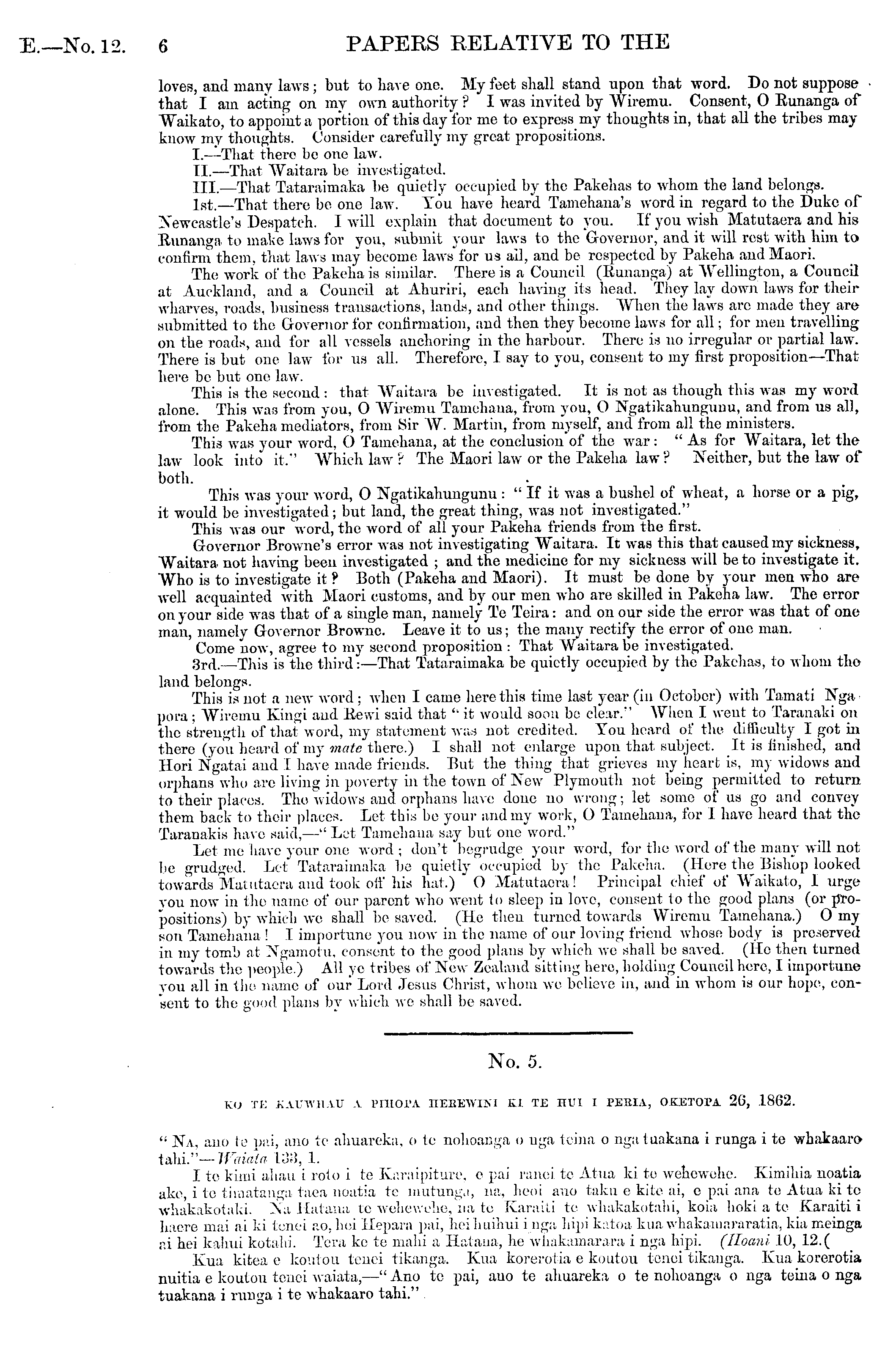 loves, and many laws ; but to have one. My feet shall stand upon that word. Do not suppose that I am acting on my own authority ? I was invited by AViremu. Consent, O Runanga of Waikato, to appoint a portion of this day for me to express my thoughts in, that all the tribes mayknow my thoughts. Consider carefully my great propositions. I.—That there be one law.