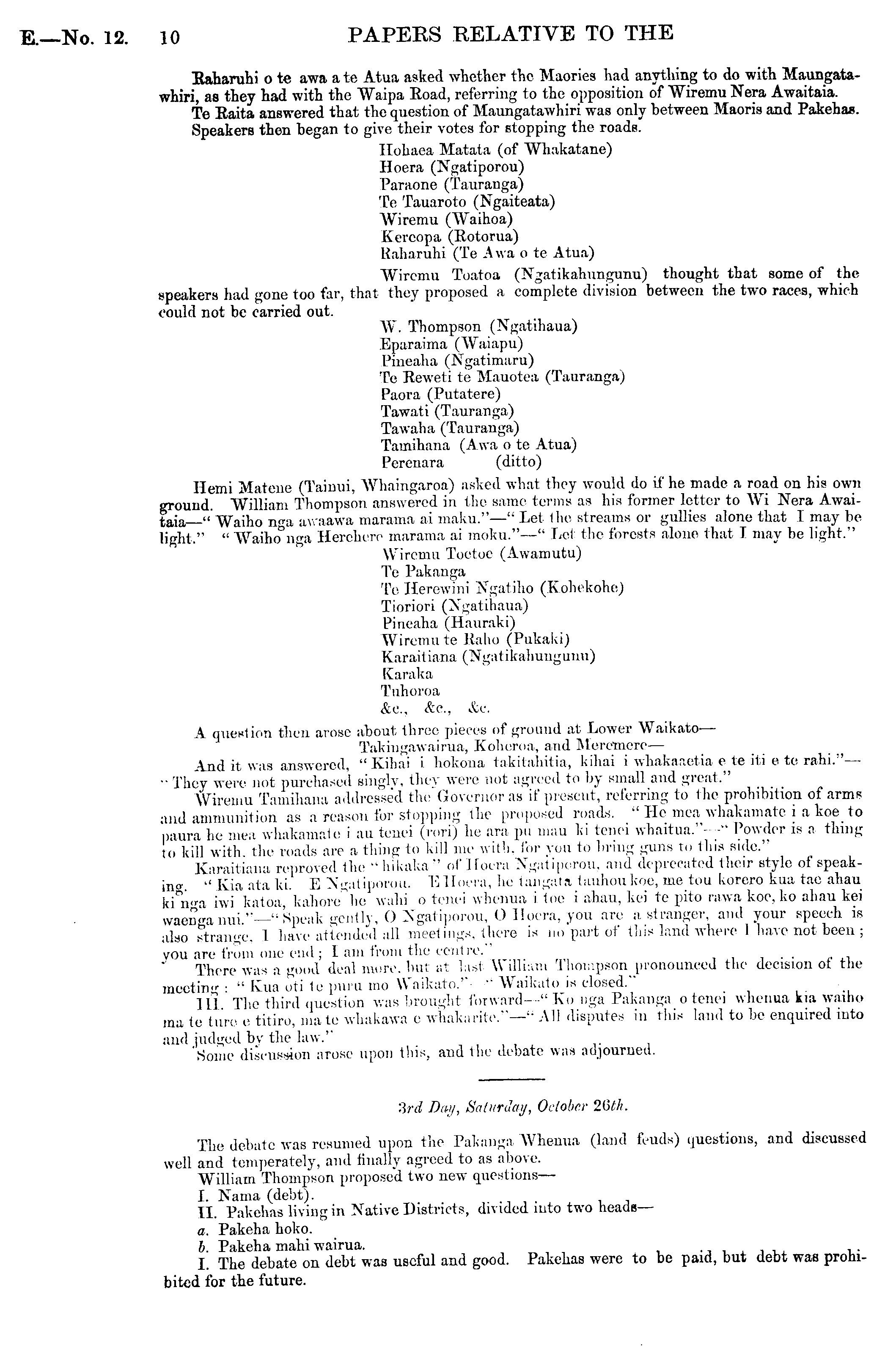 Eaharuhi o te awa ate Atua asked whether the Maories had anything to do with Maungatawhiri, as they had with the Waipa Eoad, referring to the opposition of Wiremu Nera Awaitaia. Te Eaita answered that the question of Maungatawhiri was only between Maoris and Pakehas. Speakers then began to give their votes for stopping the roads. Hohaea Matata (of Whakatane) Hoera (Ngatiporou) Paraone (Tauranga) Te Tauaroto (Ngaiteata) Wiremu (Waihoa) Kereopa (Eotorua) Kaharuhi (Te Awa o te Atua) Wiremu Toatoa (Ngatikahungunu) thought that some of the speakers had gone too far, that they proposed a complete division between the two races, which could not be carried out. W. Thompson (Ngatihaua) Eparaima (Waiapu) Pineaha (Ngatimaru) Te Eeweti te Mauotea (Tauranga) Paora (Putatere) Tawati (Tauranga) Tawaha (Tauranga) Tamihana (Awa o te Atua) Perenara (ditto) Hemi Matene (Tainui, Whaingaroa) asked what they would do if he made a road on his own ground. William Thompson answered in the same terms as his former letter to Wi Nera Awaitaia "Waiho nga av.aawa marama ai maku."—" Let the streams or gullies alone that I may be light." " Waiho°nga Herehere marama ai moku." —" Let the forests alone that I may be light." Wiremu Toetoe (Awamutu) Te Pakanga Te Herewini Ngatiho (Kohekohe.) Tioriori (Ngatihaua) Pineaha (Hauraki) Wiremu te Eaho (Pukaki) Karaitiana (Ngatikahungunu) Karaka ■ Tuhoroa &c., &c, &c. A question then arose about three pieces of ground at Lower Waikato — Takingawairua, Koheroa, and Meretoere— And it was answered, " Kihai i hokona takitahitia, kihai i whakaaetia c te iti c te rahi."— " They were not purchased singly. they were not agreed to by small and great." Wiremu Tamihana addressed the Governor as if present, referring to the prohibition of arms and ammunition as a reason for stopping the proposed roads. "He mea whakamate i a koe to paura he mea whakamate iau tenei (rori) he ara pu man ki tenei whaitua." —" Powder is a thing to kill with, the roads are a thing to kill me with, for you to bring eons to this side." Karaitiana reproved the " hikaka " of Hoera Ngatiporou, and deprecated their style of speaking " Kia ata ki. E Ngatiporou. E Hoera, he tangata tauhou koe, me tou korero kua tae ahau ki nga iwi katoa, kahore he wahi o tenei whenua i toe i ahau, kei te pito rawa koe, ko ahau kei waenga nui "—" Speak gently, O Ngatiporou, 0 Hoera, you are a stranger, and your speech is also strange, 1 have attended all meetings, there is no part of this land where 1 have not been ; you are from one end; lam from the centre." . . There was a good deal more, but at last William Thompson pronounced the decision ot the meet-in"- ■ " Kua oti te puru mo Waikato."—" Waikato is closed." 11l The third question was brought forward—" Ko nga Pakanga o tenei whenua kia waiho ma te ture c titiro, ma tc whakawa c whakarite."—" All disputes in this land to be enquired into and judged by the law." 'Some discussion arose upon this, and the debate was adjourned. 3rd Day, Saturday, October 26th. The debate was resumed upon the Pakanga Whenua (land feuds) questions, and discussed well and temperately, and finally agreed to as above. William Thompson proposed two new questions — I. Kama (debt). ■ , 11. Pakehas living in Native Districts, divided into two heads — a. Pakeha hoko. 6. Pakeha mahi wairua. I. The debate on debt was useful and good. Pakehas were to be paid, but debt was prohibited for the future.