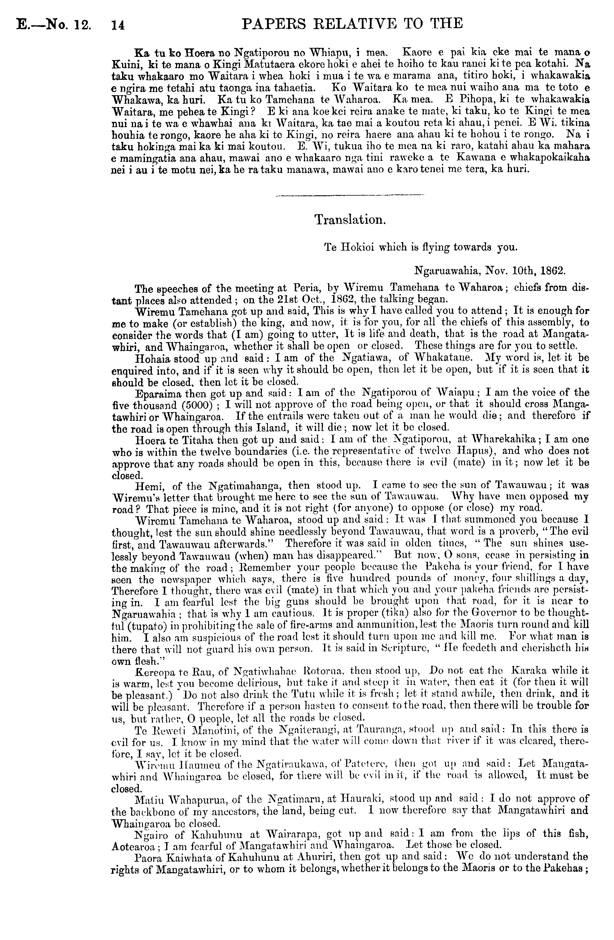 Translation. Te Hokioi which is flying towards you. Ngaruawahia, Nov. 10th, 1862. The speeches of the meeting at Peria, by Wiremu Tamehana te Waharoa; chiefs from distant places also attended ; on the 21st Oct., 1862, the talking began. Wiremu Tamehana got up and said, This is why I have called you to attend ; It is enough for me to make (or establish) the king, and now, it is for you, for all the chiefs of this assembly, to consider the words that (I am) going to utter, It is life and death, that is the road at Mangatawhiri, and Whaingaroa, whether it shall be open or closed. These things are for you to settle. Hohaia stood up and said : lam of the Ngatiawa, of Whakatane. My word is, let it be enquired into, and if it is seen why it should be open, then let it be open, but if it is seen that it should be closed, then let it be closed. Eparaima then got up and said: lam of the Ngatiporou of Waiapu; lam the voice of the five thousand (5000) ; I will not approve of the road being open, or that it should cross Mangatawhiri or Whaingaroa. If the entrails were taken out of a man he would die; and therefore if the road is open through this Island, it will die; now let it be closed. Hoera te Titaha then got up and said: lam of the Ngatiporou, at Wharekahika; lam one who is within the twelve boundaries (i.e. the representative of twelve Hapus), and who does not approve that any roads should be open in this, because there is evil (mate) in it; now let it be closed. Hemi, of the Ngatimahanga, then stood up. I came to see the sun of Tawauwau ; it was Wiremu's letter that brought me here to see the sun of Tawauwau. Why have men opposed my road? That piece is mine, and it is not right (for anyone) to oppose (or close) my road. Wiremu Tamehana te Waharoa, stood up and said : It was I that summoned you because I thought, test the sun should shine needlessly beyond Tawauwau, that word is a proverb, "The evil first, and Tawauwau afterwards." Therefore it was said in olden times, " The sun shines uselessly beyond Tawauwau (when) man has disappeared." But now, O sons, cease in persisting in the making of the road; Eemember your people because the Pakeha is your friend, for I have seen the newspaper which says, there is five hundred pounds of money, four shillings a day, Therefore I thought, there was evil (mate) in that which you and your pakeha friends are persisting in. lam fearful lest the big guns should be brought upon that road, for it is near to Ngaruawahia ; that is why I am cautious. It is proper (tika) also for the Governor to be thoughtful (tupato) in prohibiting the sale of fire-arms and ammunition, lest the Maoris turn round and kill him. I also am suspicious of the road lest it should turn upon me and kill me. For what man is there that will not guard his own person. It is said in Scripture, "He feedeth and eherisheth his own flesh." Kereopa te Eau, of Ngatiwhahae Eotorua, then stood up, Do not eat the Karaka while it is warm, leet you become delirious, but take it and steep it in water, then eat it (for then it will be pleasant.) Do not also drink the Tutu while it is fresh ; let it stand awhile, then drink, and it will be pleasant. Therefore if a person hasten to consent to the road, then there will be trouble for us, but rather, 0 people, let all the roads be closed. Te Eeweti Manotini, of the Ngaiterangi, at Tauranga, stood up and said: In this there is evil for us. I know in my mind that the water will come down that river if it was cleared, therefore, I say, let it be closed. Wiivinu Haumeu of the Ngatiraukawa, of Patetere, then got up and said: Let Mangatawhiri and Whaingaroa be closed, for there will be evil in it, if the road is allowed, It must be closed. Matiu Wahapurua, of the Ngatimaru, at Hauraki, stood up and said : I do not approve of the backbone of my ancestors, the land, being cut. I now therefore say that Mangatawhiri and Whaingaroa be closed. Ngairo of Kahuhunu at Wairarapa, got up and said: I am from the lips of this fish, Aotearoa; lam fearful of Mangatawhiri and Whaingaroa. Let those be closed. Paora Kaiwhata of Kahuhunu at Ahuriri, then got up and said: We do not understand the rights of Mangatawhiri, or to whom it belongs, whether it belongs to the Maoris or to the Pakehas ;