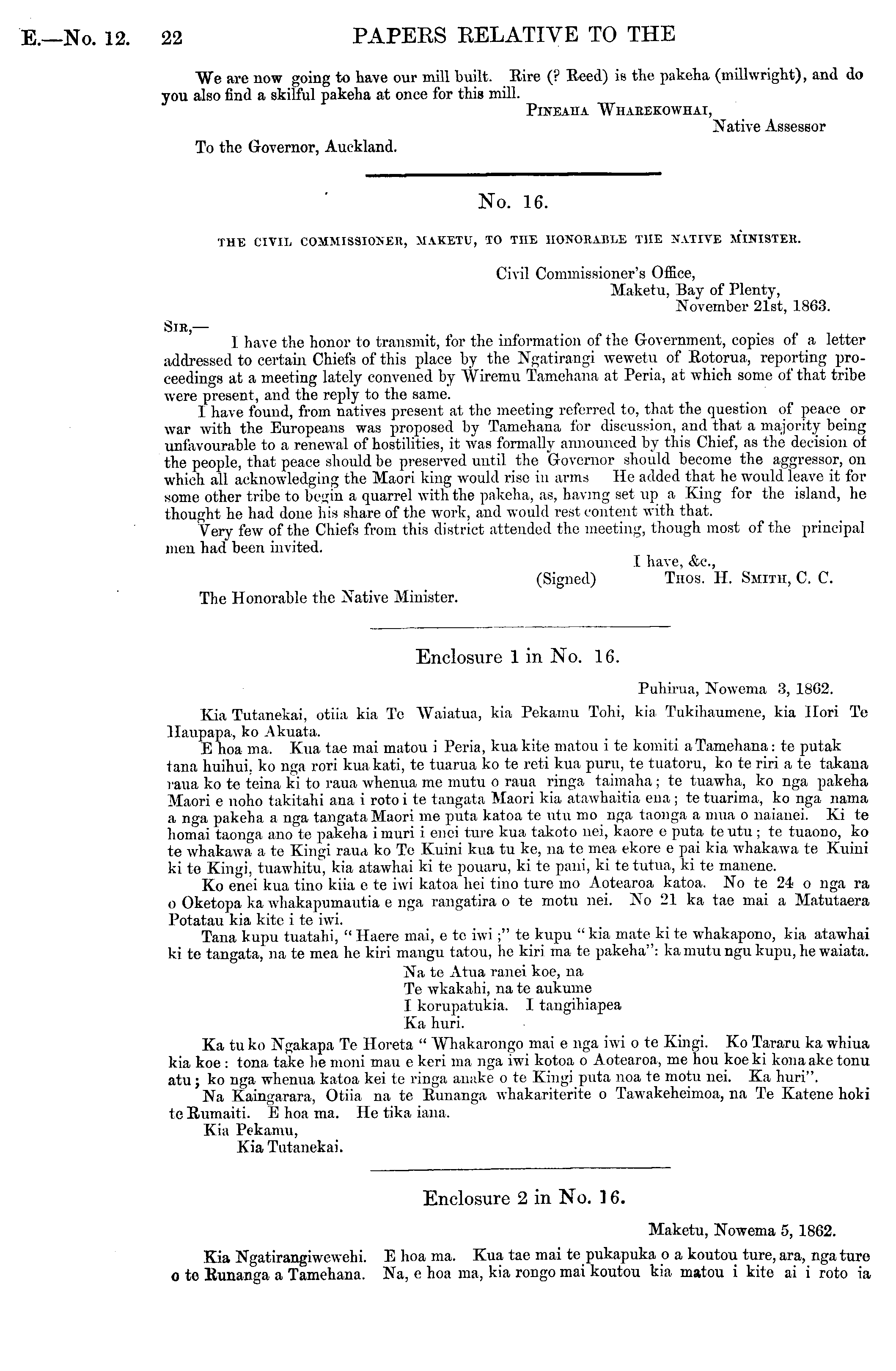 No. 16. THE CIVIL COMMISSIONER, MAKETU, TO THE HONORABLE THE NATIVE MINISTER. Civil Commissioner's Office, Maketu, Bay of Plenty, November 21st, 1863. Sir — I have the honor to transmit, for the information of the Government, copies of a letter addressed to certain Chiefs of this place by the Ngatirangi wewetu of Eotorua, reporting proceedings at a meeting lately convened by Wiremu Tamehana at Peria, at which some of that tribe were present, and the reply to the same. I have found, from natives present at tho meeting referred to, that the question of peace or war with the Europeans was proposed by Tamehana for discussion, and that a majority being unfavourable to a renewal of hostilities, it was formally announced by this Chief, as the decision of the people, that peace should be preserved until the Governor should become the aggressor, on which all acknowledging the Maori king would rise in arms He added that he would leave it for some other tribe to be^in a quarrel with the pakeha, as, having set up a King for the island, he thought he had done his share of the work, and would rest content with that. Very few of the Chiefs from this district attended the meeting, though most of the principal men had been invited. I have, &c, (Signed) Thos. H. Smith, C. C. The Honorable the Native Minister.