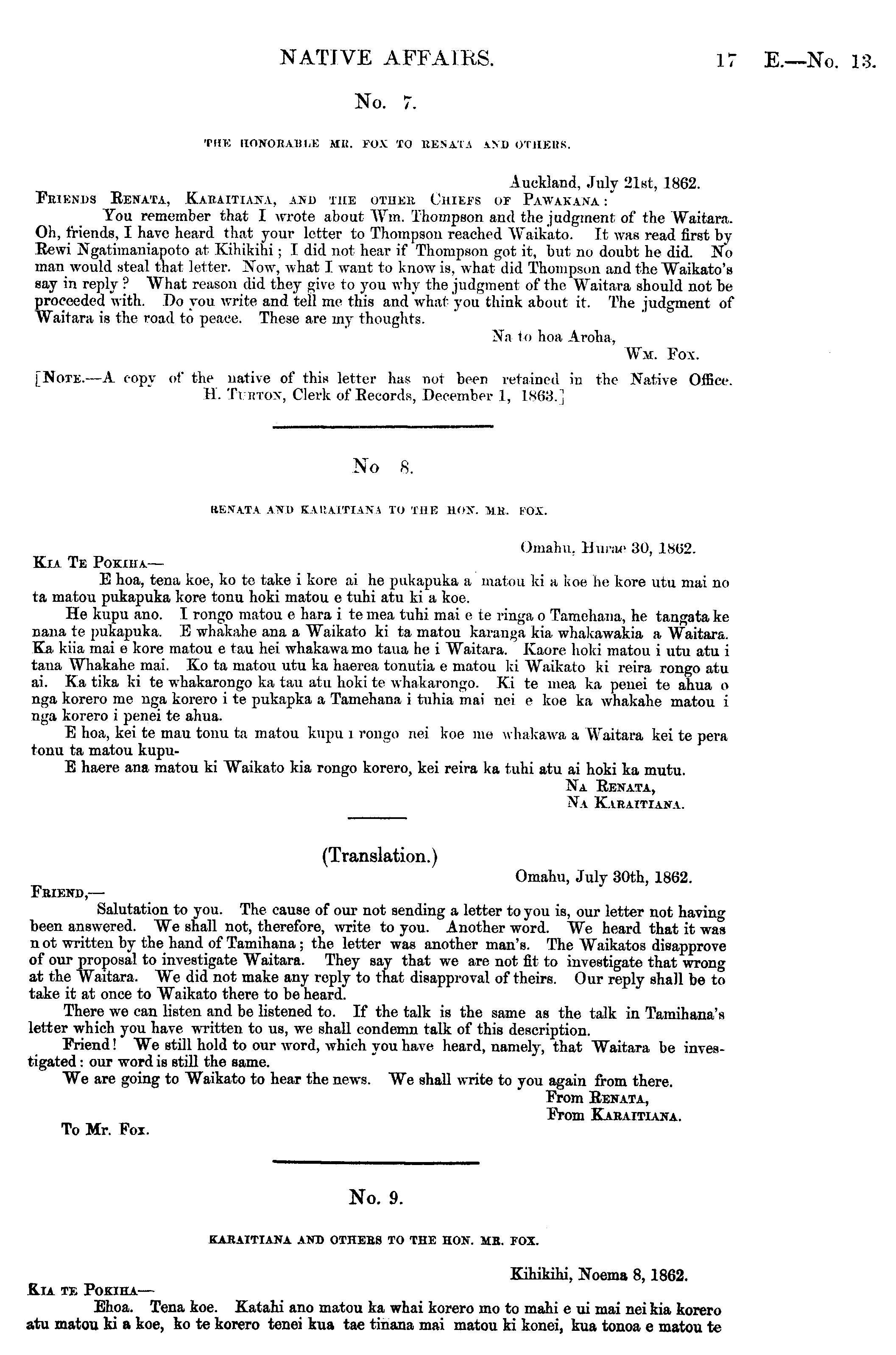 No. 9. KARAITIANA AND OTHEEB TO THE HON. MB. FOX. Kihikihi, Noema 8, 1862. K.IA TE POJOHA Ehoa. Tena koe. Katahi ano matou ka whai korero mo to mahi eui mai nei kia korero atu matou ki a koe, ko te korero tenei kua tae tinana mai matou ki konei, kua touoa c matou te