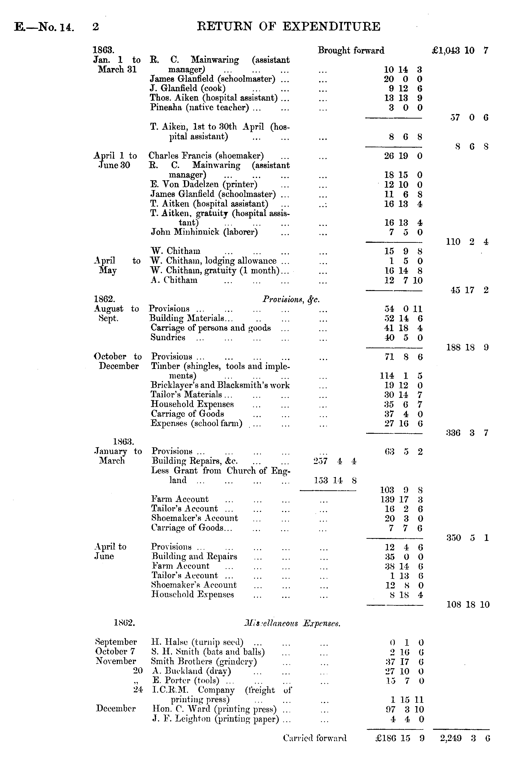 18C3. Brought forward £1,043 10 7 Jan. 1 to B. C. Mainwaring (assistant March 31 manager) ... ... ... ... 10 14 3 James Glanfield (schoolmaster) ... ... 20 0 0 J. Glanfield (cook) ... 9 12 6 Thos. Aikcn (hospital assistant) ... ... 13 13 9 Pineaha (native teacher) ... ... ... 300 ■ 57 0 6 T. Aikeii, 1st to 30th April (hospital assistant) ... ... ... .SOS ■ S 6 S April 1 to Charles Francis (shoemaker) ... ... 26 19 0 •Tune 30 R. C. Mainwaring (assistant manager) ... ... ... ... 18 15 0 E. Von Dadeuen (printer) ... ... 12 10 0 James Glanfield (schoolmaster) ... ... 11 6 8 T. Aitken (hospital assistant) ... ..-. 16 13 4 T. Aitken, gratuity (hospital assistant) ... 16 13 4 John Minhinuick (laborer) ... ... 7 5 0 110 2 4 W. Chitham ... 15 9 S Lpril to W. Chitham, lodging allowance ... ... 15 0 May "W. Chitham, gratuity (1 month)... ... 16 14 8 A. Chitham ... 12 7 10 45 17 2 1862. Provisions, $(c. August to Provisions ... ... ... ... ... 54 0 11 Sept. Building Materials ... 52 14 6 Carriage of persons and goods ... ... 41 18 4 Sundries ... 40 5 0 188 IS !) October to Provisions ... ... ... ... ... 71 S 6 December Timber (shingles, tools and implements) ... 114 1 5 Bricklayer's and Blacksmith's work ... 19 12 0 Tailor's Materials ... 30 14 7 Household Expenses ... ... ... 35 6 7 Carriage of Goods ... ... ... 37 4 0 Expenses (schoolfarm) ... ... ... 27 16 6 336 3 7 1863. January to Provisions ... ... ... ... ... 63 5 2 March Building Repairs, &c. ... ... 257 4 !■ Less Grant from Church of England 153 14 8 103 9 8 Farm Account ... 139 17 3 Tailor's Account ... 16 2 6 Shoemaker's Account ... ... ... 20 3 0 Carriage of Goods... ... ... ... 776 350 5 1 April to Provisions ... ... ... ... ... 12 4 6 June Building and Repairs ... ... ... 35 0 0 Farm Account ... ... ... ... 38 14 6 Tailor's Account ... ... ... ... 1 13 6 Shoemaker's Account ... ... ... 12 <S 0 Household Expenses ... ... ... S is 4 — 108 18 10 1SG2. .]/,'$ rUancous Sxpentet. September II. liaise (turnip seed) ... ... ... n 1 0 October 7 S. H. Smith (bats and balls) ... ... 2 16 6 November Smith Brothers (grindery) ... ... 37 17 6 20 A. Bucklaml (dray) ' ... 27 10 0 E. Porter (tools) " ... 15 7 0 21 I.C.RM. Company (freight of printing press) ... ... ... 1 15 11 December Hon. C. "Ward (printingpress) ... ... !)7 3 10 J. F. Leighton (printing paper) ... ... 4 4 0 Carried forward £186 15 9 2,249 3 6