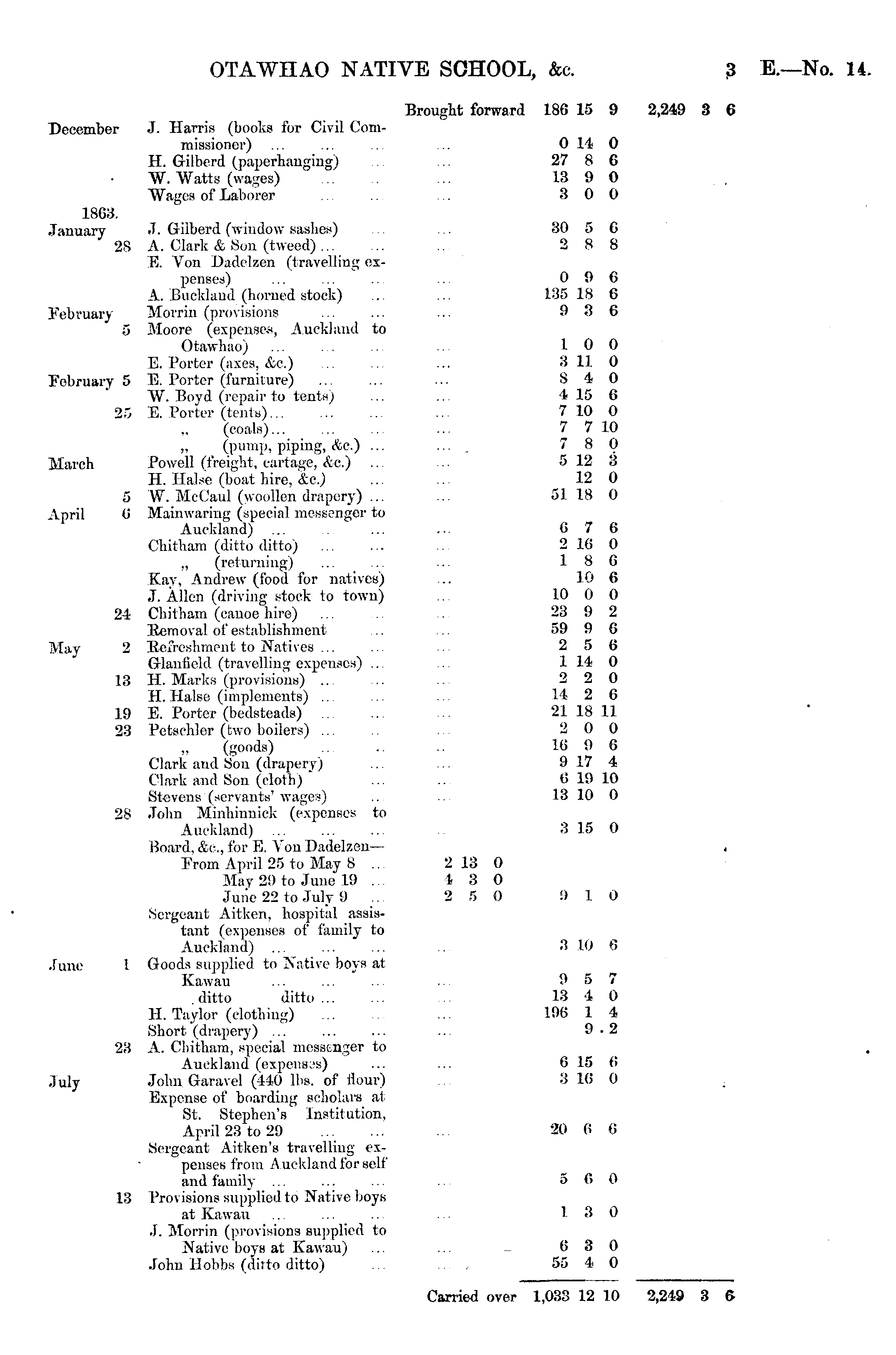 Brought forward 186 15 9 2,249 3 6 December J. Harris (books for Civil Commissioner) ... ... ... ... 0 14 0 H. Gilberd (paperhanging) ... ... 27 8 6 W. Watts (wages) ... ... 13 9 0 Wages of Laborer ... .. ... 300 1868. January «T. Giiberd (window sashes) ... ... 30 5 G 28 A. Clark & Son (tweed) ... 2 8 8 E. Von Dadelzen (travelling expenses) ... ... ... ... 0 9 6 A. Buckkud (horned stock) ... ... L85 18 6 February Morrin (provisions ... ... ... 936 5 Moore (expenses, Auckland to Otawhao) ... 1 0 0 B. Porter (axes, Ac.) ... 3 11 0 February 5 E. Porter (furniture) ... ... ... S40 W. Boyd (repair to tent*) ... ... 4 15 6 25 E. Porter (tents) ... 7 10 0 (coals) ... 7 7 10 ,. (pump, piping, Ac.) ... .... 7 8 0 March Powell (freight, cartage, Ac.) ... ... 5 12 3 H. HaLse (boat hire, &c.) ... ... 12 0 5 W. MeCaul (woollen drapery) ... ... 51 18 0 Vpril 0 Mainwaring (special messenger to Auckland) ... ... ... 6 7 6 Chitham (ditto ditto) 2 16 0 „ (returning) ... ... ... 186 Kay, Andrew (food for natives) ... 10 6 J. Allen (driving stock to town) ... 10 0 0 24 Chitham (canoehire) ... ... 23 9 2 Bemoval of establishment ... ... 59 9 6 May 2 Refreshment to Natives ... ... ... 256 Grlanfiekl (travelling expenses) ... ... 1 14 0 18 II. Marks (provisions) ... 220 H.Hake (implements) ... 14 2 6 1.9 E. Porter (bedsteads) ... 2118 11 23 Petschler (two boilers) ... 2 0 0 (goods) ... 16 9 6 Clark and Son (drapery) ... ... 9174 Clark and Son (doth) ... ... 6 19 10 Stevens (servants' wages) ... ... 13 10 0 28 John Minhinnick (expenses to Auckland) .. 3 15 0 Board, &c, for E. Von Dadelzen — - From April 25 to May 8 ... 2 13 0 May 29 to Juno 19 ... 13 0 Juiie 22 to July 9 ... 25 0 9 1 0 Sergeant Aitken. hospital assistant (expenses of family to Auckland) ... 8 10 6 June 1 Goods supplied to Native boys at Kawau ... 957 ditto ditto ... 13 4 0 H. Taylor (clothing) ... ... 196 1 4 Short'(drapery) ... 9-2 23 A. Chitham, special messenger to Auckland (expenses) ... ... 6 15 6 July John Garavel (440 His. of flour) ... 3 1(5 0 Expense of boarding scholars at St. Stephen's Institution, April 23 to 29 ... 20 6 6 Sergeant Aitken's travelling expenses from Auckland for self and family ... ... ... .. 560 13 Provisions supplied to Native boys at Kawau ... ... .. ... 130 J. Morrin (provisions supplied to Native boys at Kawau) ... ... 630 John Hobbs (ditto ditto) ... .... 55 4 0 Carried over 1,033 12 10 2,249 3 6