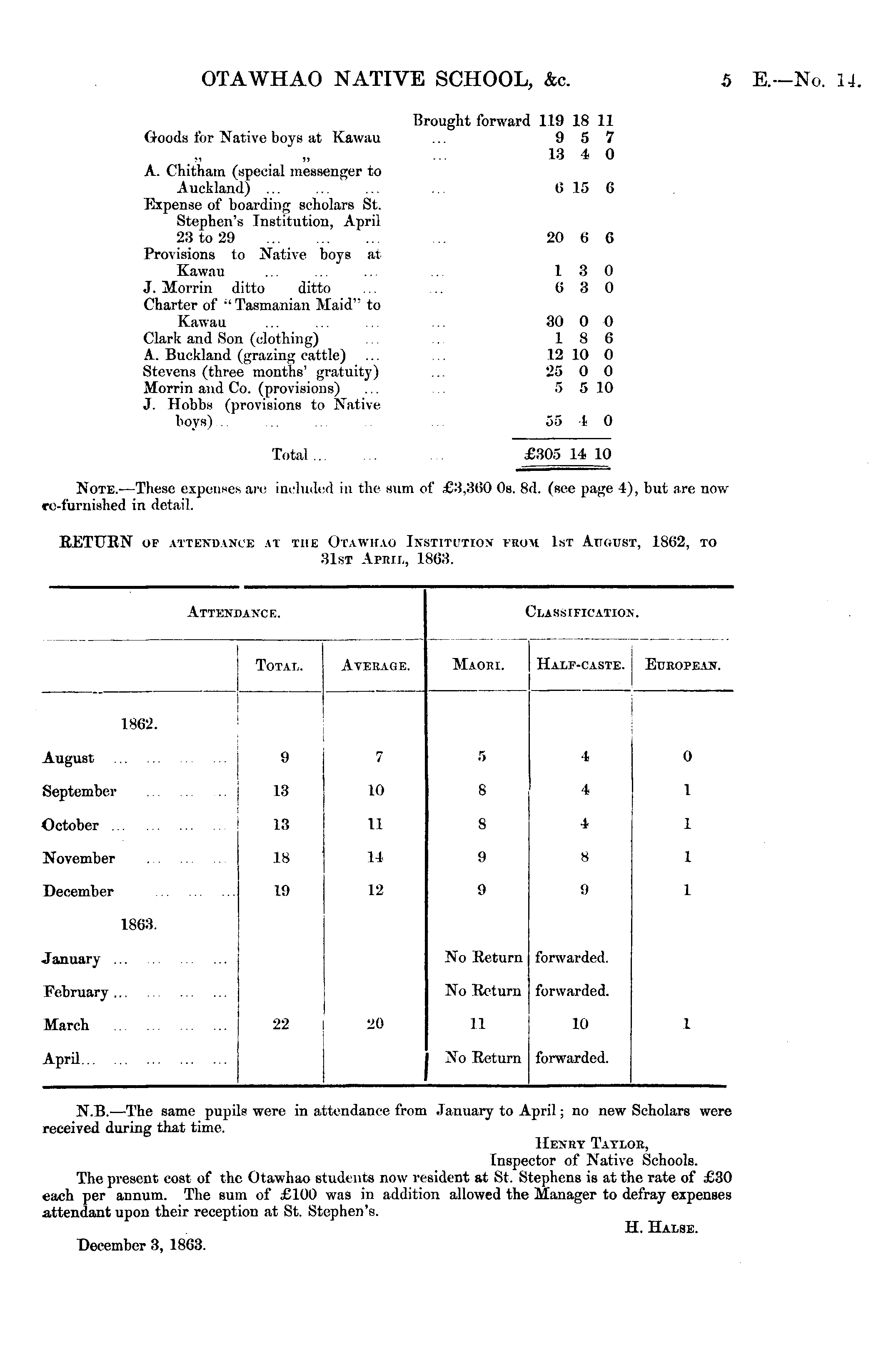 N.B. —The same pupils were in attendance from January to April; no new Scholars were received during that time. Henry Taylor, Inspector of Native Schools. The present cost of the Otawhao students now resident at St. Stephens is at the rate of £30 each per annum. The sum of £100 was in addition allowed the Manager to defray expenses attendant upon their reception at St. Stephen's. H. Halse. December 3, 1863.
