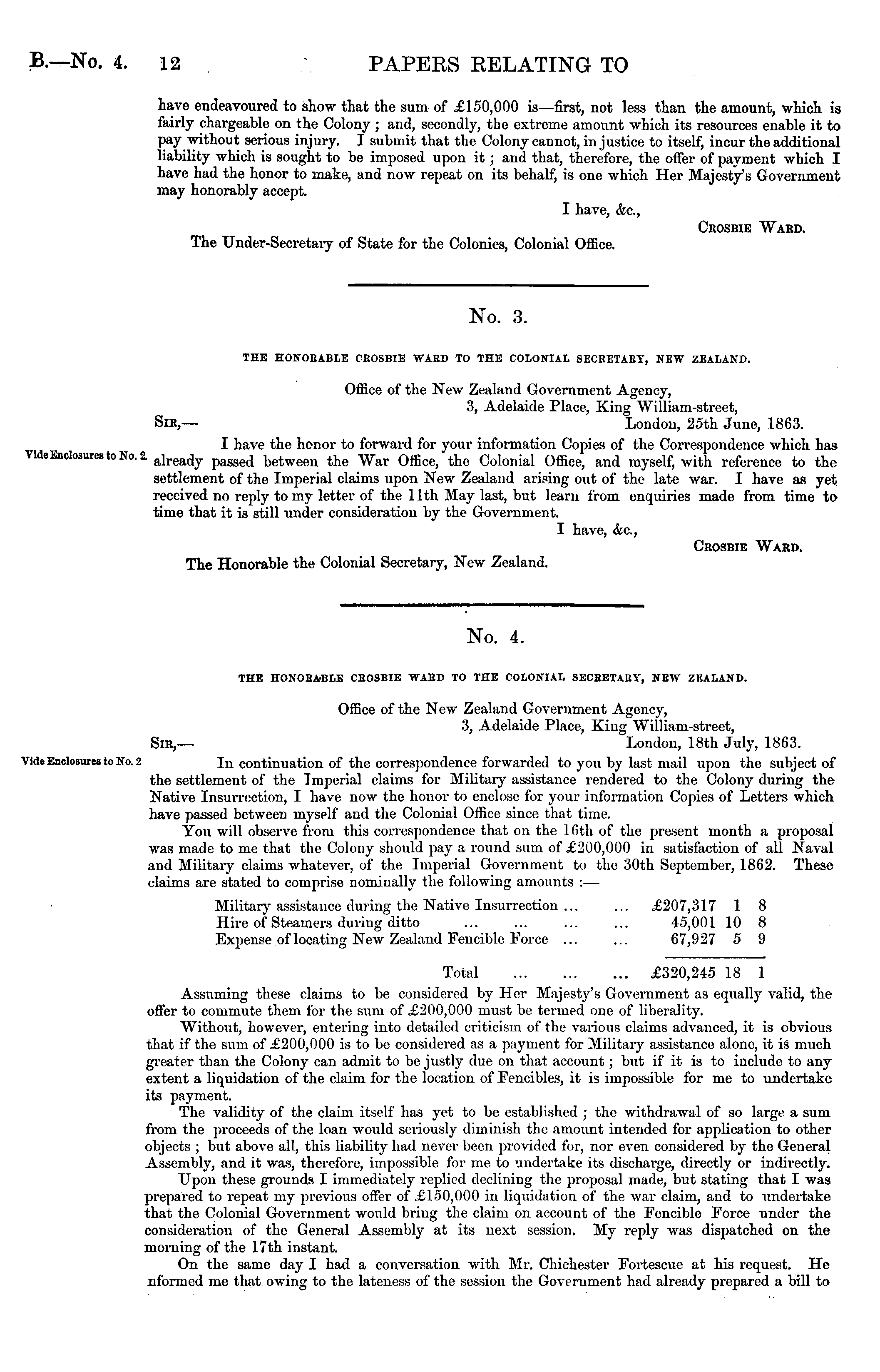 No. 4. THE HONORABLE CROSBIE WARD TO THE COLONIAL SECRETARY, NEW ZEALAND. Office of the New Zealand Government Agency, 3, Adelaide Place, King William-street, Sir,— London, 18th July, 1863. In continuation of the correspondence forwarded to you by last mail upon the subject of the settlement of the Imperial claims for Military assistance rendered to the Colony during the Native Insurrection, I have now the honor to enclose for your information Copies of Letters which have passed between myself and the Colonial Office since that time. You will observe from this correspondence that on the lfith of the present month a proposal was made to me that the Colony should pay a round sum of £200,000 in satisfaction of all Naval and Military claims whatever, of the Imperial Government to the 30th September, 1862. These claims are stated to comprise nominally the following amounts : — Military assistance during the Native Insurrection ... ... £207,317 1 8 Hire of Steamers during ditto 45,001 10 8 Expense of locating New Zealand Fenciblc Force ... ... 67,927 5 9 Total £320,245 18 1 Assuming these claims to be considered by Her Majesty's Government as equally valid, the offer to commute them for the sum of £200,000 must be termed one of liberality. Without, however, entering into detailed criticism of the various claims advanced, it is obvious that if the sum of £200,000 is to be considered as a payment for Military assistance alone, it is much greater than the Colony can admit to be justly due on that account; but if it is to include to any extent a liquidation of the claim for the location of Fencibles, it is impossible for me to undertake its payment. The validity of the claim itself has yet to be established ; the withdrawal of so large a sum from the proceeds of the loan would seriously diminish the amount intended for application to other objects ; but above all, this liability had never been provided for, nor even considered by the General Assembly, and it was, therefore, impossible for me to undertake its discharge, directly or indirectly. Upon these grounds I immediately replied declining the proposal made, but stating that I was prepared to repeat my previous offer of £150,000 in liquidation of the war claim, and to undertake that the Colonial Government would bring the claim on account of the Fencible Force under the consideration of the General Assembly at its next session. My reply was dispatched on the morning of the 17th instant. On the same day I had a conversation with Mr. Chichester Fortescue at his request. He nformed me that owing to the lateness of the session the Government had already prepared a bill to