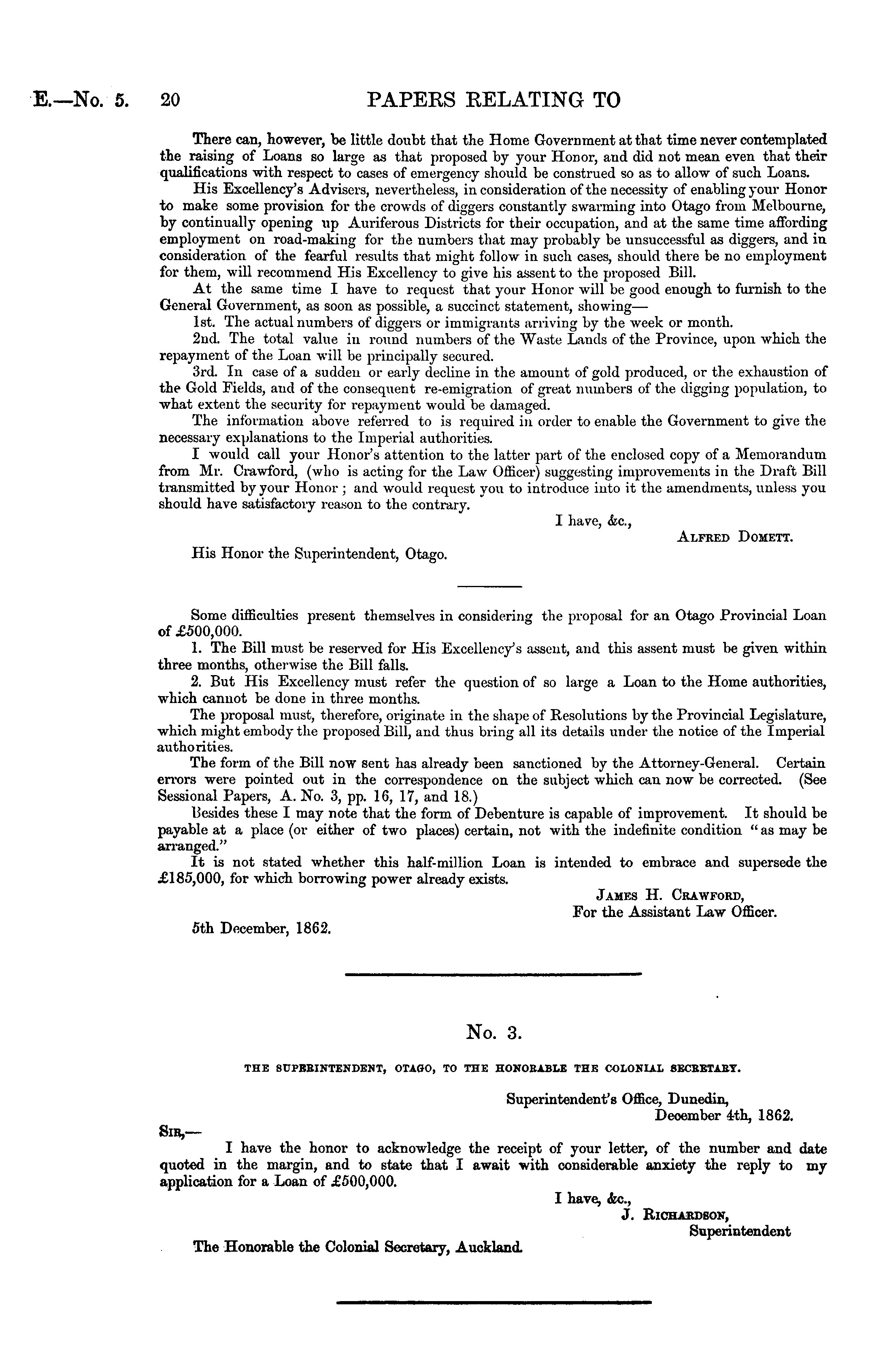 No. 3. THE SUPERINTENDENT, OTAGO, TO THE HONORABLE THE COLONIAL SECRETARY. Superintendent's Office, Dunedin, December 4th, 1862. Sir,— I have the honor to acknowledge the receipt of your letter, of the number and date quoted in the margin, and to state that I await with considerable anxiety the reply to my application for a Loan of £500,000. I have, <fec, J. Richardson, Superintendent The Honorable the Colonial Secretary, Auckland.