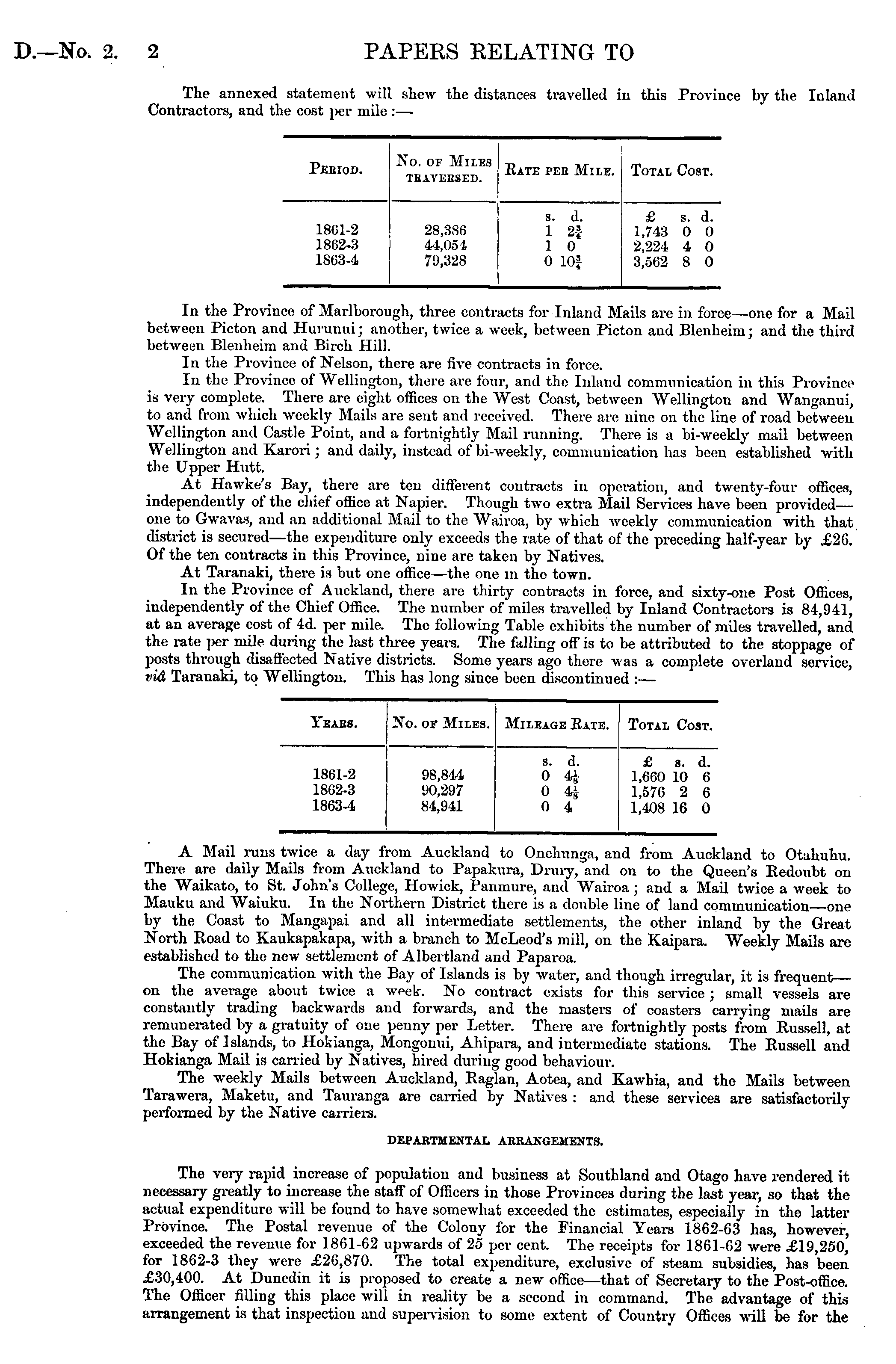 lii the Province of Marlborough, three contracts for Inland Mails are in force—one for a Mail between Picton and Hurunui; another, twice a week, between Picton and Blenheim; and the third between Blenheim and Birch Hill. In the Province of Nelson, there are five contracts in force. In the Province of Wellington, there are four, and tho Inland communication in this Province is very complete. There are eight offices on the West Coast, between Wellington and Wanganui, to and from which weekly Mails are sent and received. There are nine on the line of road between Wellington and Castle Point, and a fortnightly Mail running. There is a bi-weekly mail between Wellington and Karori; and daily, instead of bi-weekly, communication has been established with the Upper Hutt. At Hawke's Bay, there are ten different contracts in operation, and twenty-four offices, independently of the chief office at Napier. Though two extra Mail Services have been provided— one to Gwavas, and an additional Mail to the Wairoa, by which weekly communication with that district is secured—the expenditure only exceeds the rate of that of the preceding half-year by £2C. Of the ten contracts in this Province, nine are taken by Natives. At Taranaki, there is but one office—the one in the town. In the Province of Auckland, there are thirty contracts in force, and sixty-one Post Offices, independently of the Chief Office. The number of miles travelled by Inland Contractors is 84,941, at an average cost of 4d. per mile. The following Table exhibits the number of miles travelled, and the rate per mile during the last three years. The falling off is to be attributed to the stoppage of posts through disaffected Native districts. Some years ago there was a complete overland service, vid Taranaki, to Wellington. This has long since been discontinued :—