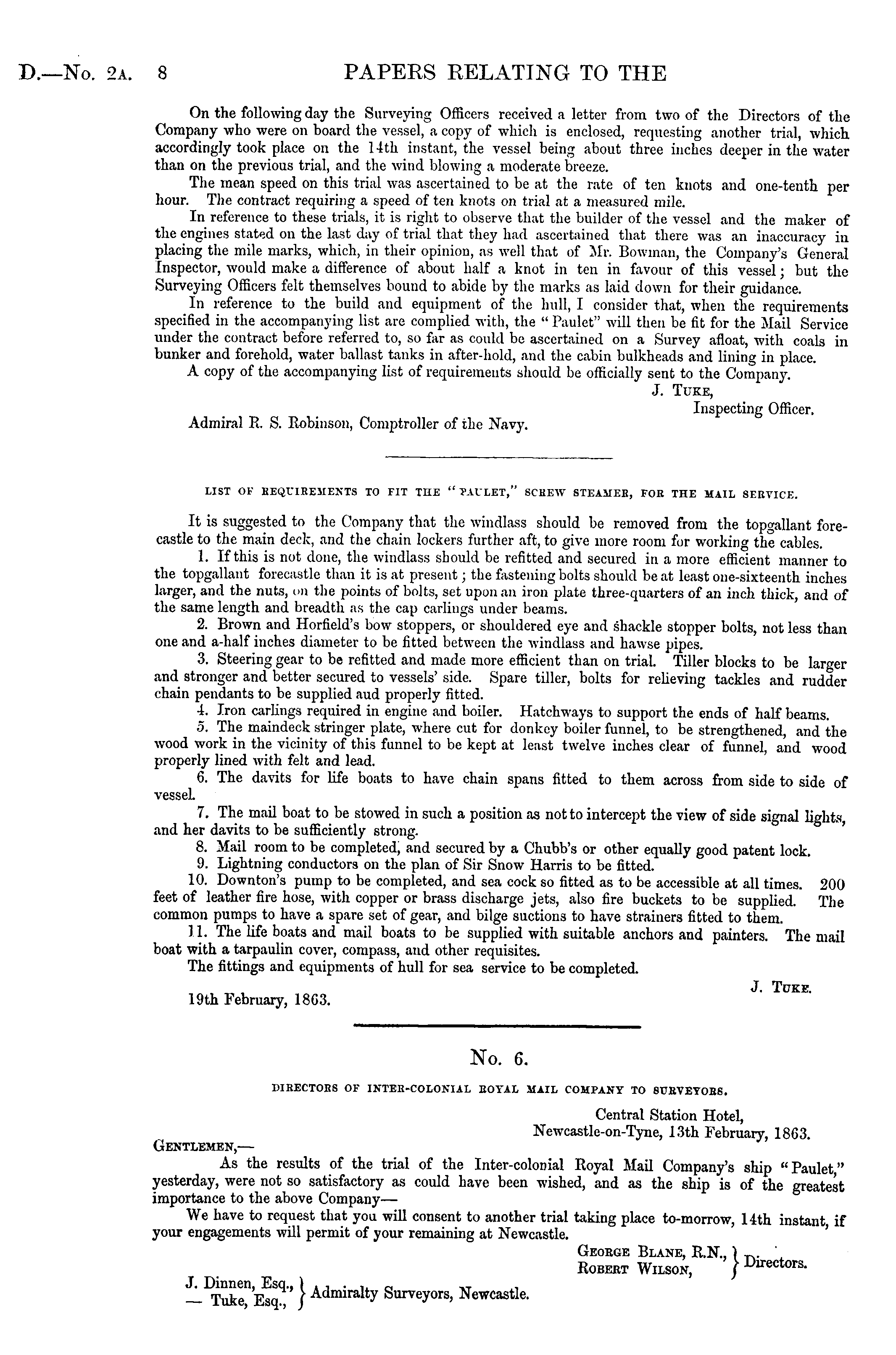 No. 6. DIRECTOES OF INTEB-COLOXIAL EOTAL MAIL COMPANY TO SUEVEYOBS. Central Station Hotel, Newcastle-on-Tyne, 13th February, 1863. Gentlemen, — As the results of the trial of the Inter-colonial Royal Mail Company's ship "Paulet," yesterday, were not so satisfactory as could have been wished, and as the ship is of the greatest importance to the above Company— We have to request that you will consent to another trial taking place to-morrow, 14th instant if your engagements will permit of your remaining at Newcastle. George Blane, R.N.,) _.. Robert Wilson, / Direct°rs. J. Dinnen, Esq., I .,■... ,, ,_ , rp u j £e j. > Admiralty Surveyors, Newcastle.