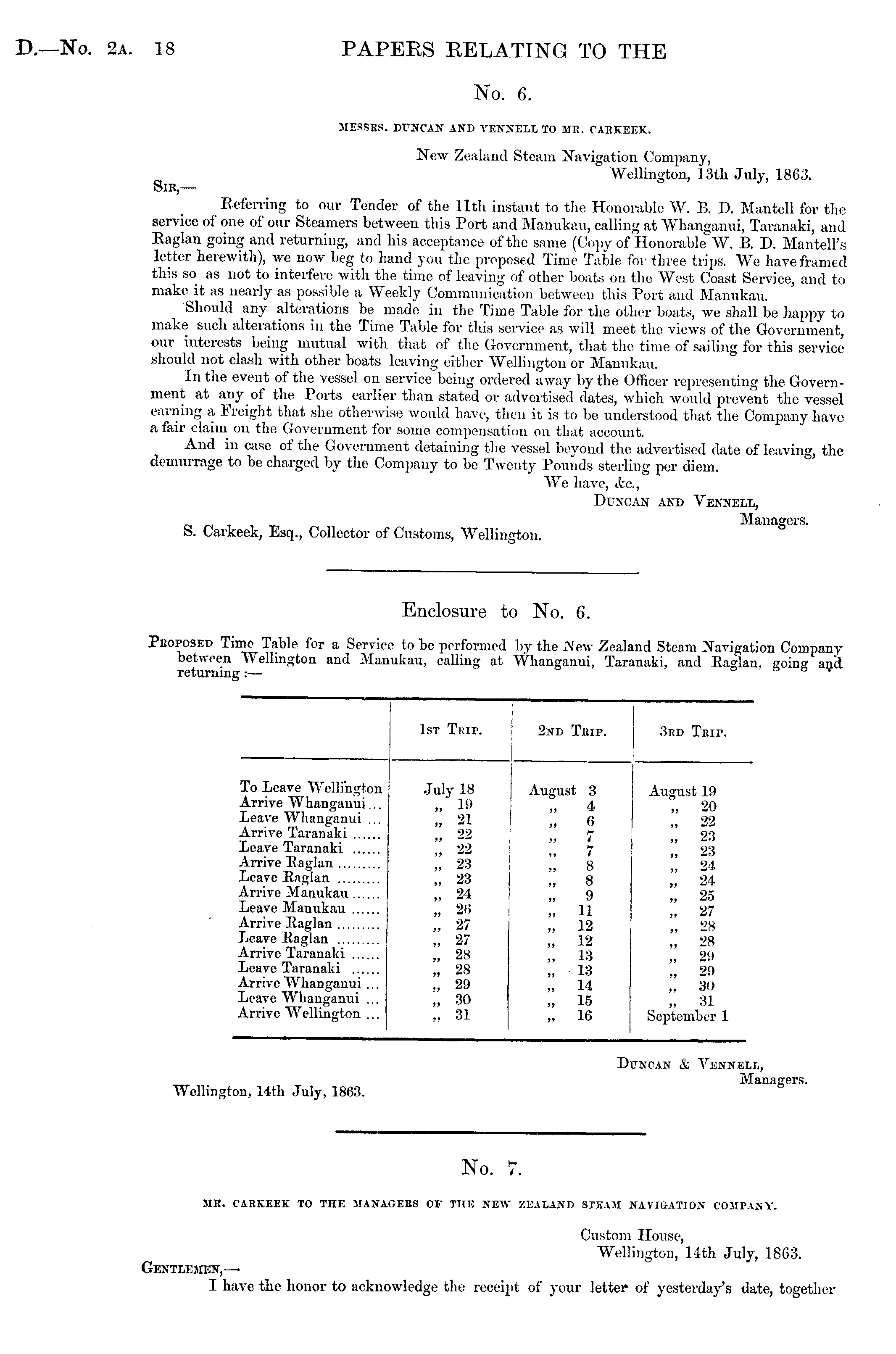 No. 6. MESSES. DUNCAN AND VENNELL TO ME. CAEKEEK. New Zealand Steam Navigation Company, Wellington, 13th July, 1863. Sib, — Keferring to our Tender of the 11th instant to the Honorable W. B. D. Mantell for the service of one of our Steamers between this Port and Manukau, calling at Whanganui, Taranaki, and Eaglan going and returning, and his acceptance of the same (Copy of Honorable W. B. D. Mantell's letter herewith), we now beg to hand you the proposed Time Table for three trips. We have framed this so as not to interfere with the time of leaving of other boats on the West Coast Service, and to make it as nearly as possible a Weekly Communication between this Port and Manukau. Should any alterations be made in the Time Table for the other boats, we shall be happy to make such alterations in the Time Table for this service as will meet the views of the Government, our interests being mutual with that of the Government, that the time of sailing for this service should not clash with other boats leaving either Wellington or Manukau. In the event of the vessel on service being ordered away by the Officer representing the Government at any of the Ports earlier than stated or advertised dates, which would prevent the vessel earning a Freight that she otherwise would have, then it is to be understood that the Company have a fair claim on the Government for some compensation on that account. And in case of the Government detaining the vessel beyond the advertised date of leaving the demurrage to be charged by the Company to be Twenty Pounds sterling per diem. We have, &c, Duncan and Yennell, Managers. S. Carkeek, Esq., Collector of Customs, Wellington.