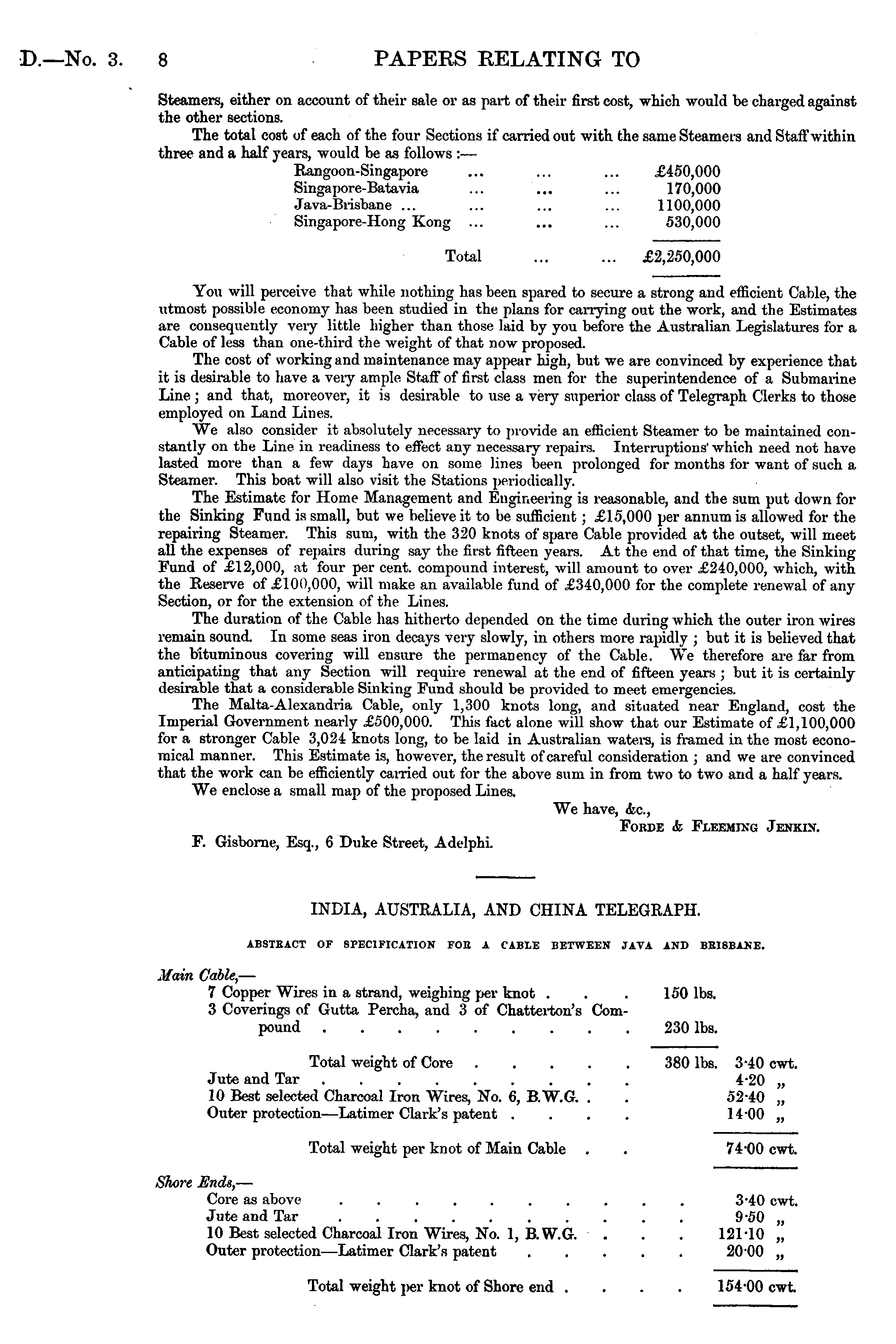 Steamers, either on account of their sale or as part of their first cost, which would be charged against the other sections. The total cost of each of the four Sections if carried out with the same Steamers and Staft'within three and a half years, would be as follows :— Rangoon-Singapore ... ... ... £450,000 Singapore-Batavia ... ... ... 170,000 Java-Brisbane ... ... ... ... 1100,000 Singapore-Hong Kong ... ... ... 530,000 Total ... ... £2,250,000 You will perceive that while nothing has been spared to secure a strong and efficient Cable, the utmost possible economy has been studied in the plans for carrying out the work, and the Estimates are consequently very little higher than those laid by you before the Australian Legislatures for a Cable of less than one-third the weight of that now proposed. The cost of working and maintenance may appear high, but we are convinced by experience that it is desirable to have a very ample Staff of first class men for the superintendence of a Submarine Line ; and that, moreover, it is desirable to use a very superior class of Telegraph Clerks to those employed on Land Lines. We also consider it absolutely necessary to provide an efficient Steamer to be maintained constantly on the Line in readiness to effect any necessary repairs. Interruptions which need not have lasted more than a few days have on some lines been prolonged for months for want of such a Steamer. This boat will also visit the Stations periodically. The Estimate for Home Management and Engineering is reasonable, and the sum put down for the Sinking Fund is small, but we believe it to be sufficient; £15,000 per annum is allowed for the repairing Steamer. This sum, with the 320 knots of spare Cable provided at the outset, will meet all the expenses of repairs during say the first fifteen years. At the end of that time, the Sinking Fund of £12,000, at four per cent, compound interest, will amount to over £240,000, which, with the Reserve of £100,000, will make an available fund of £340,000 for the complete renewal of any Section, or for the extension of the Lines. The duration of the Cable has hitherto depended on the time during which the outer iron wires remain sound. In some seas iron decays very slowly, in others more rapidly ; but it is believed that the bituminous covering will ensure the permanency of the Cable. We therefore are far from anticipating that any Section will require renewal at the end of fifteen years ; but it is certainly desirable that a considerable Sinking Fund should be provided to meet emergencies. The Malta-Alexandria Cable, only 1,300 knots long, and situated near England, cost the Imperial Government nearly £500,000. This fact alone will show that our Estimate of £1,100,000 for a stronger Cable 3,024 knots long, to be laid in Australian waters, is framed in the most economical manner. This Estimate is, however, the result of careful consideration ; and we are convinced that the work can be efficiently carried out for the above sum in from two to two and a half years. We enclose a small map of the proposed Lines. We have, <fec, Forde <fe Fleeming Jenkin. F. Gisbome, Esq., 6 Duke Street, Adelphi.