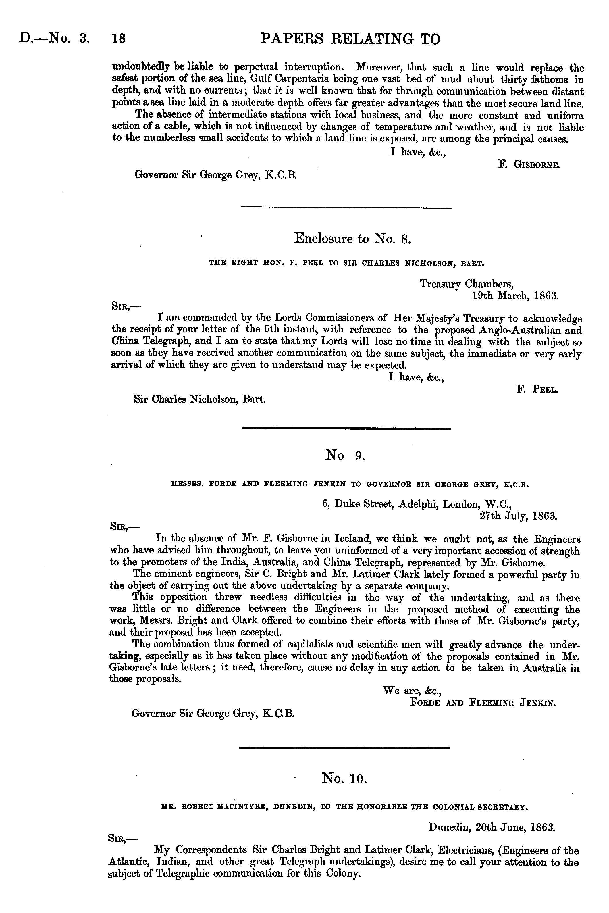 No 9. MESSRS. FOEDE AND FLEEMISG JENKIN TO GOVEENOE 8IE GEOBGE GKEY, K.C.B. 6, Duke Street, Adelphi, London, W.C., 27th July, 1863. Sir,— In the absence of Mr. F. Gisborne in Iceland, we think we ought not, as the Engineers who have advised him throughout, to leave you uninformed of a very important accession of strength to the pi-omoters of the India, Australia, and China Telegraph, represented by Mr. Gisbome. The eminent engineers, Sir C. Bright and Mr. Latimer Clark lately formed a powerful party in the object of carrying out the above undertaking by a separate company. This opposition threw needless difficulties in the way of the undertaking, and as there was little or no difference between the Engineers in the proposed method of executing the work, Messrs. Bright and Clark offered to combine their efforts with those of Mr. Gisborne's party, and their proposal has been accepted. The combination thus formed of capitalists and scientific men will greatly advance the undertaking, especially as it has taken place without any modification of the proposals contained in Mr. Gisborne's late letters ; it need, therefore, cause no delay in any action to be taken in Australia in those proposals. We are, <fec, FORDE AND FLEEMING JENKIN. Governor Sir George Grey, K.C.B.