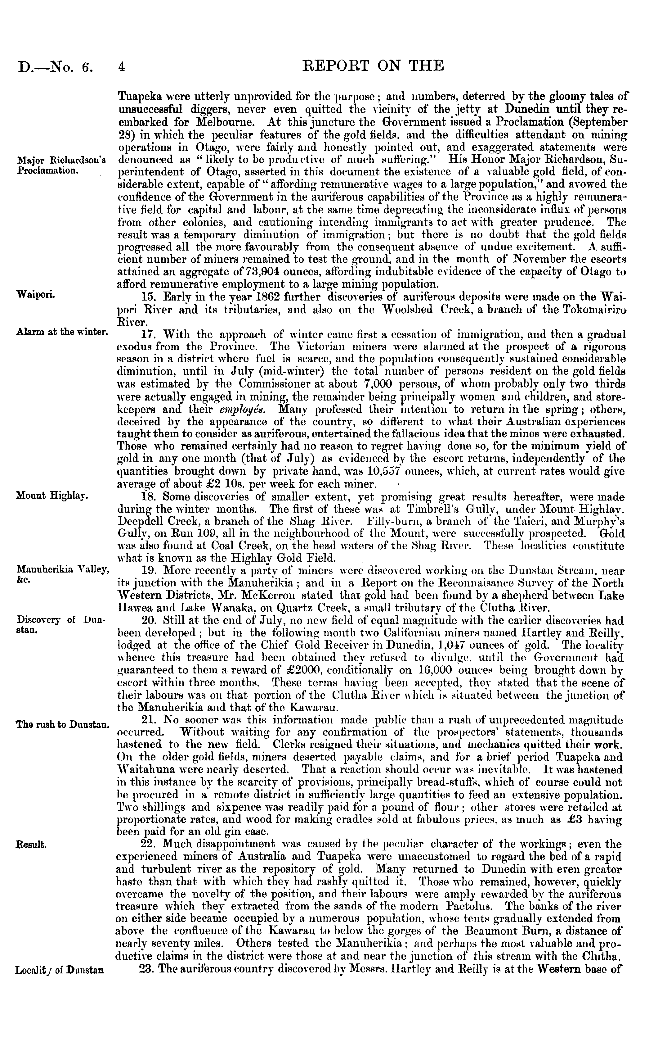 Tuapeka were utterly unprovided for the purpose ; and numbers, deterred by the gloomy tales of unsuccessful diggers, never even quitted the vicinity of the jetty at Dunedin until they reembarked for Melbourne. At this juncture the Government issued a Proclamation (September 28) in which the peculiar features of the gold fields, and the difficulties attendant on mining operations in Otago, were fairly and honestly pointed out, and exaggerated statements were denounced as " likely to be productive of much suffering." Hi» Honor Major ltichardson. Superintendent of Otago, asserted in this document the existence of a valuable gold field, of considerable extent, capable of " affording remunerative wages to a large population," and avowed the confidence of the Government in the auriferous capabilities of the Province as a highly remunerative field for capital and labour, at the same time deprecating the inconsiderate influx of persons from other colonies, and cautioning intending immigrants to act with greater prudence. The result was a temporary diminution of immigration ; but there is no doubt that the gold fields progressed all the more favourably from the consequent absence of undue excitement. A sufficient number of miners remained to test the ground, and in the month of November the escorts attained an aggregate of 73,904 ounces, affording indubitable evidence of the capacity of Otago to afford remunerative employment to a large mining population. 15. Early in the year 1XG2 further discoveries of auriferous deposits were made on the Waipori River and its tributaries, and also on the Woolshed Creek, a branch of the Tokomairiro River. 17. With the approach of winter came first a cessation of immigration, and then a gradual exodus from the Province. The Victorian miners were alarmed at the prospect of a rigorous season in a district where fuel is scarce, and the population consequently sustained considerable diminution, until in July (mid-winter) the total number of persons resident on the gold fields wns estimated by the Commissioner at about 7,000 persons, of whom probably only two thirds were actually engaged in mining, the remainder being principally women and children, and storekeepers and their employes. Many professed their mteTition to return in the spring ; others, deceived by the appearance of the country, so different to what their Australian experiences taught them to consider as auriferous, entertained the fallacious idea that the mines were exhausted. Those who remained certainly had no reason to regret having done so, for the minimum yield of gold in any one month (that of July) as evidenced by the escort returns, independently of the quantities brought down by private hand, was 10.557 ounces, which, at current rates would give average of about £2 10s. per week for each miner. 18. Some discoveries of smaller extent, yet promising great results hereafter, were made during the winter months. The first of these was at Timbrell's Gully, under Mount Highlay. Deepdell Creek, a branch of the Shag Kiver. Filly-burn, a branch of the Taieri, and Murphy's Gully, on Run 100. all in the neighbourhood of the Mount, were successfully prospected. Gold was also found at Coal Creek, on the head waters of the Shag River. These localities constitute what is known as the, Highlay Gold Field. 19. More recently a party of miners were discovered working on the Dunstan Stream, near its junction with the Manuherikia; and in a Report on the Beconnaisance Survey of the North Western Districts, Mr. McKerron stated that gold had been found by a shepherd between Lake Hawea and Lake Wanaka, on Quartz Creek, a small tributary of the Clutha River. 20. Still at the end of July, no new field of equal magnitude with the eai-lier discoveries bad been developed: but in the following month two Californian miners named Hartley and Beilly, lodged at the office of the Chief Gold Receiver in Dunedin, 1,017 ounces of gold. The locality whence this treasure had been obtained they refused to divulge, until the Government had guaranteed to them a reward of £2000, conditionally on 10,000 ounces being brought down by escort within three months. These terms having been accepted, they stated that the scene of their labours was on that portion of the Clutha Kiver which is situated between the junction of the Manuherikia and that of the Kawarau. 21. Is'o nooner was this information made public than a rush of unprecedented magnitude occurred. Without waiting for any confirmation of the prospectors' statements, thousands hastened to the new field. Clerks resigned their situations, and mechanics quitted their work. On the older gold fields, miners deserted payable claims, and for a brief period Tuapeka and Waitahuna were nearly deserted. That a reaction should occur was inevitable. It was hastened in this instance by the scarcity of provisions, principally bread-stuffs, which of course could not be procured in a remote district in sufficiently large quantities to feed an extensive population. Two shillings and sixpence was readily paid for a pound of flour ; other stores were retailed at proportionate rates, and wood for making cradles sold at fabulous prices, as much as £3 having been paid for an old gin case. 22. Much disappointment was caused by the peculiar character of the workings; even the experienced miners of Australia and Tuapeka were unaccustomed to regard the bed of a rapid and turbulent river as the repository of gold. Many returned to Dunedin with even greater haste than that with which they had rashly quitted it. Those who remained, however, quickly overcame the novelty of the position, and their labours were amply rewarded by the auriferous treasure which they extracted from the sands of the modern Pactolus. The banks of the river on either side became occupied by a numerous population, whose tents gradually extended from above the confluence of the Kawarau to below the gorges of the Beaumont Burn, a distance of 
