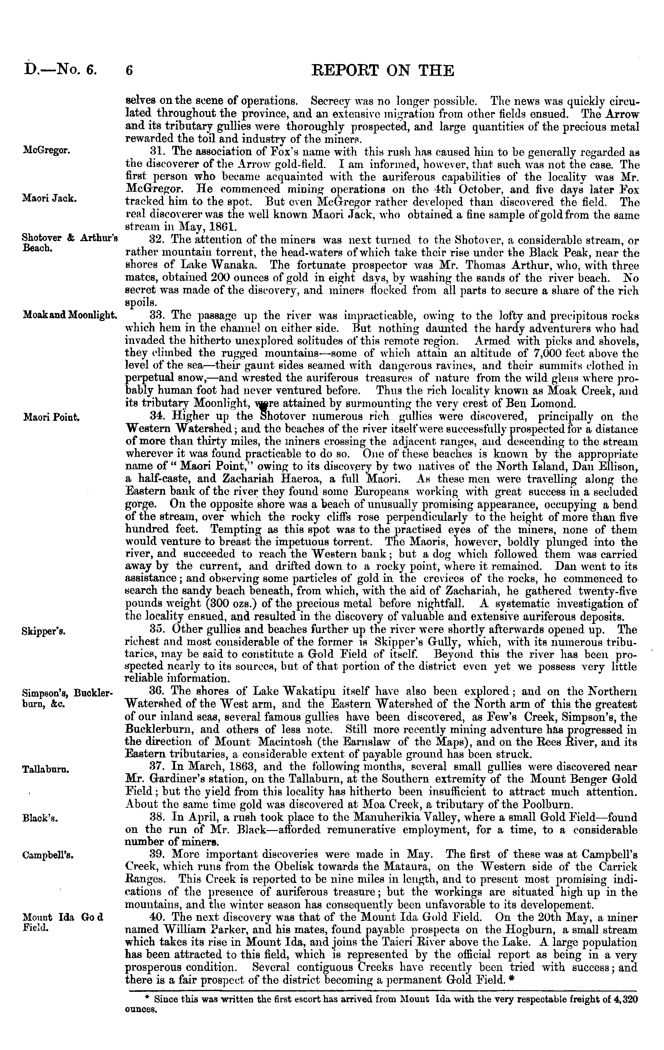 selves on the scene of operations. Secrecy was no longer possible. The news was quickly circulated throughout the province, and an extensive migration from other fields ensued. The Arrow and its tributary gullies were thoroughly prospected, and large quantities of the precious metal rewarded the toil and industry of the miners. 81. The association of Fox's name with this rush has caused him to be generally regarded as tiie discoverer of the Arrow gold-field. I am informed, however, that such was not the case. The first person who became acquainted with the auriferous capabilities of the localitv was Mr. McGregor. He commenced mining operations on the 4th October, and five days later Fox tracked him to the spot. But even McGregor rather developed than discovered the field. The real discoverer was the well known Maori .Tack, who obtained a fine sample of gold from the same stream in May, 18(51. 32. The attention of the miners was next turned to the Shotover, a considerable stream, or rather mountain torrent, the head-waters of which take their rise under the Black Peak, near the shores of Lake Wanaka. The fortunate prospector was Mr. Thomas Arthur, who, with three mates, obtained 200 ounces of gold in eight days, by washing the sands of the river beach. No secret was made of the discovery, and miners nocked from all parts to secure a share of the rich spoils. 33. The passage up the river was impracticable, owing to the lofty and precipitous rocks which hem in the channel on either side. But nothing daunted the hardy adventurers who had invaded the hitherto unexplored solitudes of this remote region. Armed with picks and shovels, they climbed the rugged mountains —some of which attain an altitude of 7,000 feet above the level of the sea —their gauiii sides seamed with dangerous ravines, and their summits clothed in perpetual snow, —and wrested the auriferous treasures of nature from the wild glens where probably human foot had never ventured before. Thus the rich locality known as Moak Creek, and its tributary Moonlight, ware attained by surmounting ihe very crest of Ben Lomond. 31. Higher up the Shotover numerous rich gullies were discovered, principally on the Western Watershed; and the beaches of the river itself were successfully prospected for a distance of more than thirty miles, the miners crossing the adjacent ranges, and descending to the stream wherever it was found practicable to do so. One of these beaches is known by the appropriate name of " Maori Point," owing to its discovery by two natives of the North Island, Dan Ellison, a half-caste, and Zachariah Haeroa, a full Maori. As these men were travelling along the Eastern bank of the river they found some Europeans working with great success in a secluded gorge. On the opposite shore was a beach of unusually promising appearance, occupying a bend of the stream, over which the rocky cliffs rose perpendicularly to the height of more than five hundred feet. Tempting as this spot was to the practised eves of the miners, none of them would venture to breast the impetuous torrent. The Maoris, however, boldly plunged into the river, and succeeded to reach the Western bank; but a dog which followed them was carried away by the current, and drifted down to a rocky point, where it remained. Dan went to its assistance ; and observing some particles of gold in the crevices of the rocks, he commenced to search the sandy beach beneath, from which, with the aid of Zachariah, he gathered twenty-five pounds weight (300 ozs.) of the precious metal before nightfall. A systematic investigation of the locality ensued, and resulted in the discovery of valuable aud extensive auriferous deposits. 'So. Other gullies and beaches further up the river were shortly afterwards ojieued up. The richest and most considerable of the former is Skipper"s Gully, which, with its numerous tribularies, may be said to constitute a Gold Field of itself. Beyond this the river has been prospected nearly to its sources, but of that portion of the district even yet we possess very little reliable information. 36. The shores of Lake Wakatipu itself have also been explored ; and on the Northern Watershed of the West arm, and the Eastern Watershed of the North arm of this the greatest of our inland seas, several famous gullies have been discovered, as Few's Creek, Simpson's, the Bucklerburn, and others of less note. Still more recently mining adventure has progressed in the direction of Mount Macintosh (the Earnslaw of the Maps), aud on the Rees River, and its Eastern tributaries, a. considerable extent of payable ground has been struck. 37. In March, 1863, and the following months, several small gullies were discovered near Mr. Gardiner's station, on the Tallaburn, at the Southern extremity of the Mount Benger Gold Field ; but the yield from this locality has hitherto been insufficient to attract much attention. About the same time gold was discovered at Moa Creek, a tributary of the Poolburn. 38. In April, a rush took place to the Manuherikia Valley, where a small Gold Field —found on the run of Mr. Black—afforded remunerative employment, for a time, to a considerable number of miners. 39. More important discoveries were made in May. The first of these was at Campbell's Creek, which runs from the Obelisk towards the Mataura, on the Western side of the Cat-rick Ranges. This Creek is reported to be nine miles in length, and to present most promising indications of the presence of auriferous treasure; but the workings are situated high up in the mountains, and the winter season has consequently been unfavorable to its developement. 40. The next discovery was that of the Mount Ida Gold Field. On the 20th May, a miner named William Parker, and his mates, found payable prospects on the Hogburn, a small stream which takes its rise in Mount Ida, and joins the Taieri River above the Lake. A large population has been attracted to this field, which is represented by the offi