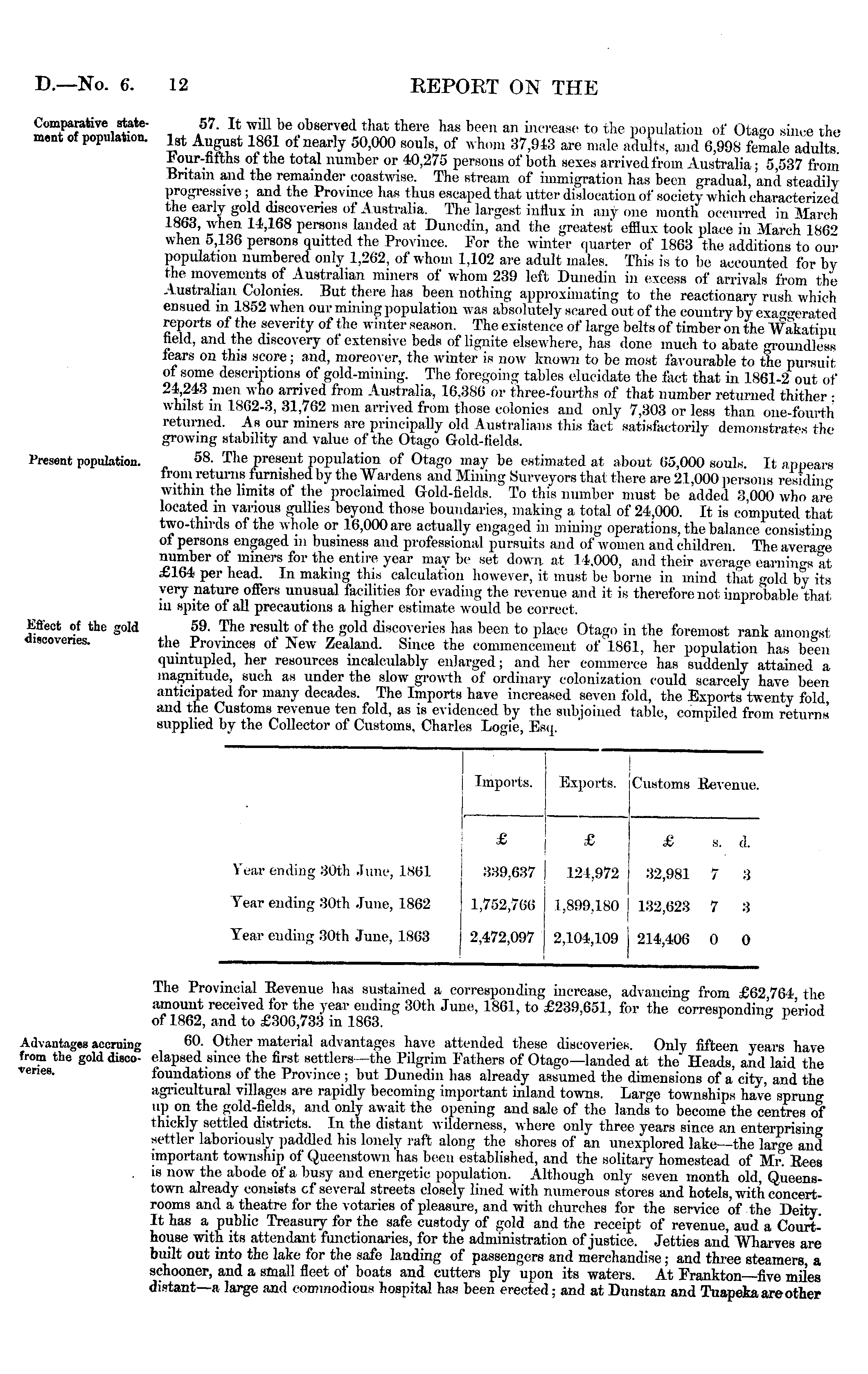 Imports. Exports. Customs Revenue. Fear ending 30th June, 1861 £ £ £ s. d. 339,637 124,972 82,081 7 3 Year ending 30th June, 1862 1,762,768 1,899,180 132,(523 7 3 Year ending 30th June, 1868 2,472,097 2,104,109 214,406 0 0