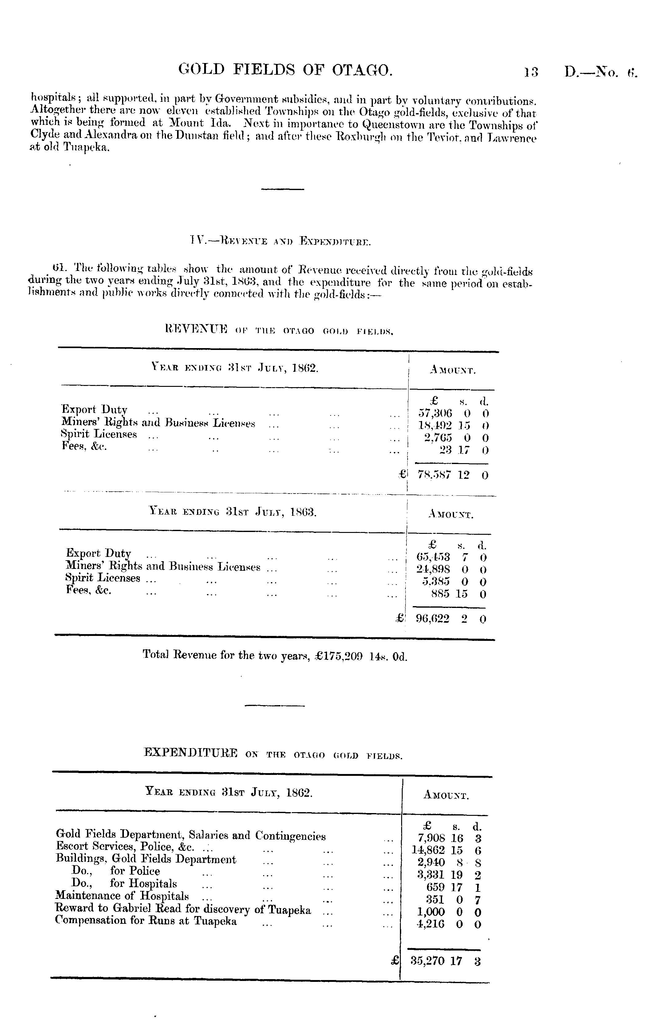 Ykvr kndi.vo 31st Julv, 1802. Amount. Export Duty Miners' Eights and Business Licenses ... Spirit Licenses ... Fees, &c. £ s. <1. 57,306 0 0 ... 18,492 15 0 2,765 0 0 23 17 0 £ 78.587 12 0 i Year ending 31st Juir, 1803. A MOUNT. Export Duty ... Miners' Rights and Business Licenses Spirit Licenses ... Pees, &c. £ a. d. 65,453 7 0 2i,89S 0 0 5.385 0 0 885 15 0 £ 96,022 2 0 Total Revenue for the two years, £175,209 14s. Od. EXPENDITURE on the otago gold fields. Yeah, ending 31st July, 1862. Amount. Gold Fields Department, Salaries and Contingencies Escort Services, Police, <fcc. .;. Buildings, Gold Fields Department Do., for Police Do., for Hospitals Maintenance of Hospitals ... Reward to Gabriel Read for discovery of Tuapeka Compensation for Runs at Tuapeka £ s. 7,908 16 14,862 15 2,940 8 3,331 19 659 17 351 0 1,000 0 4,216 0 d. 3 6 • S 2 1 7 0 0 £ 35,270 17 :j
