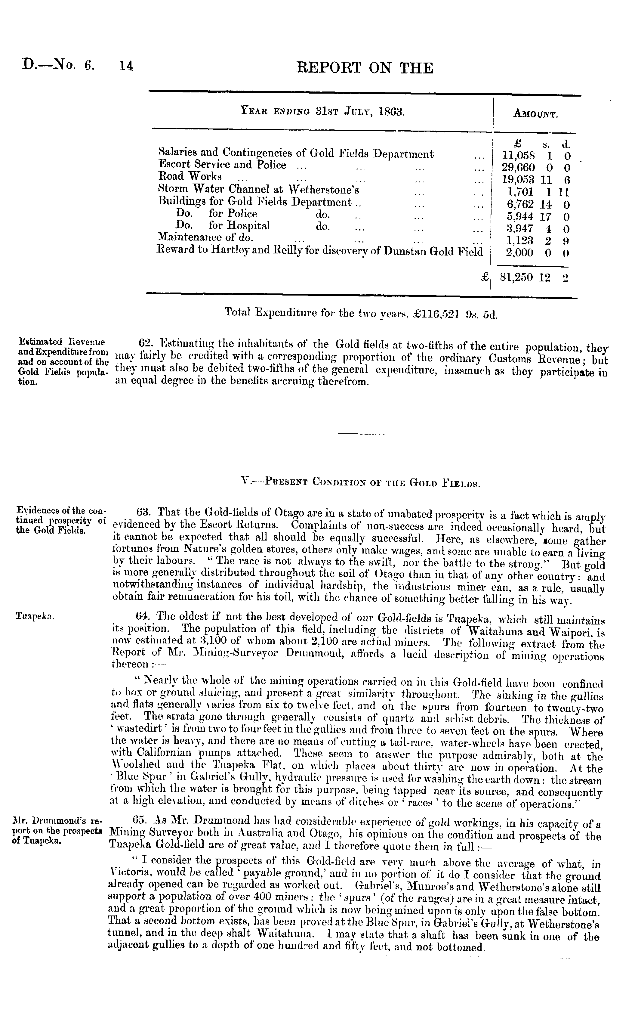 Ykah ending 31st July, 1863. Amount. .Salaries and Contingencies of Gold Fields Department Escort Service and Police ... Eoad Works Storm "Water Channel at Wetherstone's Buildings for G-old Fields Department... Do. for Police do. Do. for Hospital do. Maintenance of do. Eeward to Hartley and Reilly for discovery of Dunstan Gold Field £ s. d. 11,O5.S 1 0 29.660 0 0 19.053 11 6 1,701 I 11 6,762 14 0 5,944 17 0 3.947 4 0 1,123 2 9 2,000 0 0 £ 81,250 12 •> Total Expenditure for the two years, £116,52] 9s. 5d.