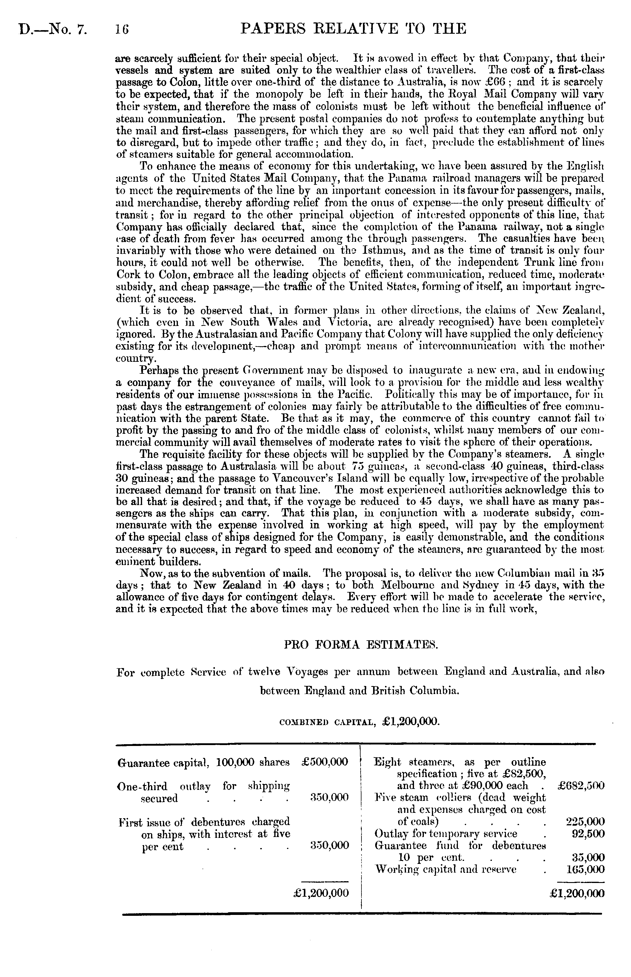 are scarcely sufficient for their special object. It is avowed in effect by that Company, that their vessels and system are suited only to the wealthier class of t revellers. The cost of a first-class passage to Colon, little over one-third of the distance to Australia, is now £66 ; and it is scarcely to be expected, that if the monopoly be left in their hands, the Royal Mail Company will vary their system, and therefore the mass of colonists must be left without the beneficial influence of steam communication. The present postal companies do not profess to contemplate anything but the mail and first-class passengers, for which they are so well paid that they can afford not only to disregard, but to impede other traffic ; and they do, in (act, preclude the establishment of lines of steamers suitable for general accommodation. To enhance the means of economy for this undertaking, we have been assured by the English agents of the United States Mail Company, that the Panama railroad managers will be prepared to meet the requirements of the line by an important concession in its favour for passengers, mnils. and merchandise, thereby affording relief from the onus of expense —the only present difficulty of transit ; for in regard to the other principal objection of interested opponents of this line, that Company has officially declared that, since the completion of the Panama railway, not a single case of death from fever has occurred among the through passengers. The casualties have been invariably with those who were detained on the Isthmus, and as the time of transit is only four hours, it could not well bo otherwise. The benefits, then, of the independent Trunk line from Cork to Colon, embrace all the leading objects of etficient communication, reduced time, moderate subsidy, and che;ip passage,- the traffic of the United .States, forming of itself, an important ingredient of success. It is to be observed that, in former plans in other directions, the claims of New Zealand, (which even in New South Wales and Victoria, are already recognised) have been completely ignored. By the Aust ralasian and Pacific Company that Colony will have supplied the only deficiency existing for its development, —cheap and prompt means of intercommunication with the mother country. Perhaps the present Government may be disposed lo inaugurate a new era, and in endowing a company for the conveyance of mails, will look to a provision for the middle and less wealthy residents of our immense possessions in the Pacific. Politically this may be of importance, tin1 in past days the estrangement of colonies may fairly be attributable to the difficulties of free communication with the parent State. Be that as it may, the commerce of this country cannot fail to profit by the passing to and fro of the middle class of colonists, whilst many members of our commercial community will avail themselves of moderate rates to visit the sphere of their operations. The requisite facility for these objects will be supplied by the Company's steamers. A single first-class passage to Australasia will be about 75 guineas, a second-class 40 guineas, third-class 30 guineas; and the passage to Vancouver's Island will be equally low, irrespective of the probable increased demand for transit on that line. The most experienced authorities acknowledge this to be all that is desired; and that, if the voyage be reduced to 45 days, we shall have as many passengers as the ships can carry. That this plan, in conjunction with a moderate subsidy, commensurate with the expense involved in working at high speed, will pay by the employment of the special class of ships designed for the Company, is easily demonstrable, and the conditions necessary to success, in regard to speed and economy of the steamers, ore guaranteed by the most eminent builders. Now, as to the subvention of mails. The proposal is, to deliver the new Columbian mail in 35 days ; that to New Zealand in 40 days ; to both Melbourne and Sydney in 45 days, with the allowance of five days for contingent delays. Every effort will be made to accelerate the service. and it is expected that the above times may be reduced when the line is in full work, PRO FORMA ESTIMATES. For complete Service of twelve Voyages per annum between England and Australia, and also between England and British Columbia.